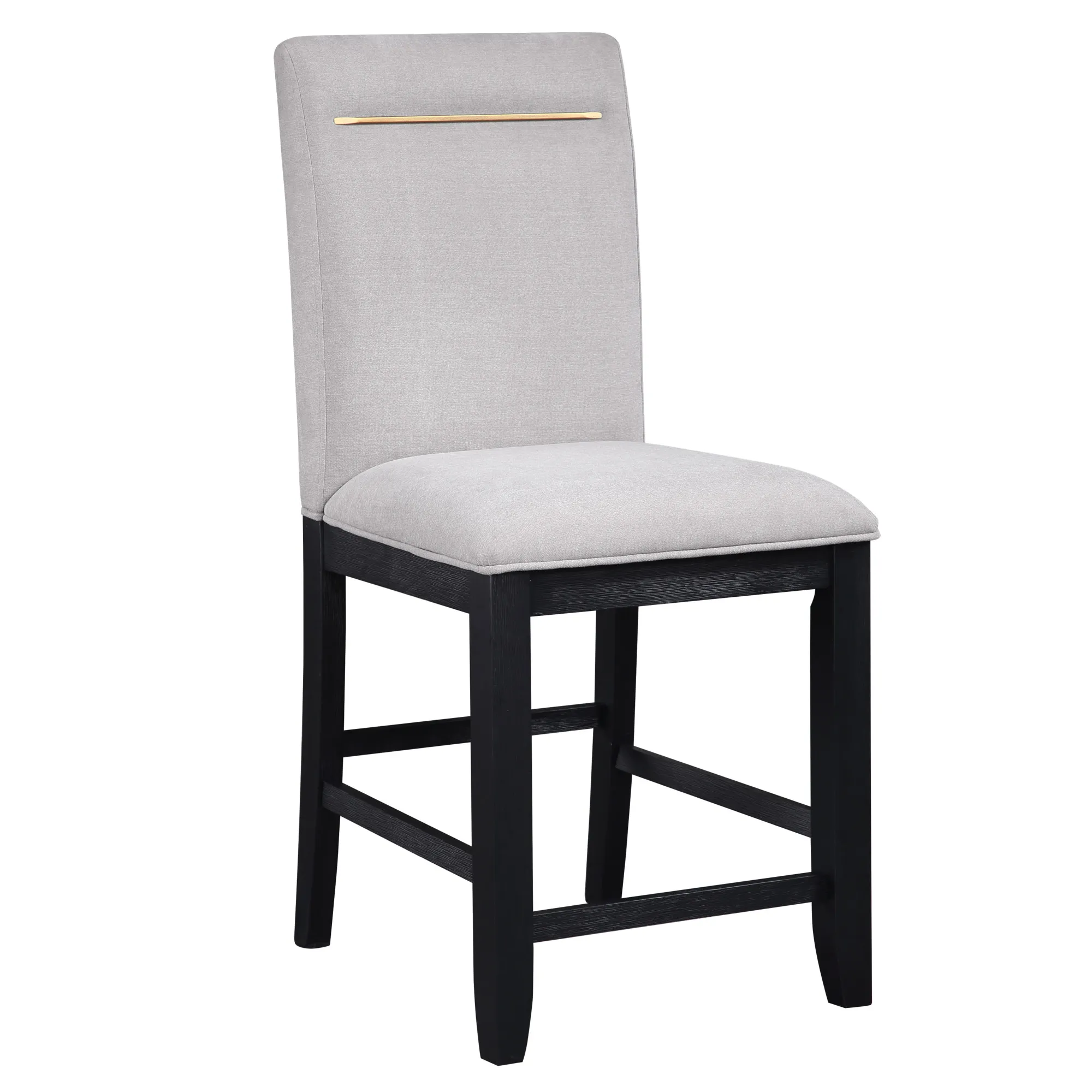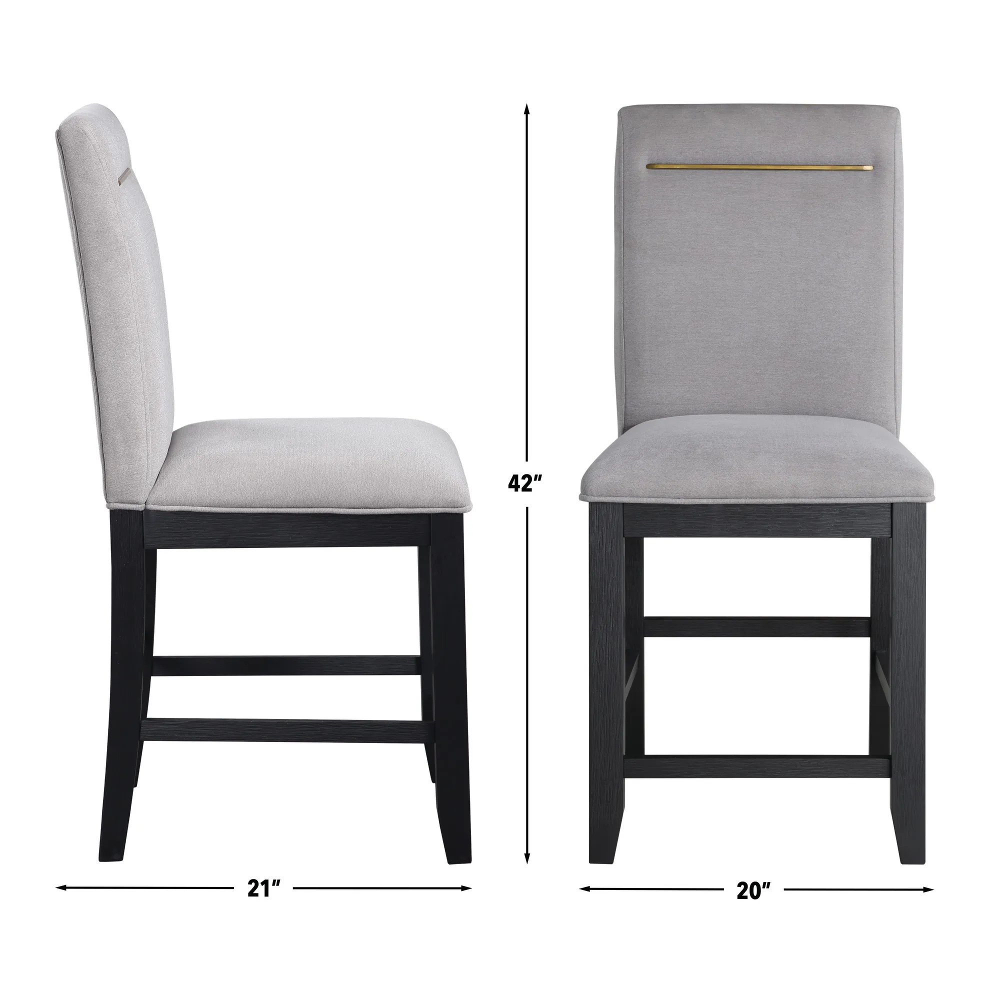 - Styling details include storage pedestal base with two sliding doors and three shelves, gold accents on Counter Chair back with clean linear lines that work well in modern environments.