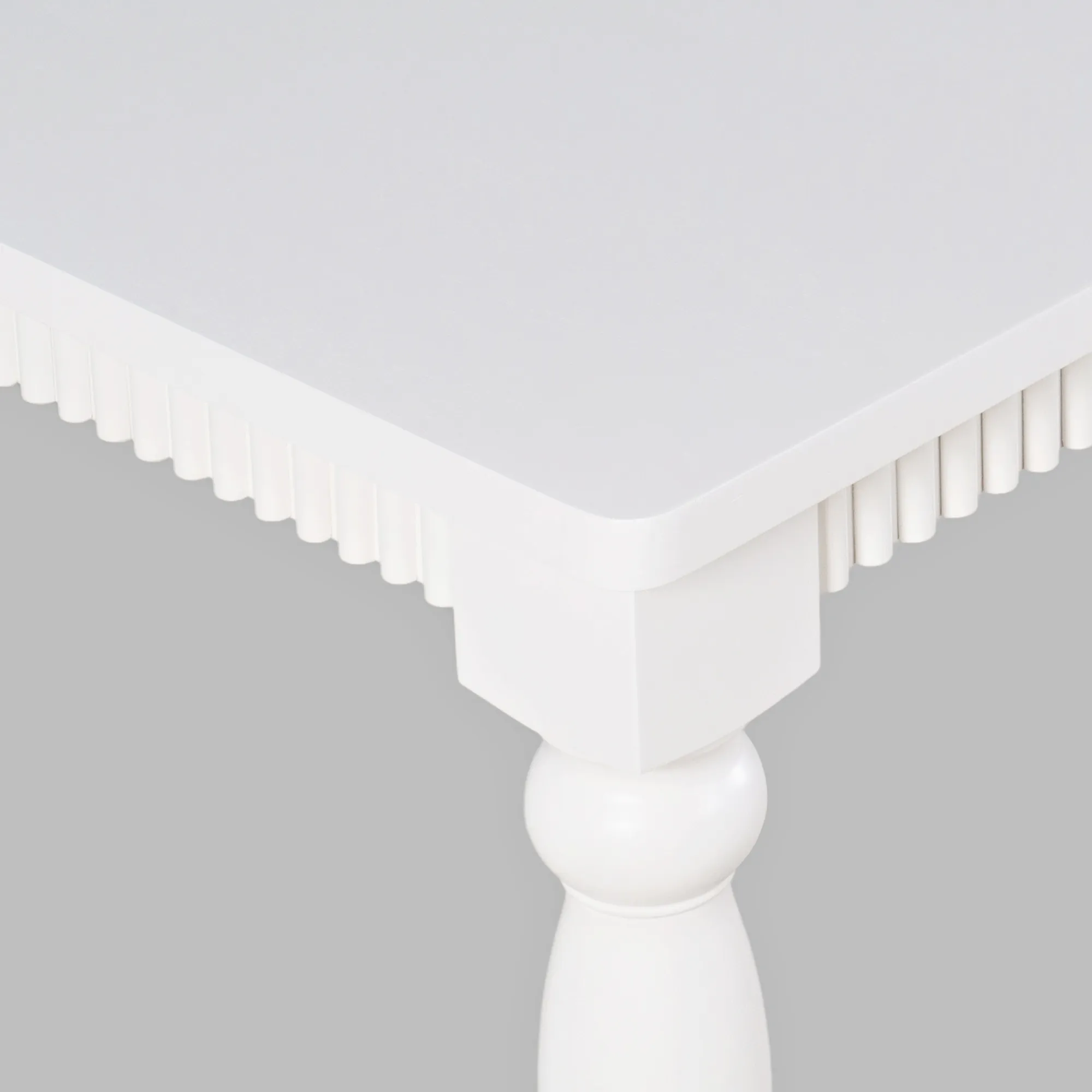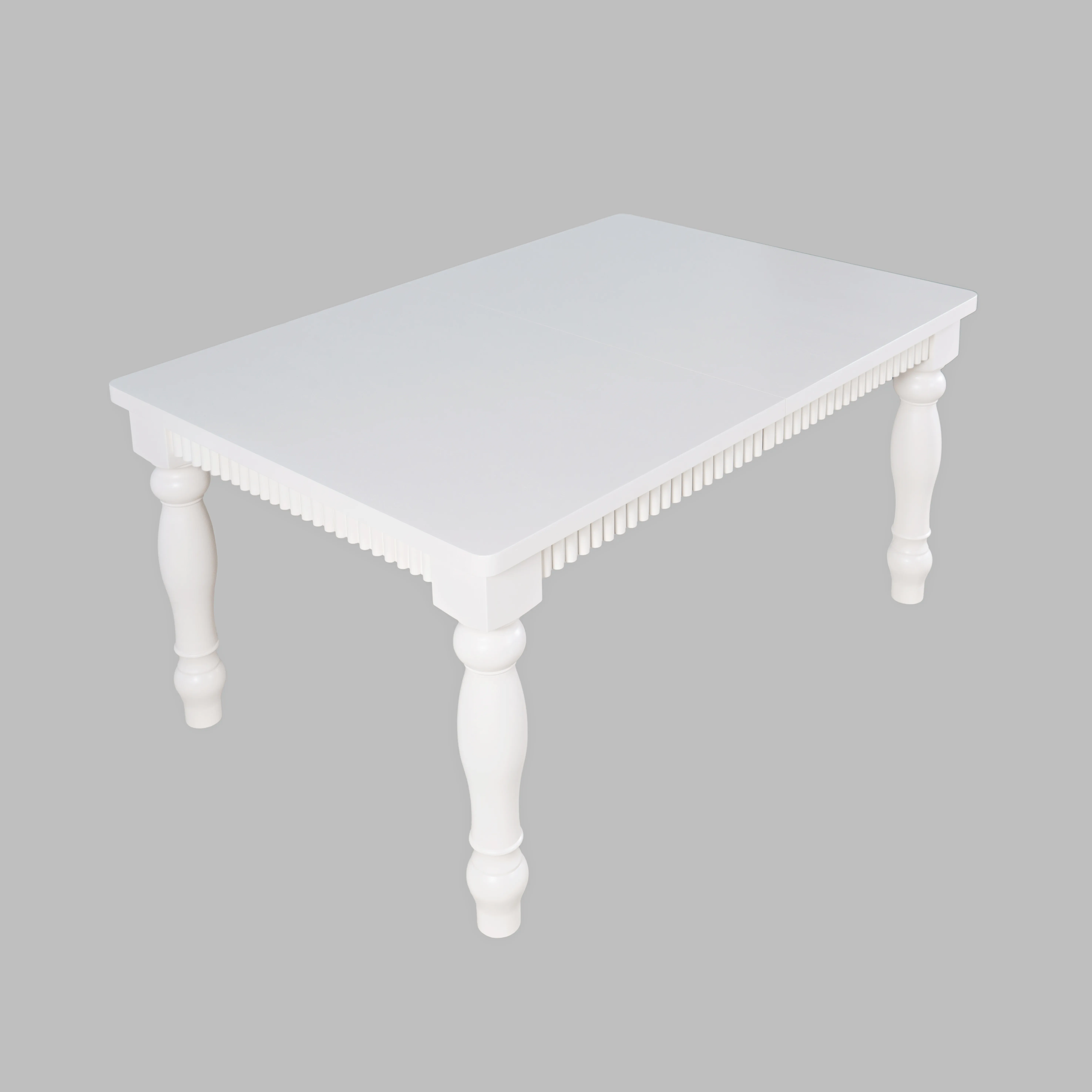• -60 x 40 inch rectangular top extends to 72 x 40 inch with 12 inch leaf -30 inch dining height for comfortable seating -Traditional turned legs with timeless appeal -Fluted apron detail adds texture and charm -Crafted from rubberwood and veneer -Available in navy or white finish -