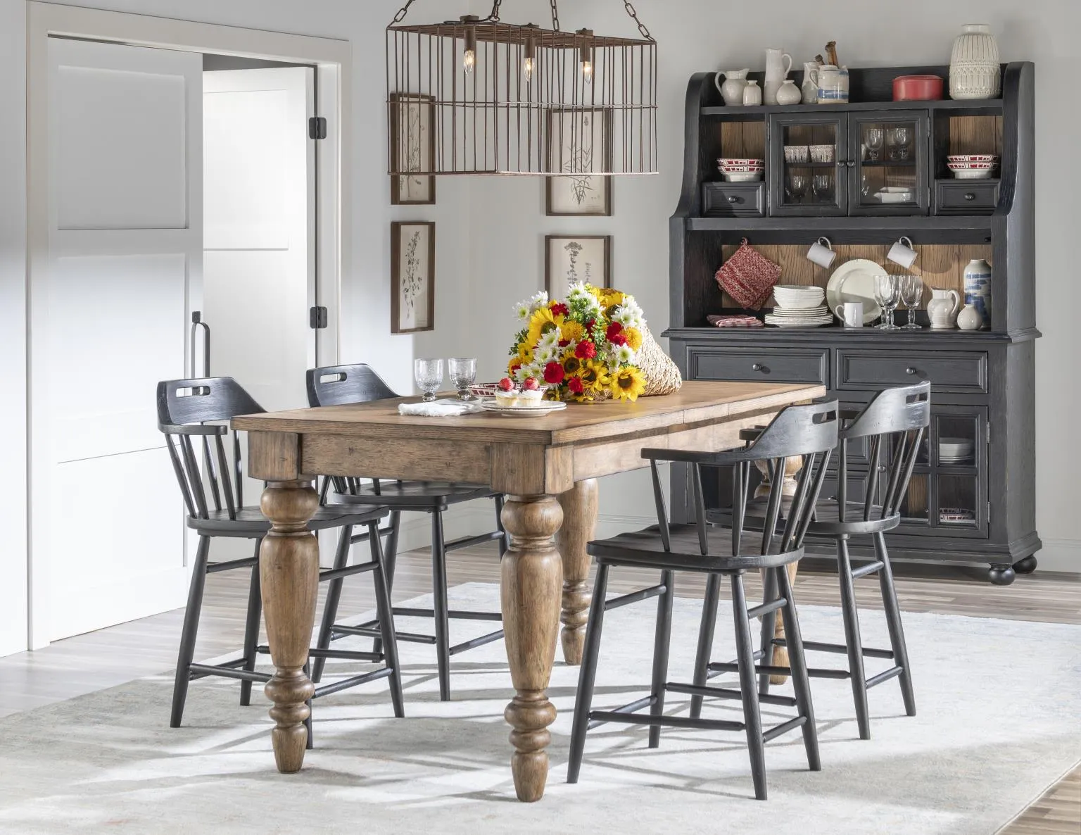 The Country Living Vintage Market Chimney Leg Counter Height Table by Legacy Classic Furniture blends farmhouse charm and functional design, featuring a Barnwood top, your choice of Barnwood or Kettle Black base, and two 12-inch leaves for flexible dining. Crafted from select hardwoods and oak veneers, this rustic counter height table with turned legs perfectly complements country, cottage, or farmhouse-style kitchens and dining rooms.