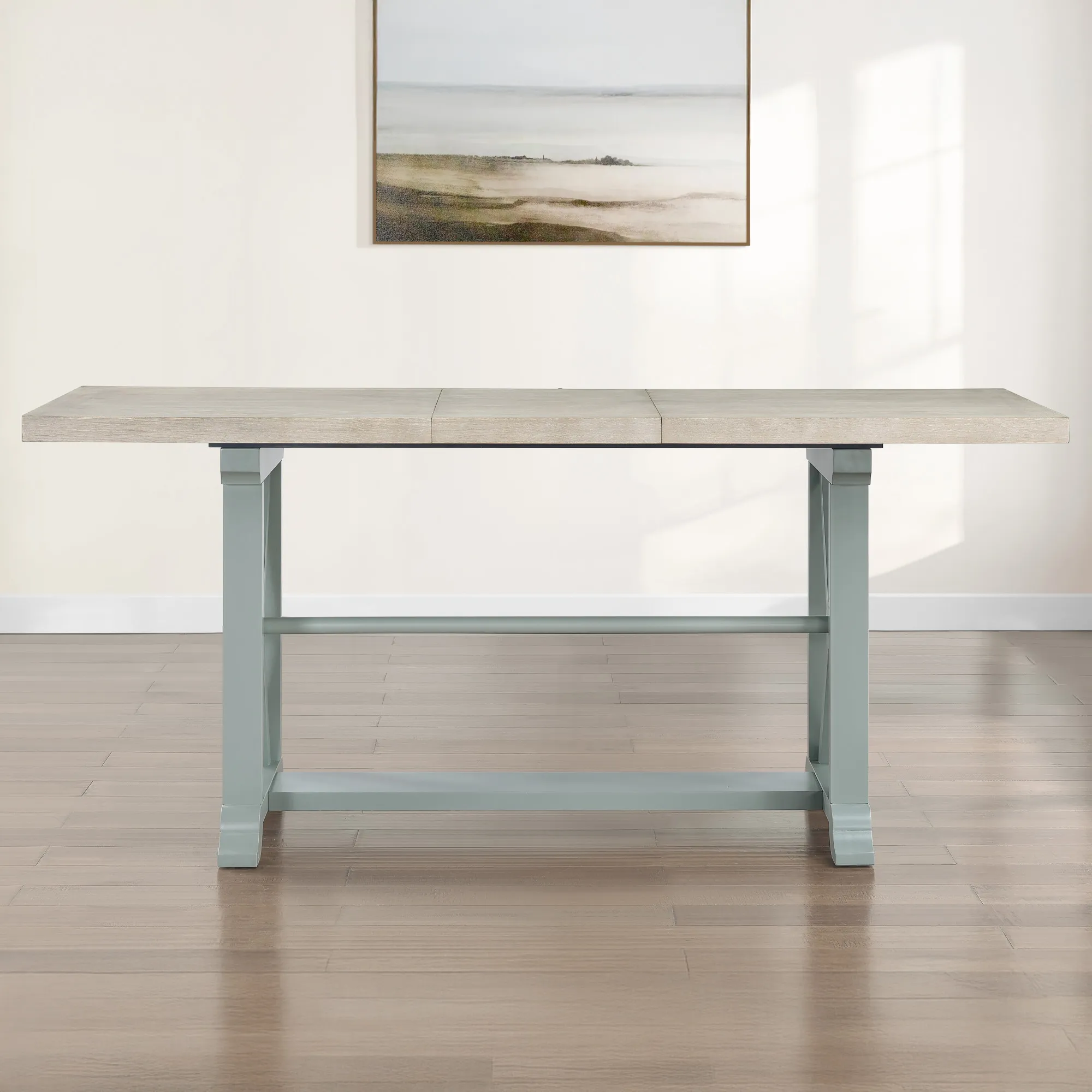 Gather in style with the Darcy 64-82 Inch Counter Table, where charm meets functionality. Featuring a parchment stained wood top and squared mint green legs, it embodies rustic-modern elegance with a touch of farmhouse mixed with some modern styling. The table extends effortlessly from 64 to 82 inches with an 18" leaf, seating up to six guests. Expertly crafted from oak veneers and Asian hardwoods, its solid construction ensures lasting durability. Thoughtful details like "X" side panels, a sturdy center stretcher, and hand-stained finishes highlight timeless craftsmanship. Perfect for dining or workspaces, it blends style and versatility beautifully.