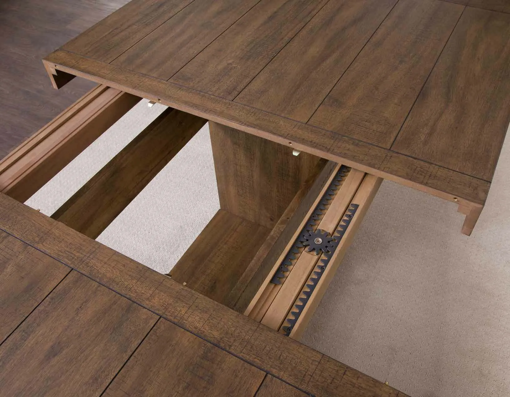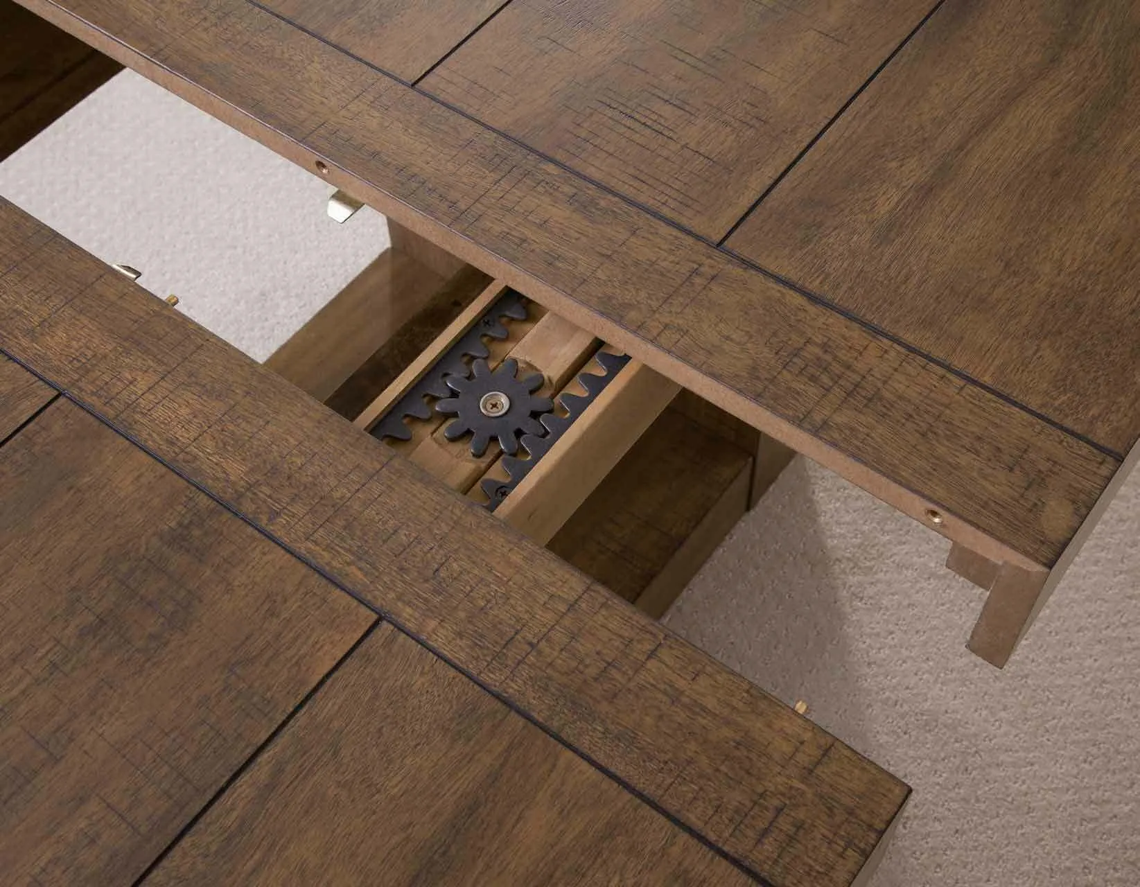 - Faux plank top with rasping and threading distressing for a relaxed, sophisticated look