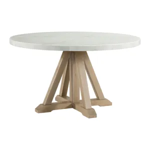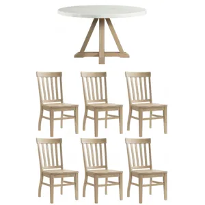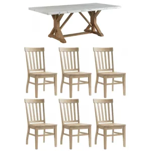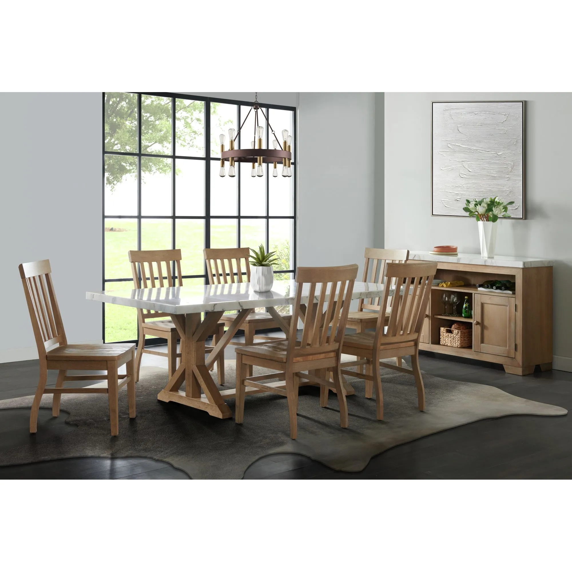 Bring refined style and warm design to your dining area with the Lakeview Rectangle Dining collection. Constructed of wood solids, accented with a natural marble top, this set offers an air of elegance and sophistication while maintaining true functionality. With it’s slender light wood base; a fresher take on a traditional trestle dining table, this table steals the spotlight. The slat back chairs bring a sense of comfort while dining. The Lakeview is guaranteed to fill any room with style, drama, and presence. Finish the room with the matching server to help store holiday dishes and drinkware.