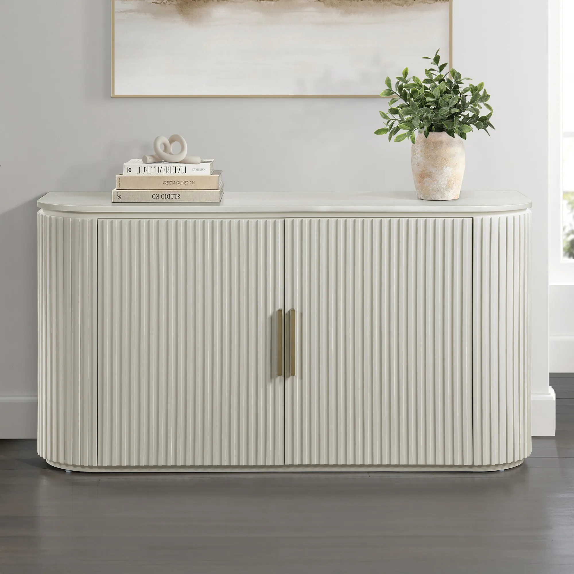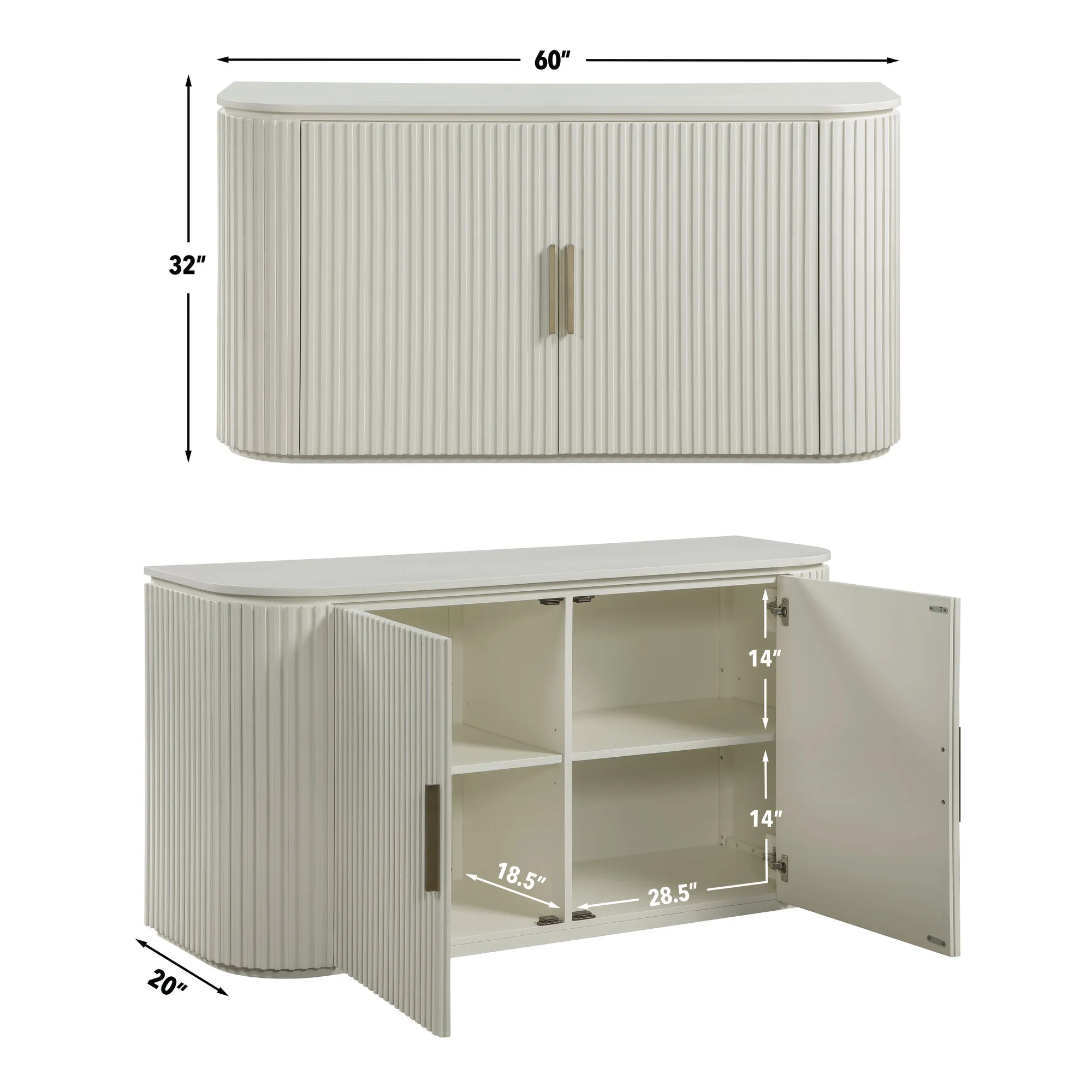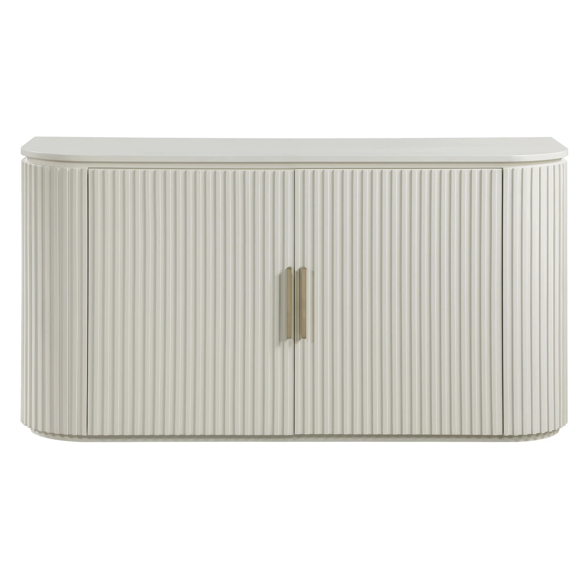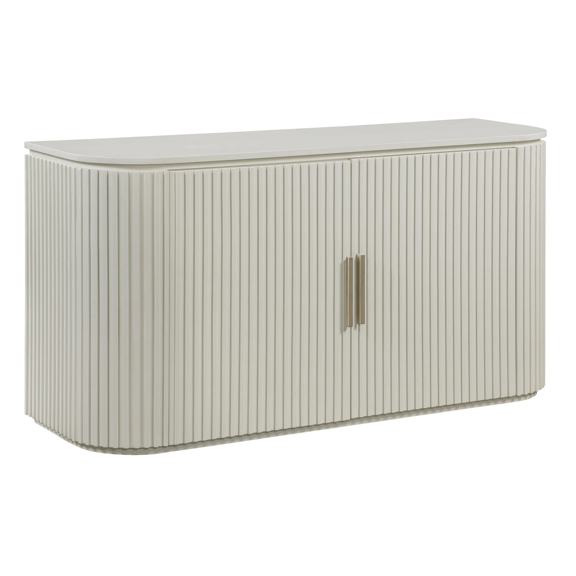 The Colvin Ivory Server presents an exquisite dining accent piece, combining modern allure with hints of old Hollywood glamor. Its gently rounded, reeded front doors create an elegant, softened profile, while European concealed hinges add to its seamless aesthetic. Inside, two adjustable shelves offer practical storage space, perfect for organizing dining essentials, while the satin brass hardware adds a refined touch of sophistication. A captivating blend of style and function, this server brings romantic charm to any dining room.