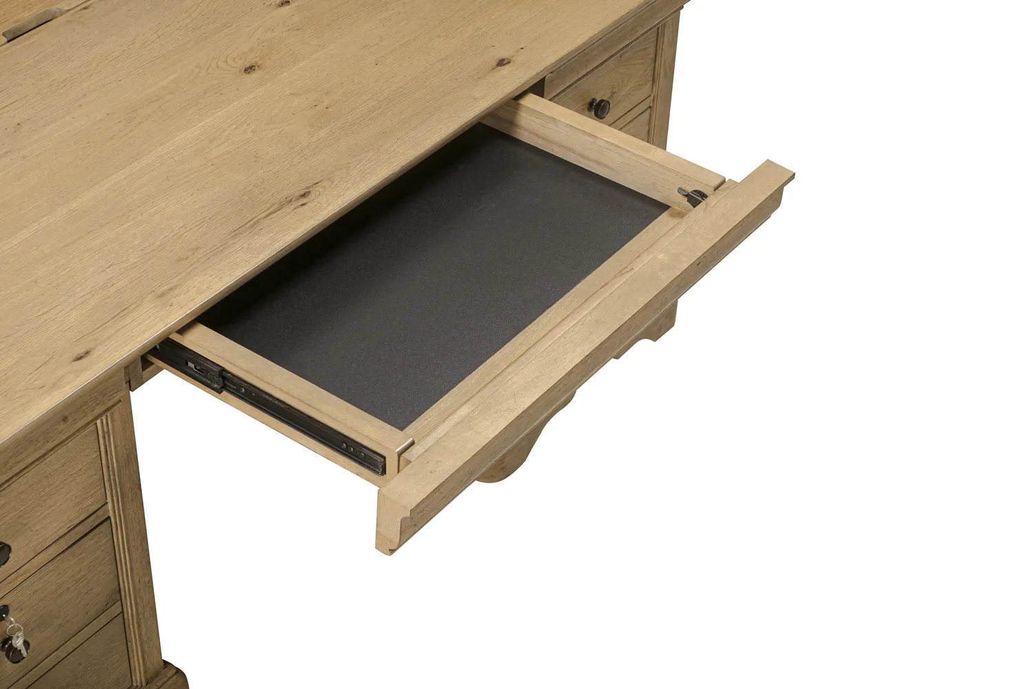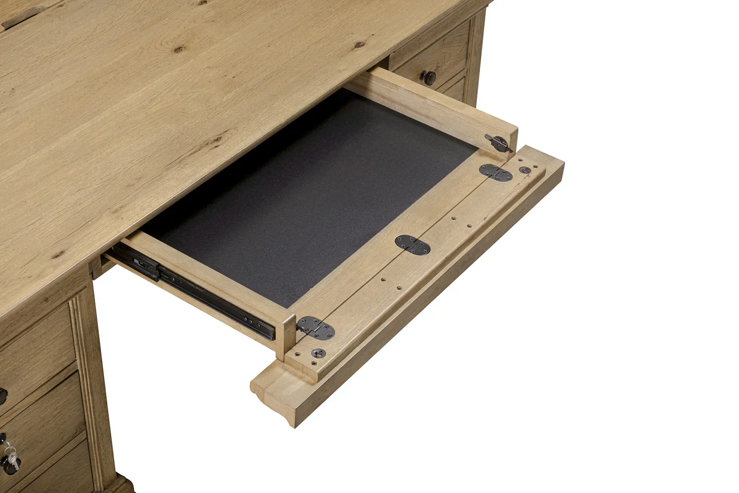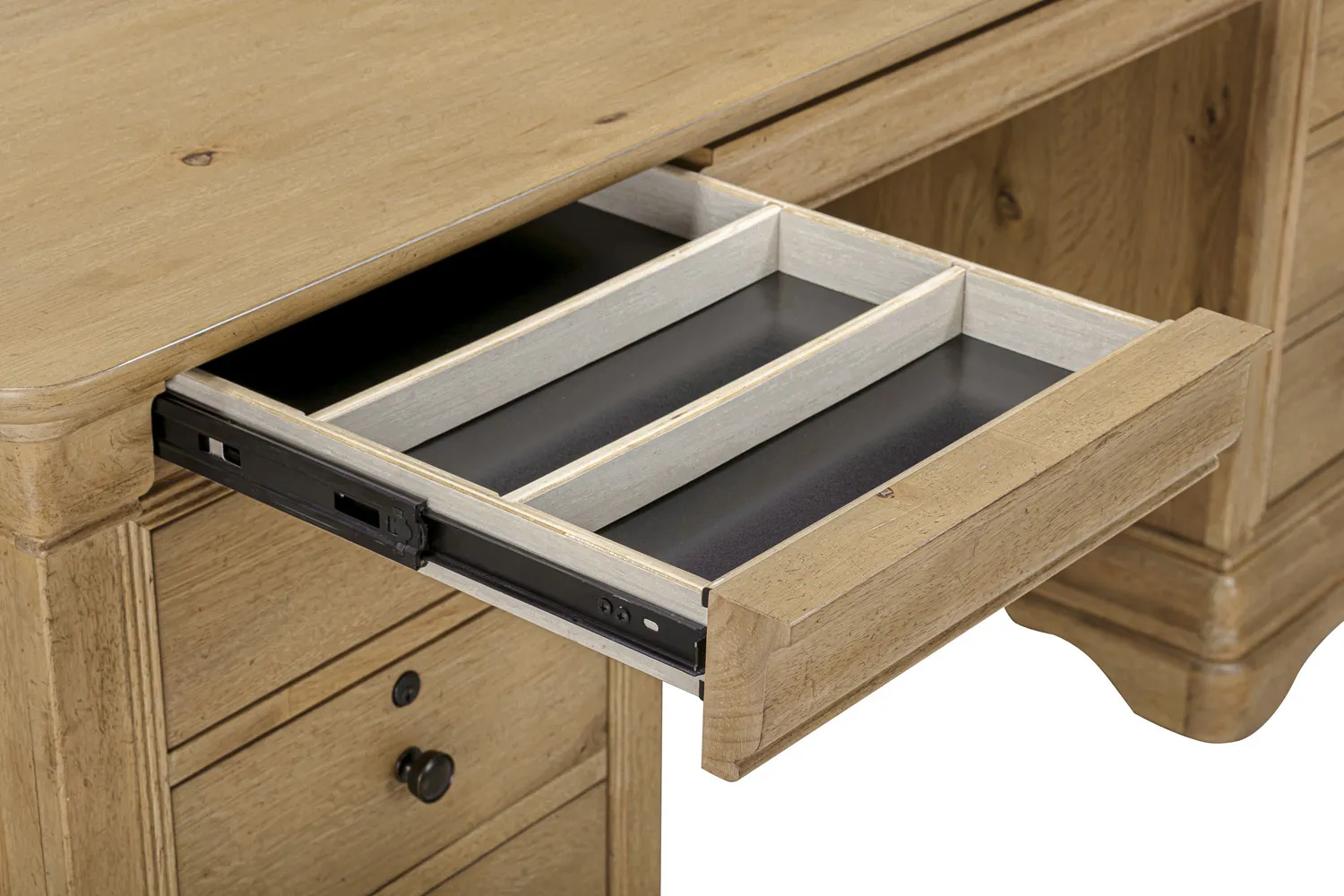 • Drop-front keyboard drawer – Pull-out tray keeps your workspace clean and can be used for a keyboard or storage