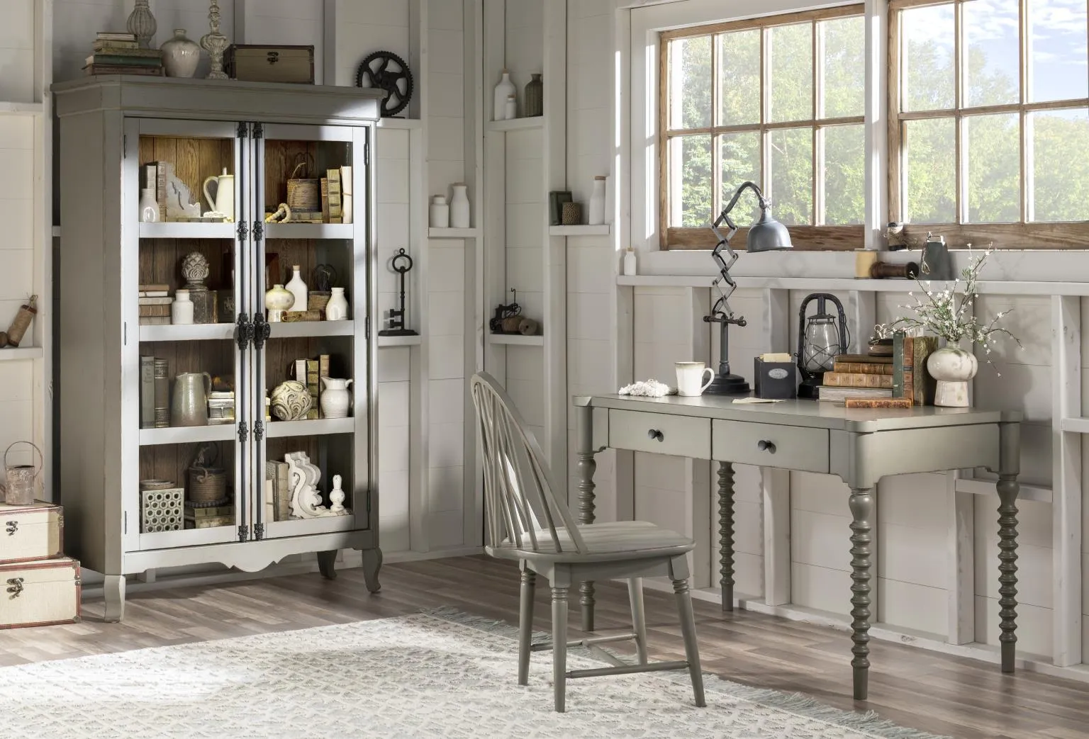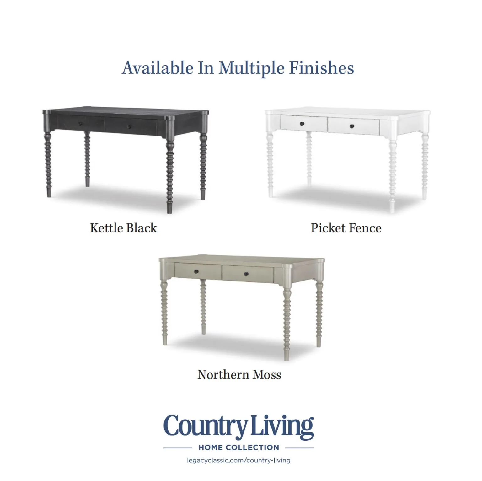 The Country Living Vintage Market Bobbin Leg Writing Desk by Legacy Classic Furniture is a solid wood desk with turned bobbin legs and two storage drawers, available in Northern Moss, Kettle Black, or Picket Fence finish. Perfect as a farmhouse writing desk, cottage-style office desk, or vintage-inspired console, it brings the warm, cozy character of the Country Living Collection to any workspace.