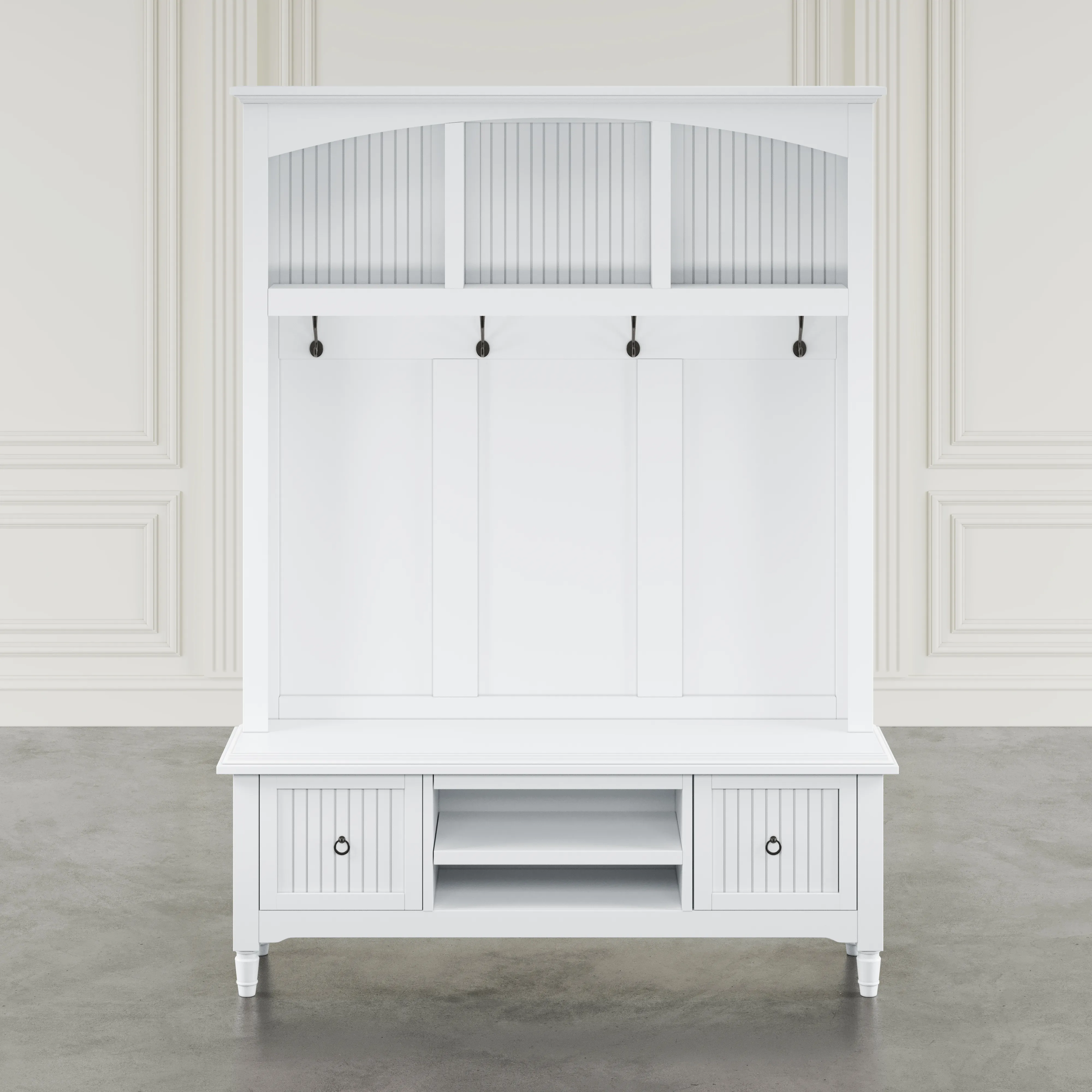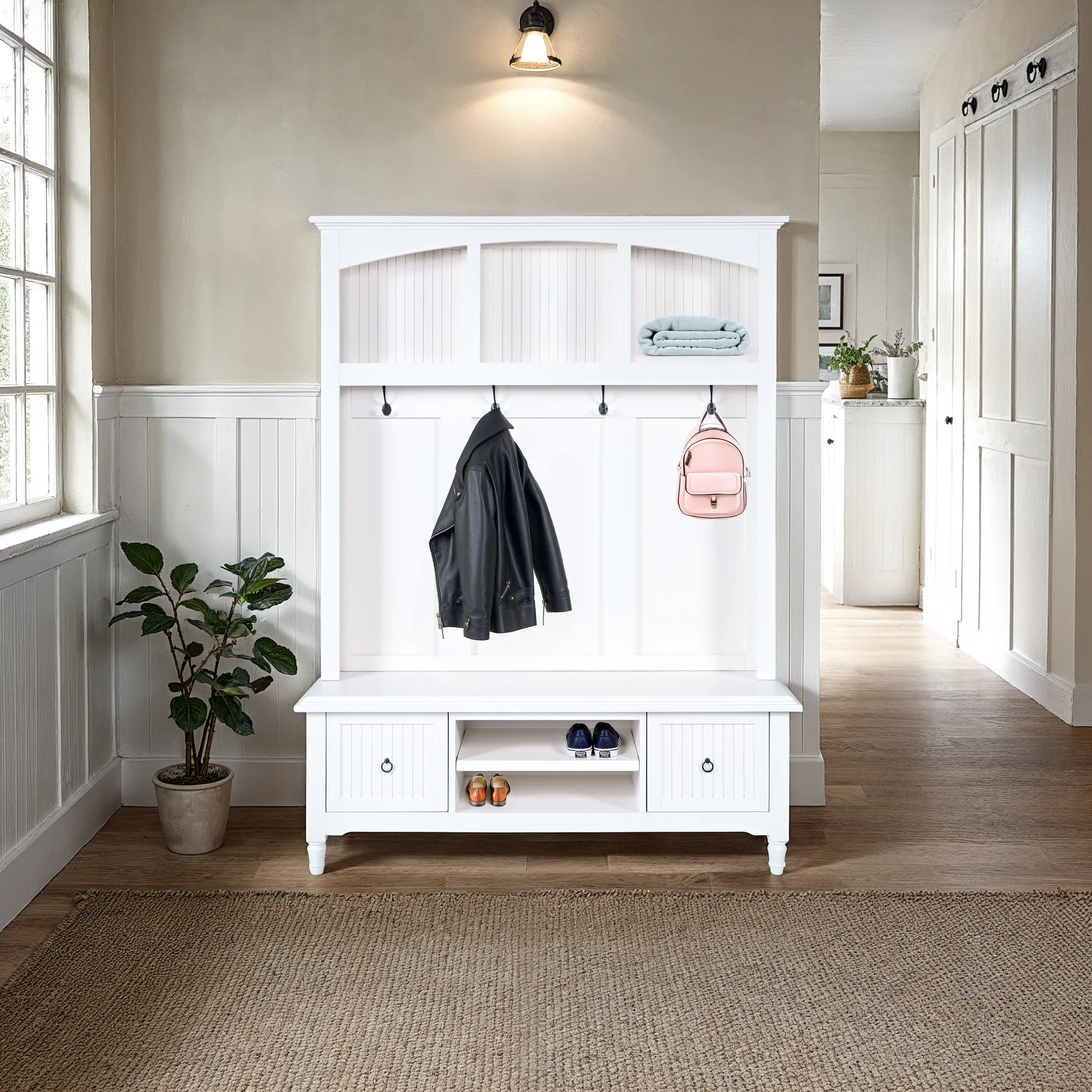 The Westport Modern Farmhouse Hall Tree with Storage Bench brings charming organization to any entryway, mudroom, or hallway. Crafted with clean lines, framed molding, and classic beadboard paneling, it offers a warm yet structured backdrop for everyday use. Four sturdy hooks keep coats, bags, and accessories neatly arranged, while open cubbies and lower drawers provide smart storage for shoes and grab-and-go essentials. A wide bench seat ensures comfort and convenience, blending timeless style with practical function in a piece designed to elevate busy household spaces.