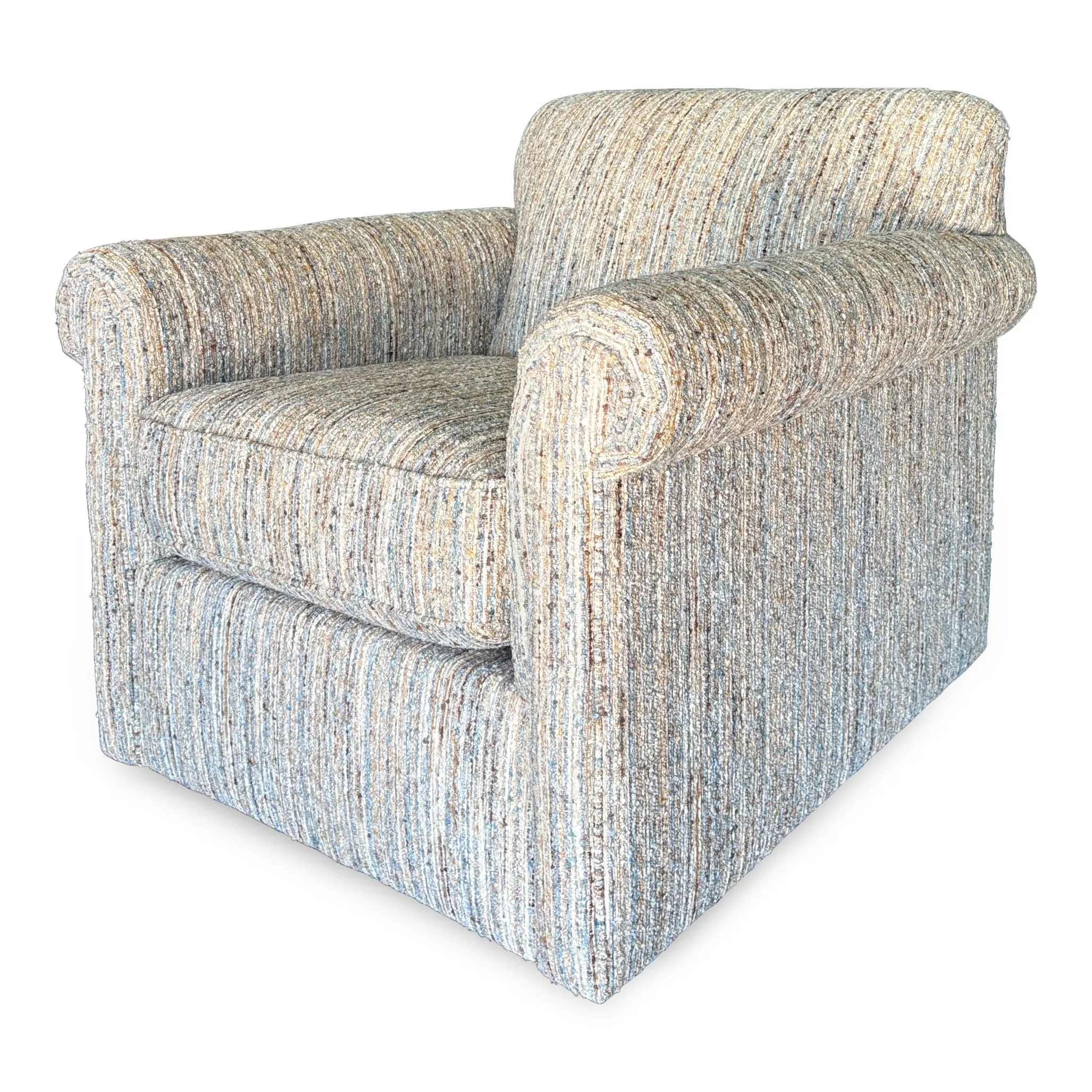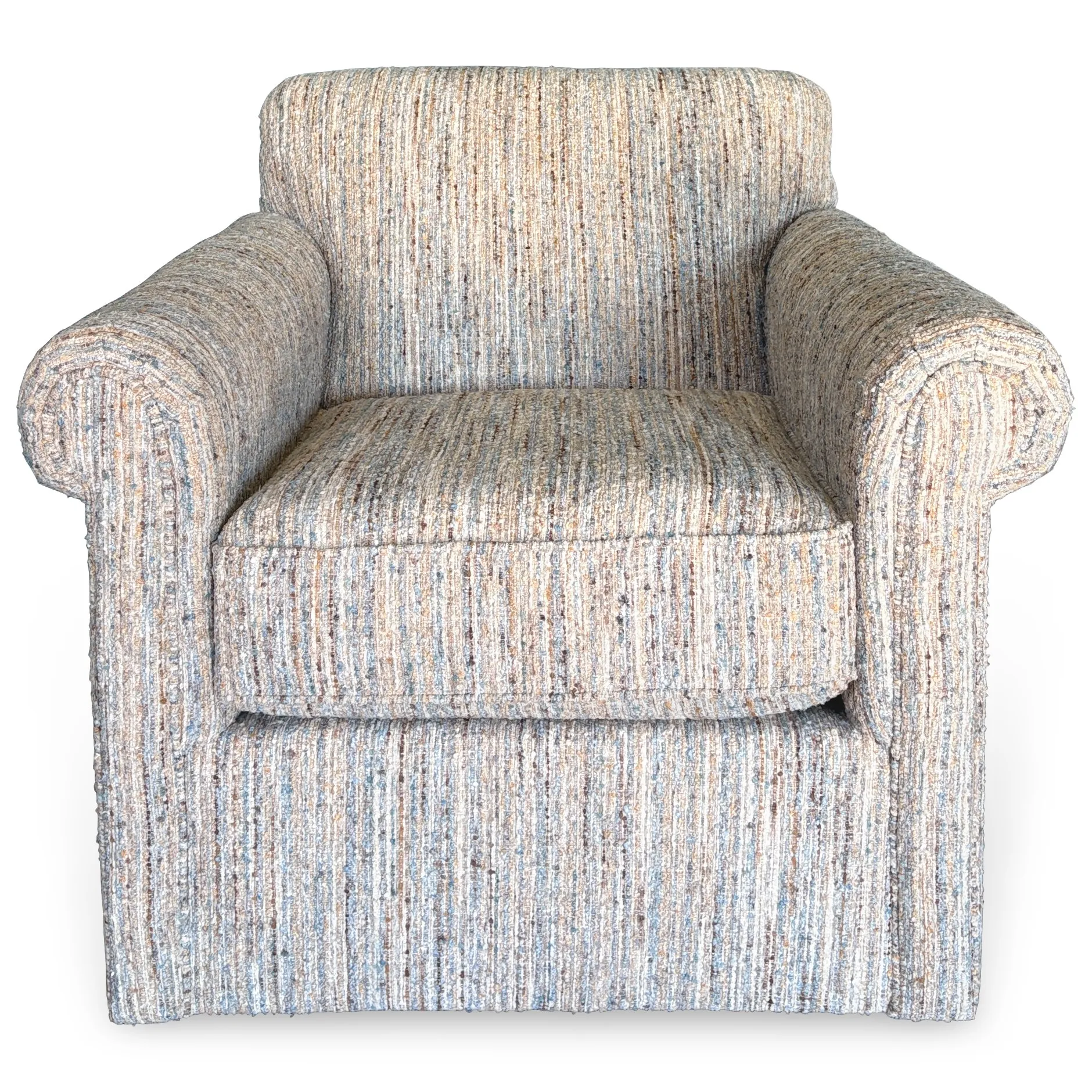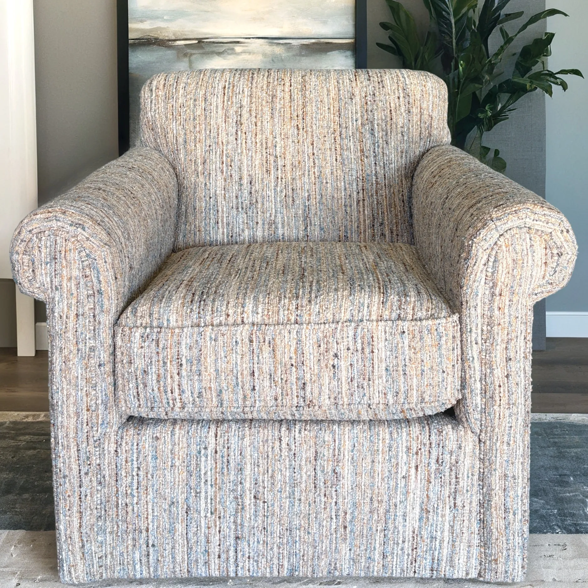 The Craftmaster M915 Swivel Chair offers the perfect mix of cozy comfort and transitional style. Upholstered in Donatello 22 fabric, a richly textured pattern with shades of blue, brown, beige, and rust, this chair brings warmth and visual depth to your living room. Its smooth swivel base allows for easy movement, while the plush cushioning and tailored silhouette make it a versatile accent that pairs beautifully with both solids and patterns.