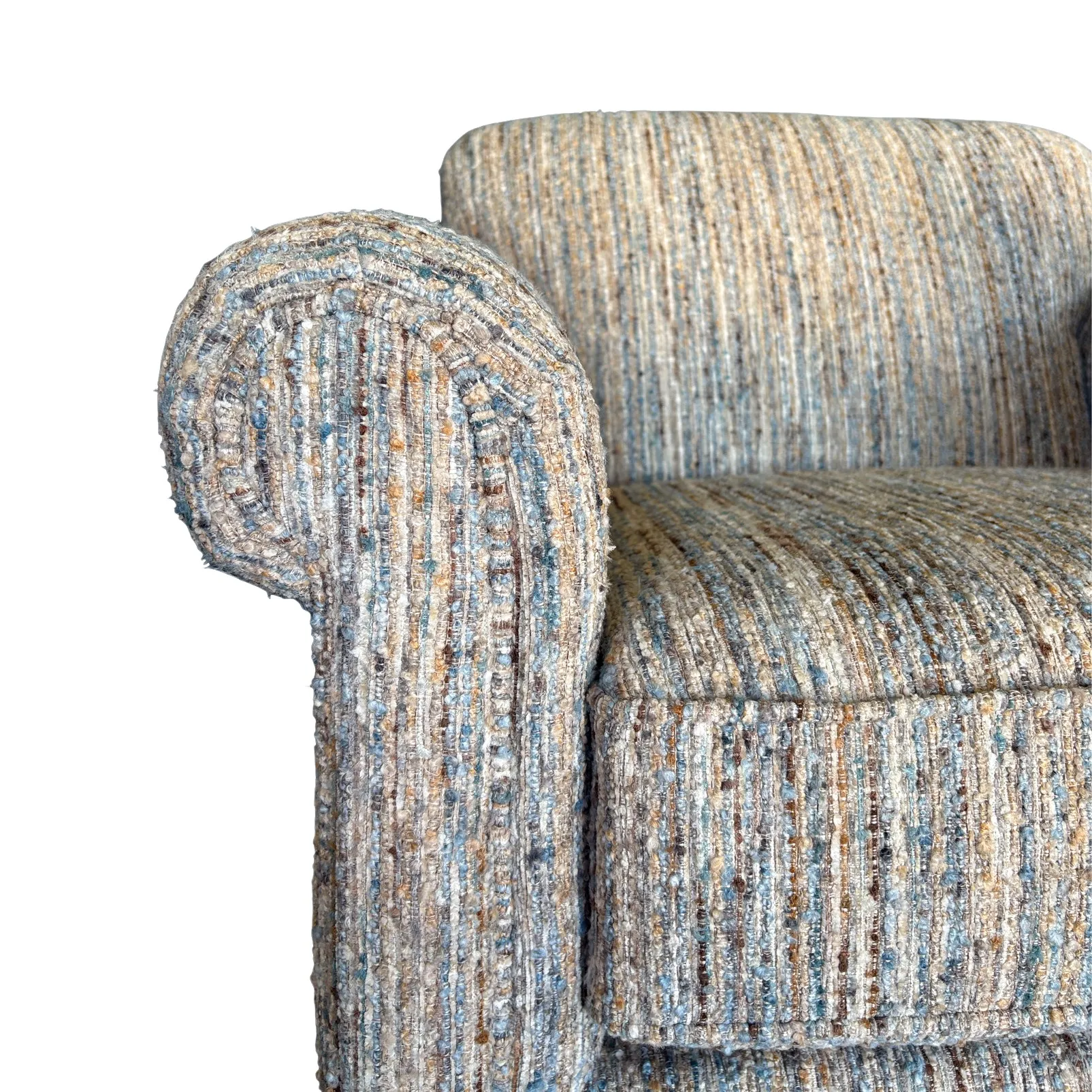 • Upholstered in Donatello 22 fabric featuring blue, brown, beige, and rust tones