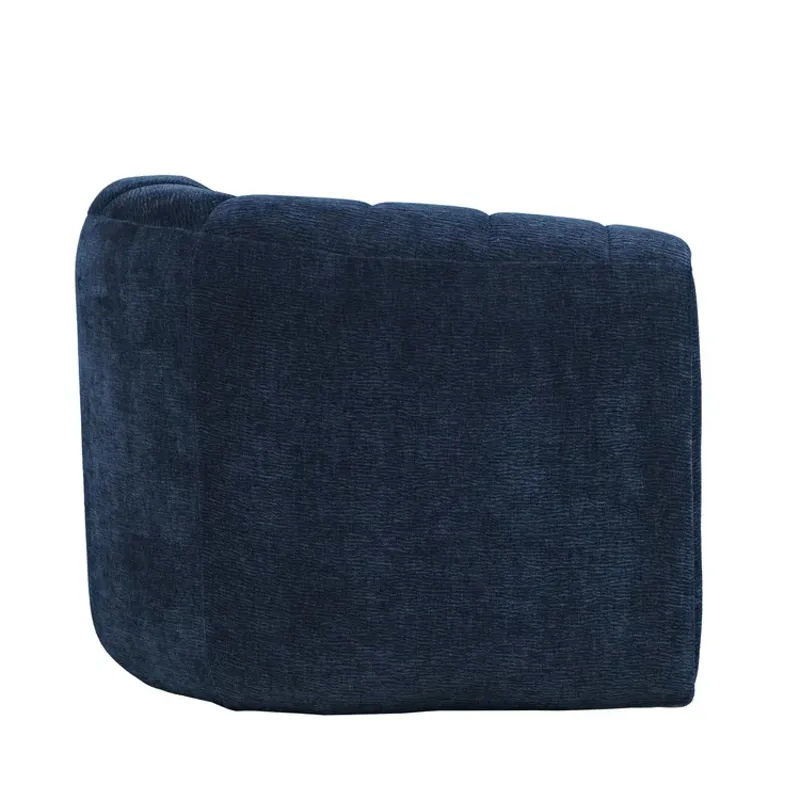 The Jofran Grande Swivel Chair in Navy makes a bold statement with its curved barrel silhouette and channel-tufted back. Wrapped in deep navy fabric, it balances modern elegance with casual comfort, creating a striking accent in any living space. The smooth swivel base keeps you connected from every angle, making it a perfect choice for conversation areas, bedrooms, or reading corners.