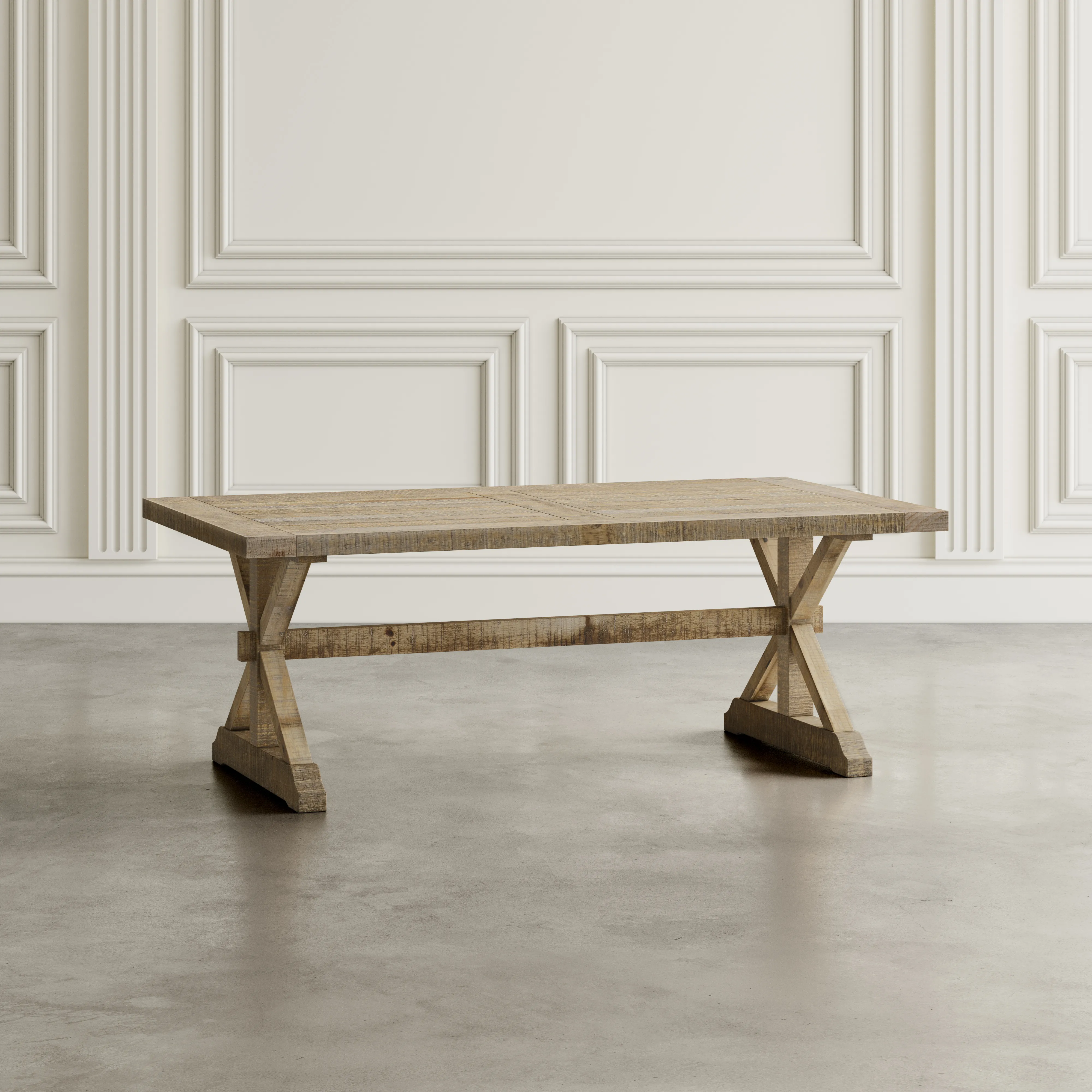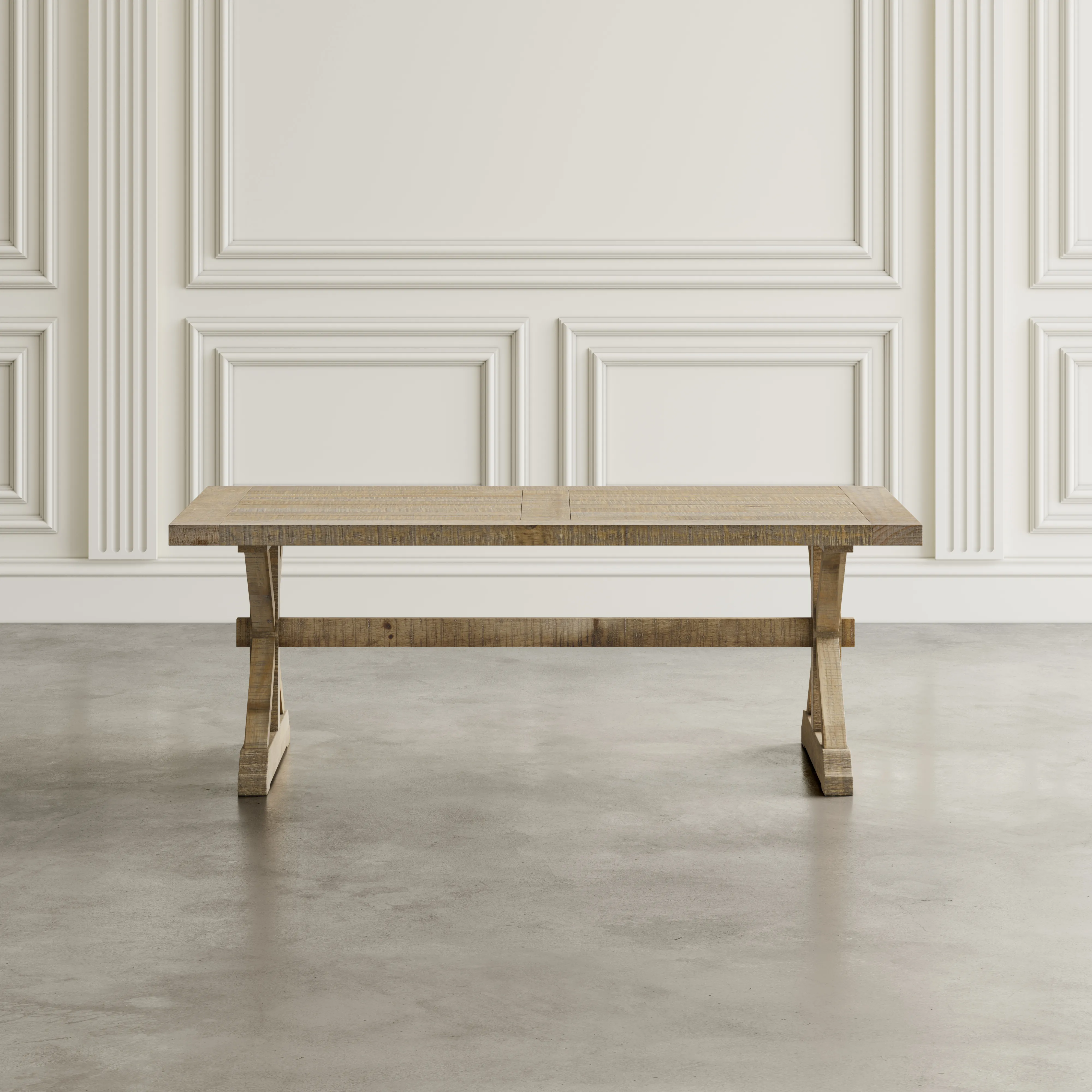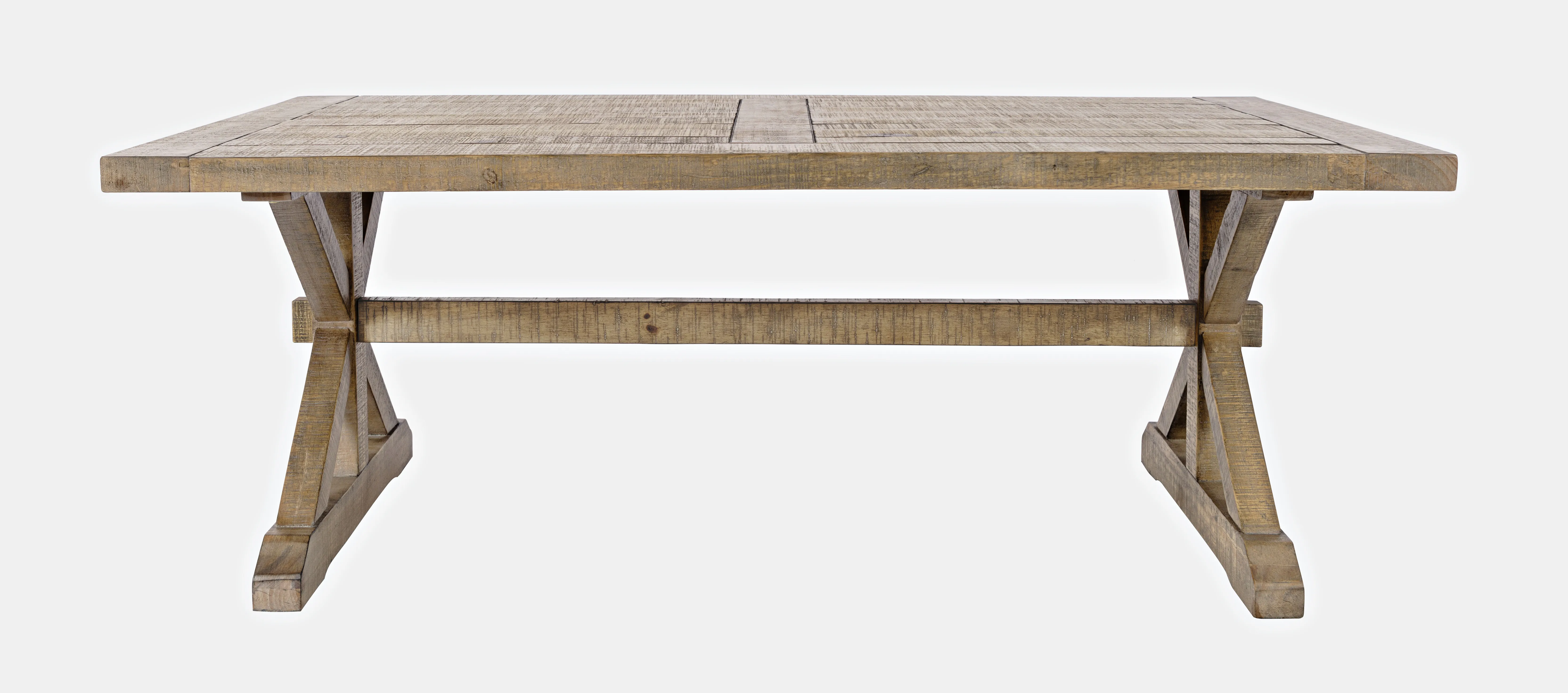Rustic solid pine on a farmhouse pedestal and trestle base creates the perfect blend of classic and modern style with the Carlyle Crossing Coffee Table. The base with cross-beam supports are naturally distressed with plenty of character, and a table top with a unique framed corner design adds a little farmhouse flair to your home.