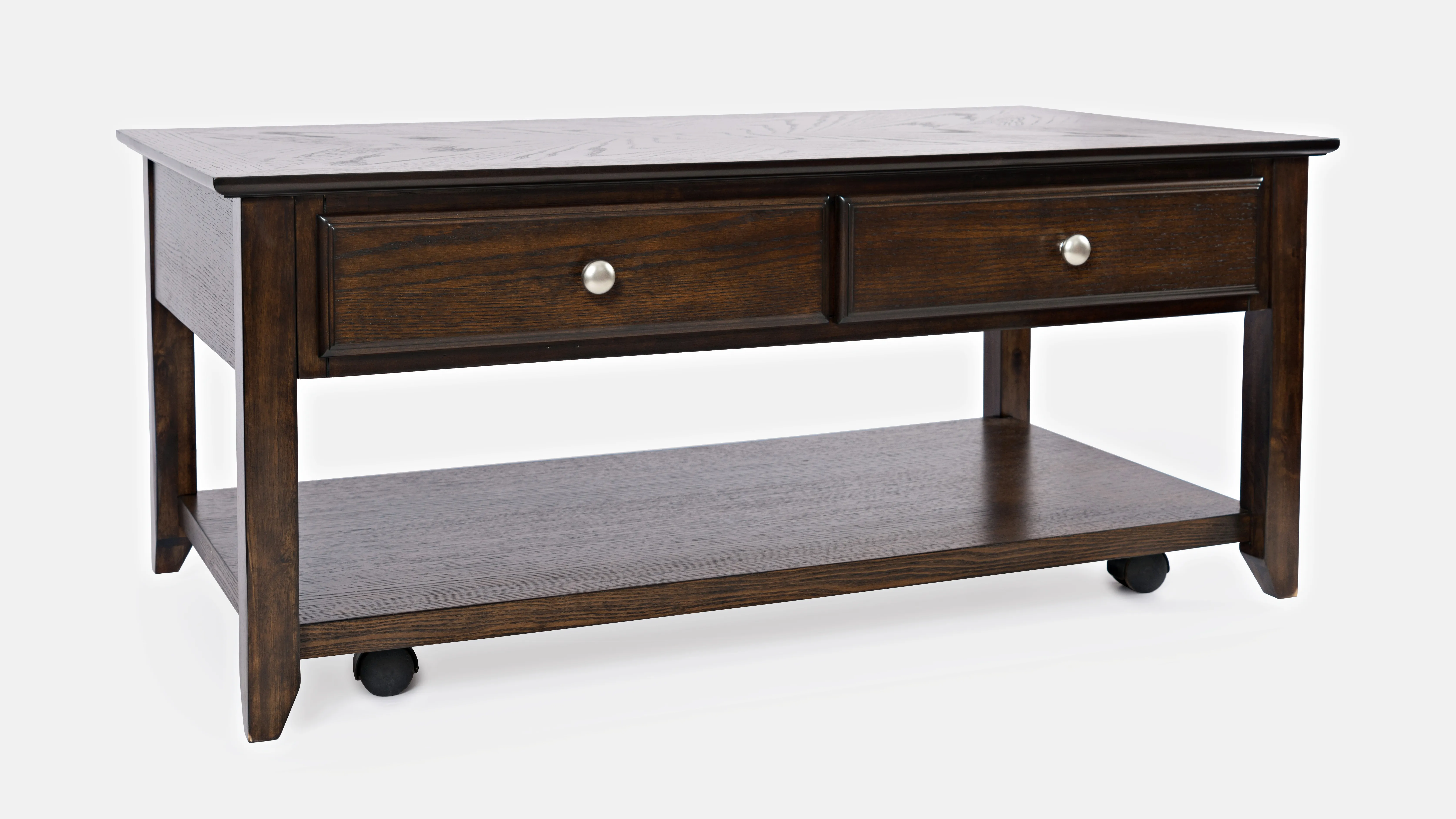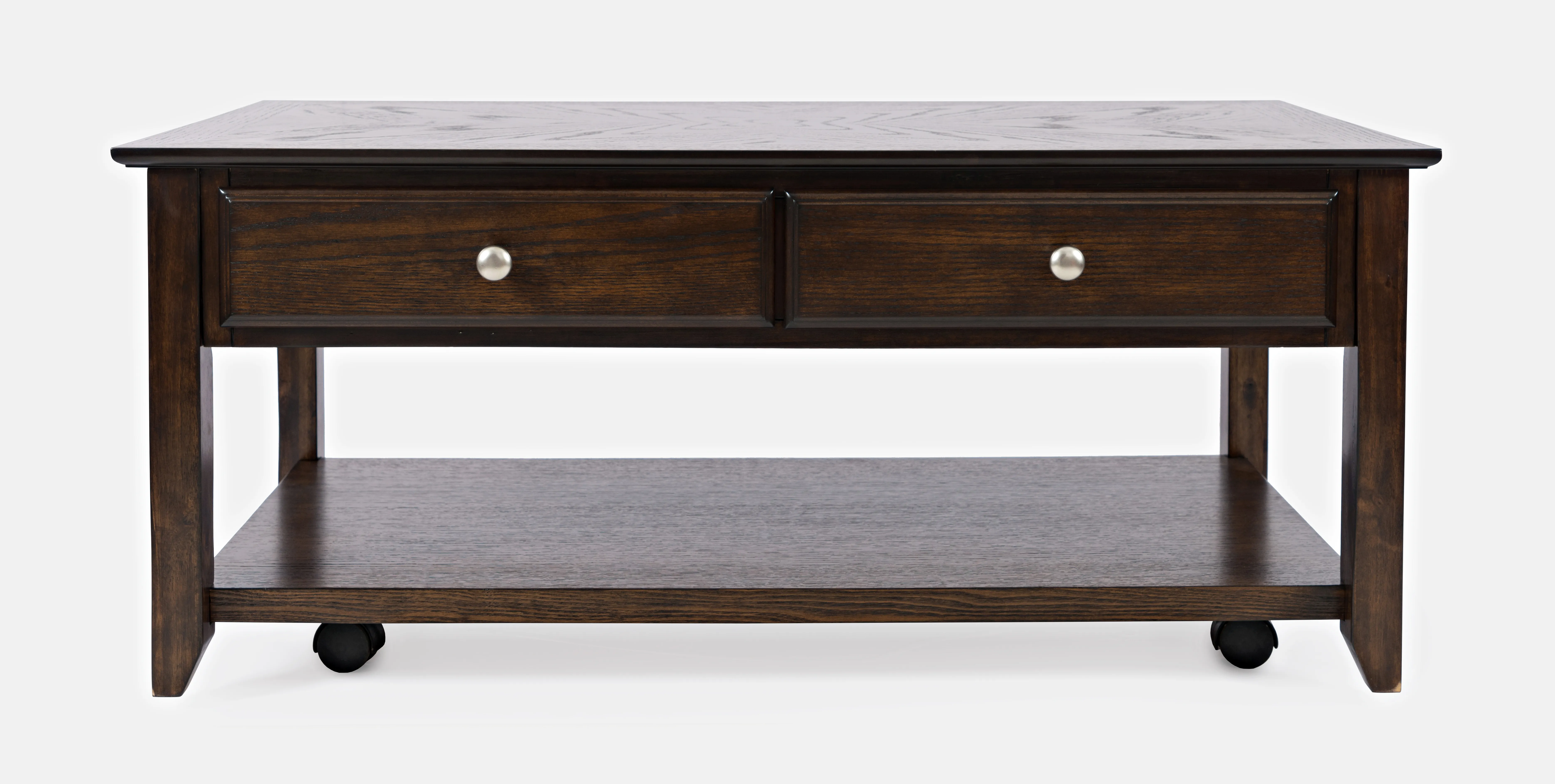 A smooth finish, dovetailed drawers and brushed nickel hardware make this Espresso Modern Four Drawer Coffee Table everyone's favorite. There is plenty of storage with the four full-size drawers and one shelf, and optional included caster wheels make moving a breeze. Available in Espresso Brown and Grey-Brown Carlton finishes.