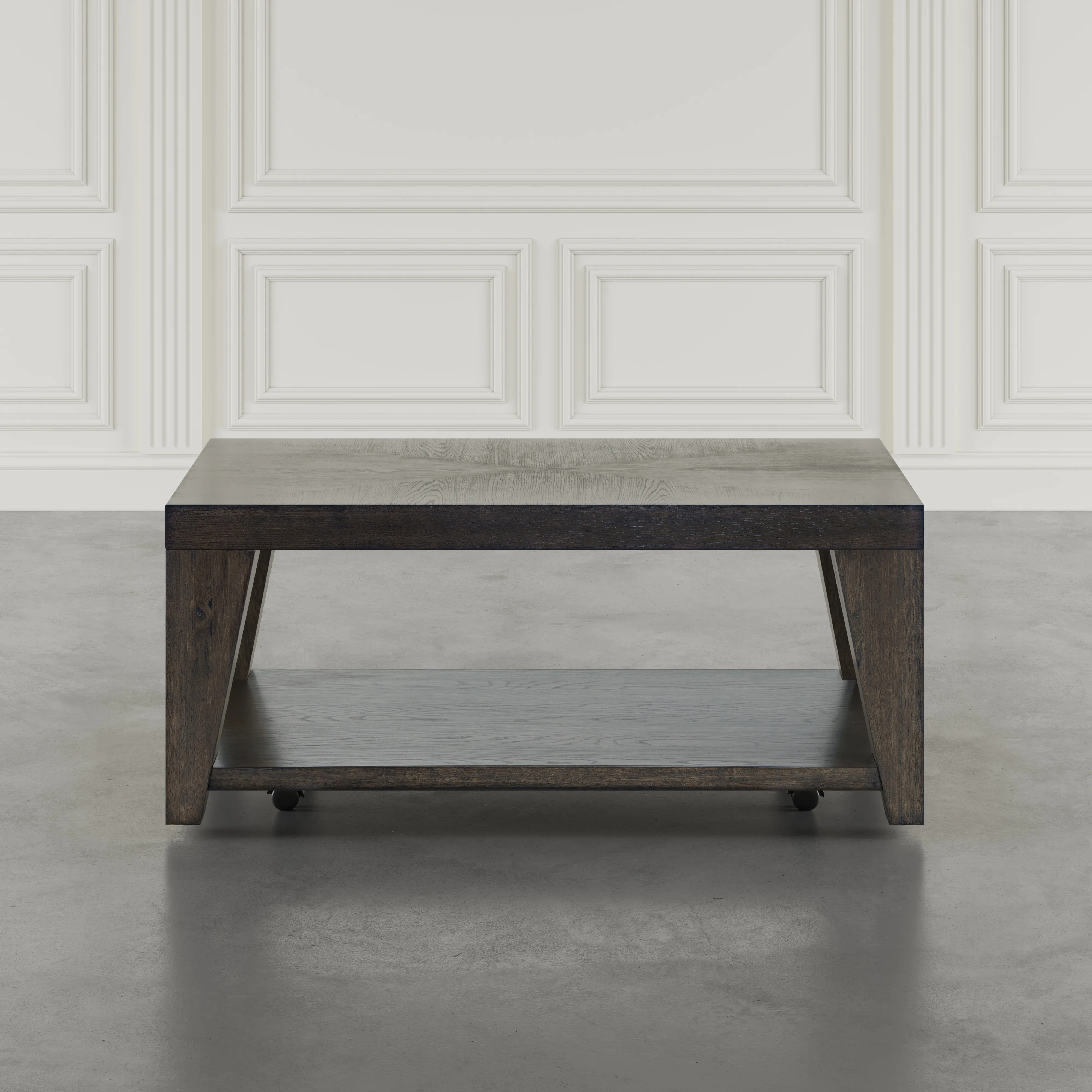 Merging contemporary design with everyday function, the Laurel Creek 50" Coffee Table is crafted from engineered wood and veneer, supported by solid rubberwood legs. Its structured, geometric form is enhanced by a spacious lower shelf, perfect for keeping books, decor, or everyday essentials within reach. Hidden caster wheels provide seamless mobility without compromising its refined aesthetic. A balance of style and utility, this coffee table is the ideal centerpiece for modern living spaces.