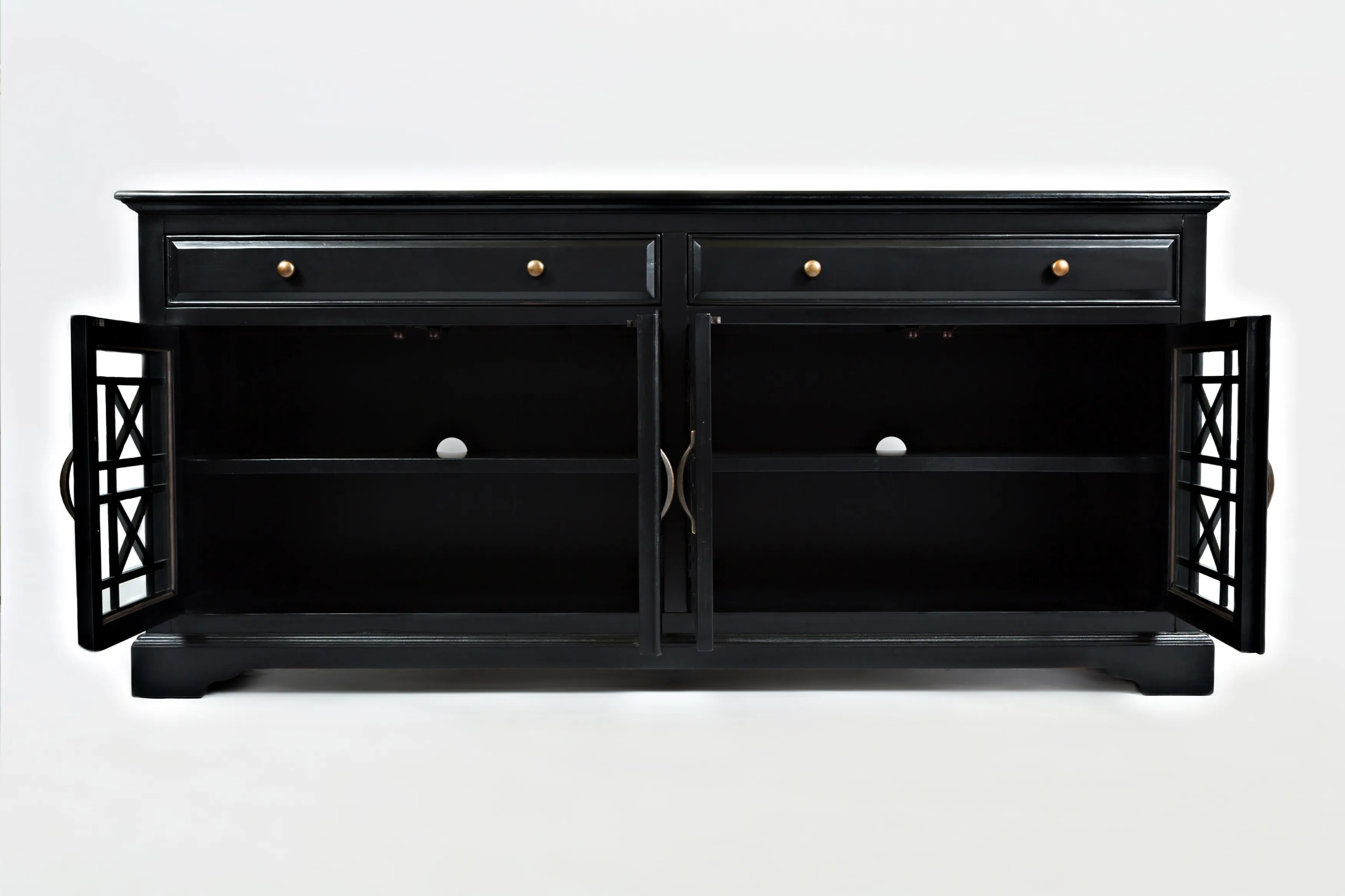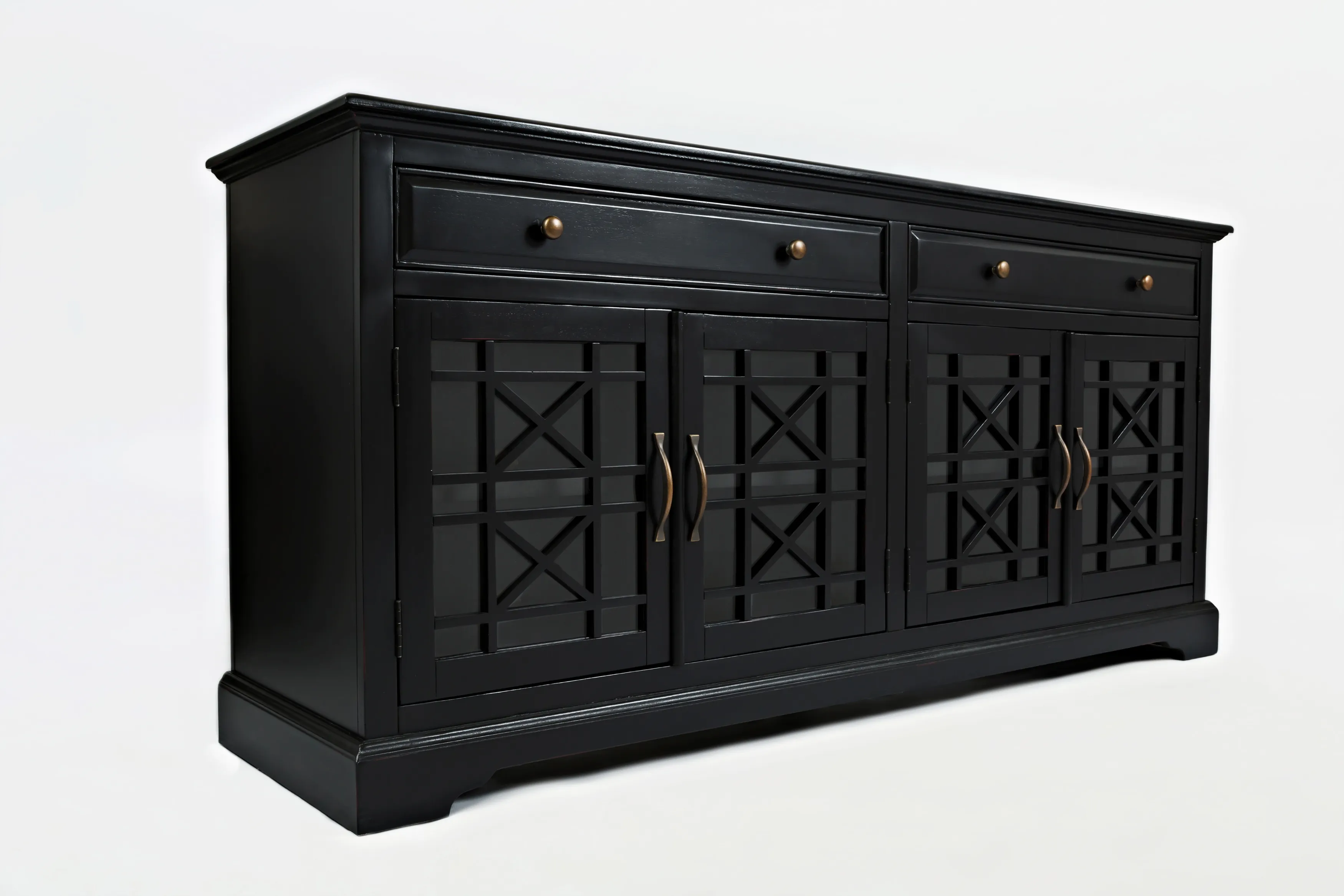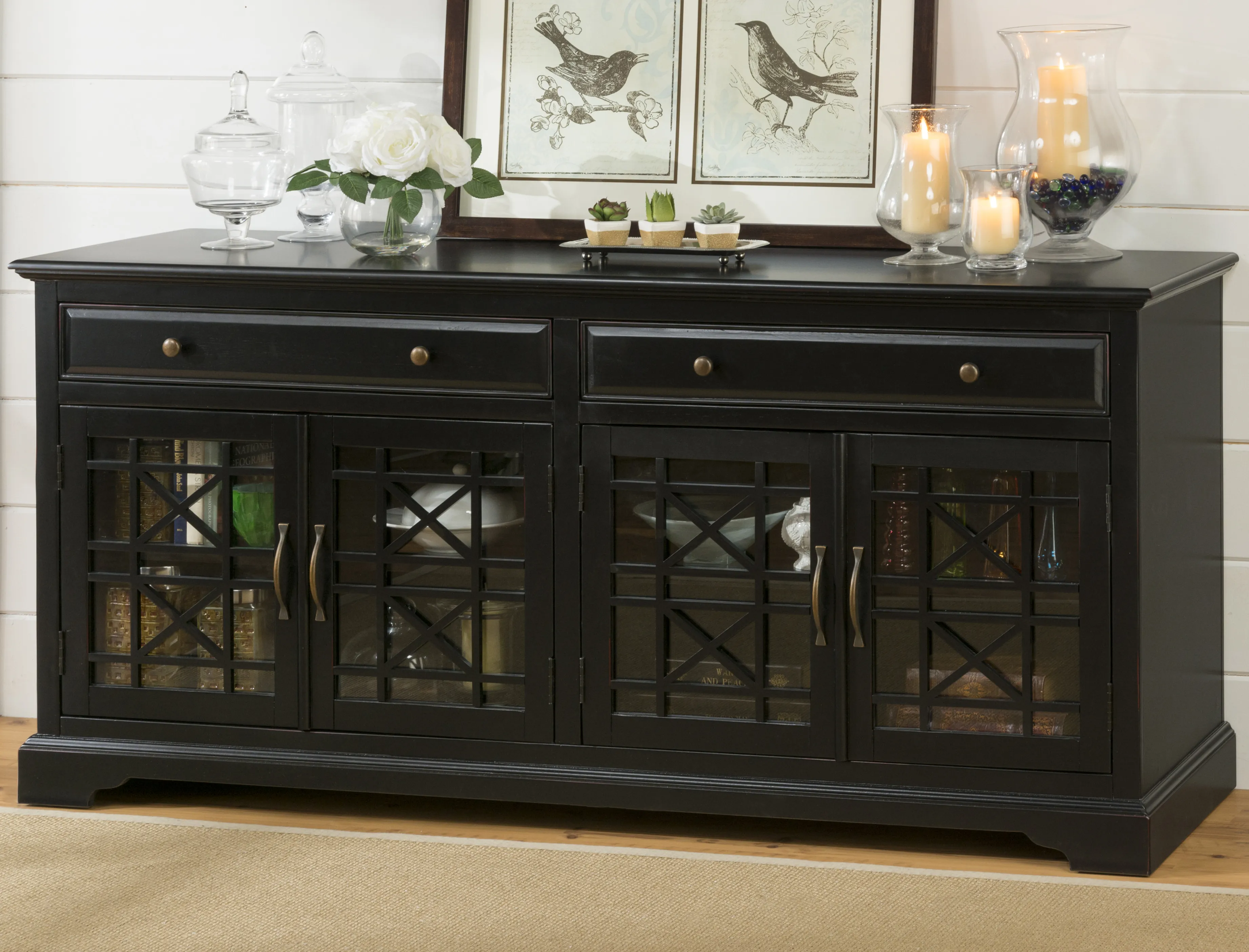 This 70” media and storage unit features a uniquely distressed finish with two drawers and four glass doors. With “X” motif detailing on the doors and rugged hardware, this eclectic piece will add flavor to any room. We are excited to introduce the newest finish to this group- Earl Grey. Soft grey with fret work accents on the doors, this new color is a style camelion and will fit with any décor in any room. Perfect for media, displaying your treasures, or storing dishes, these consoles are available in 70", 60", and 32" widths.