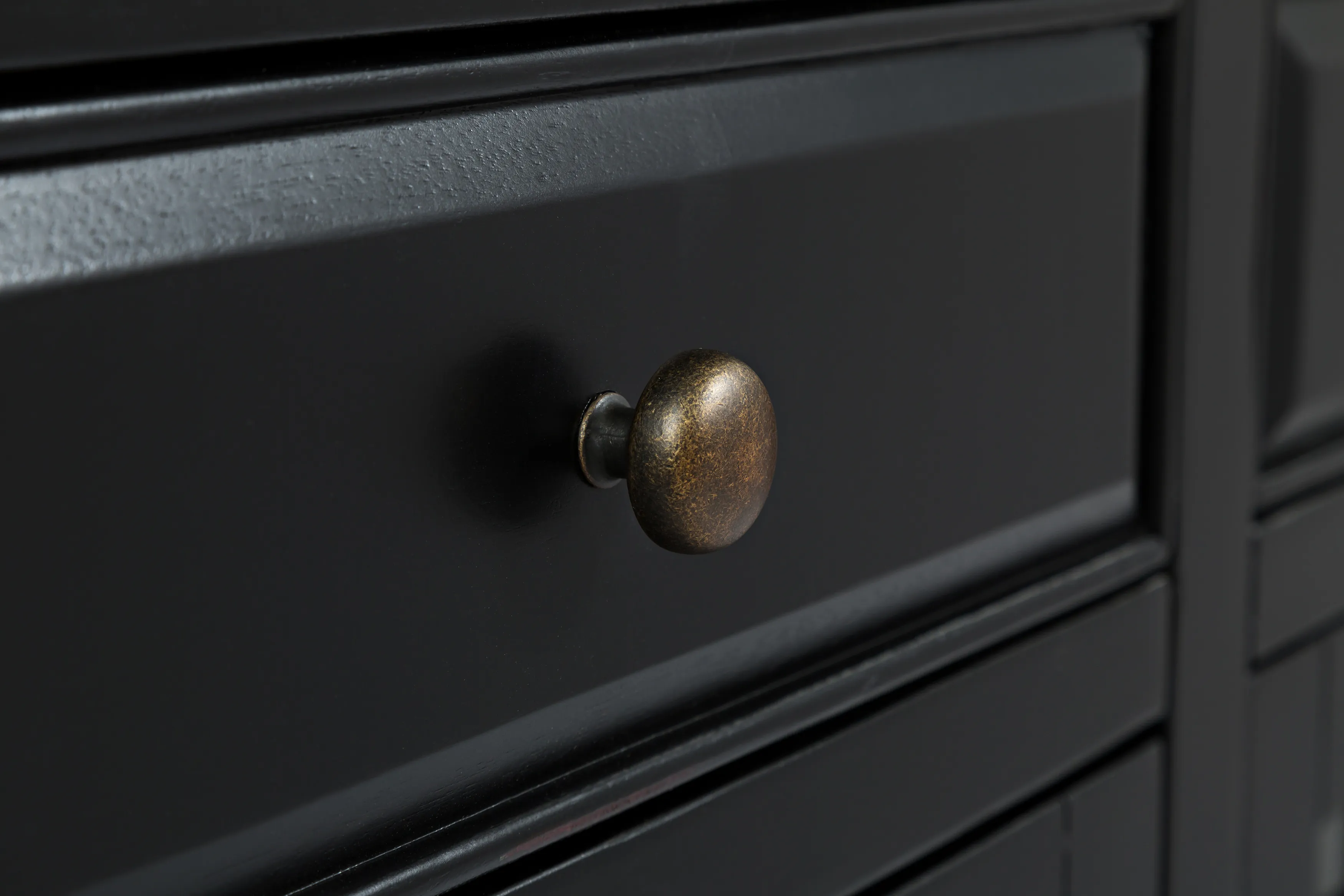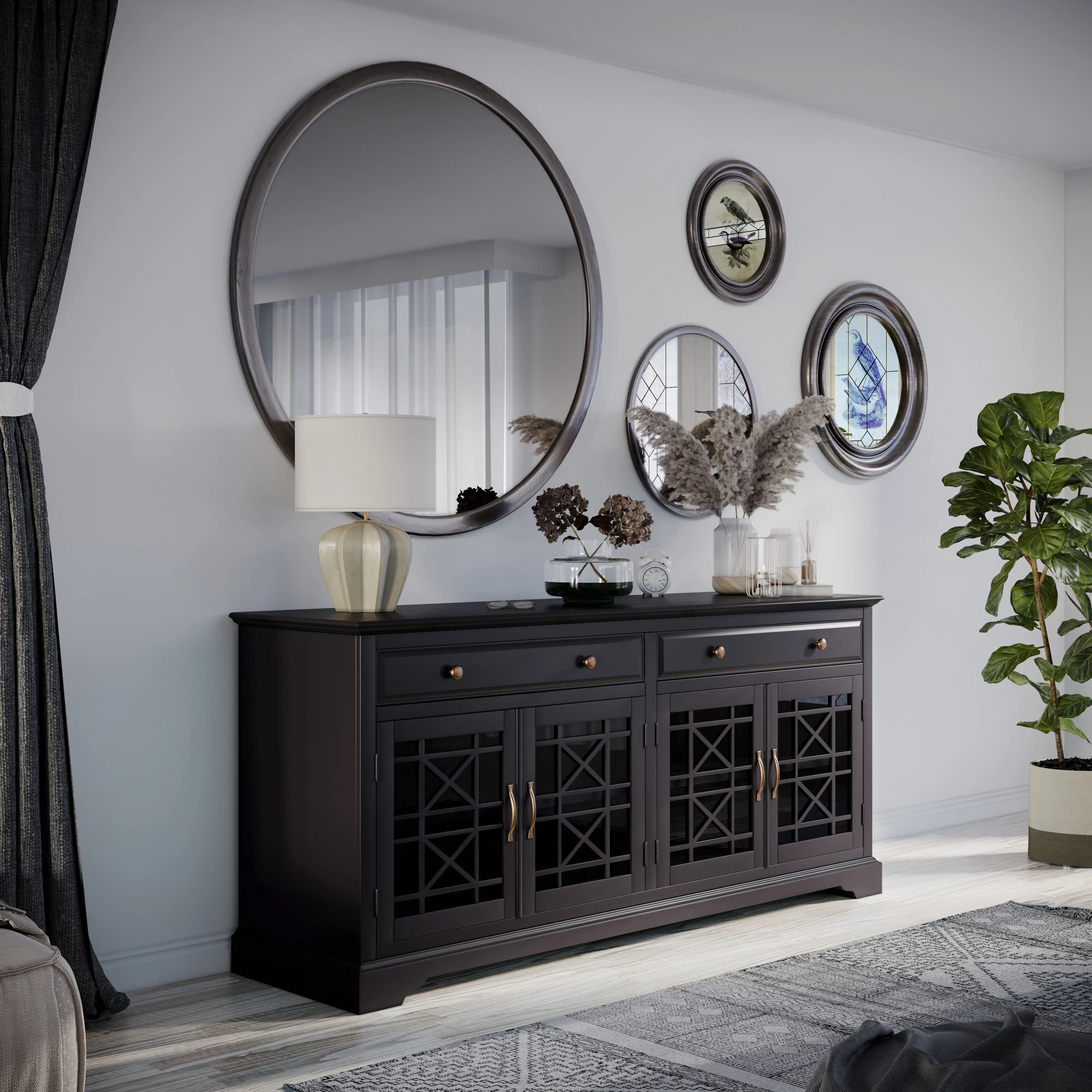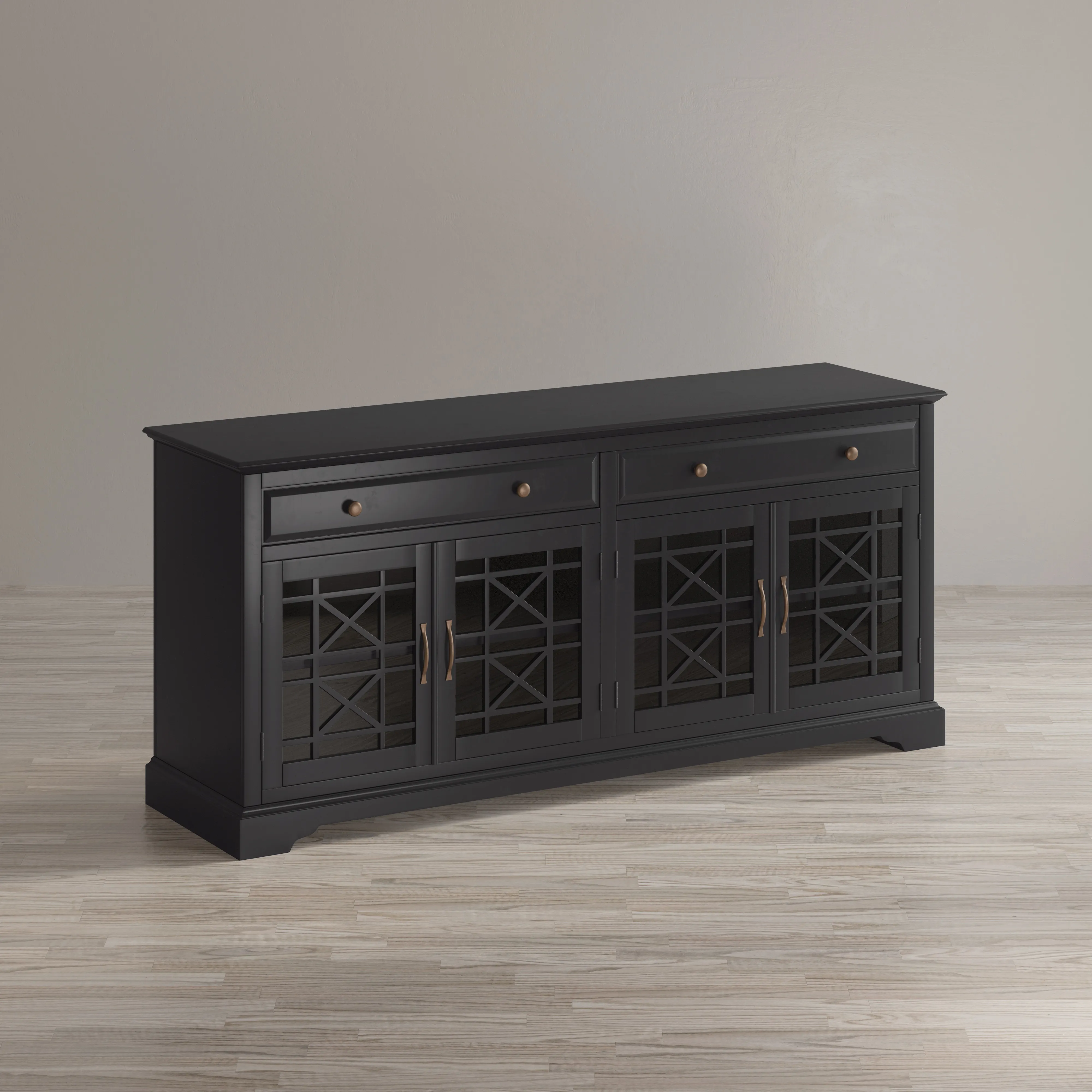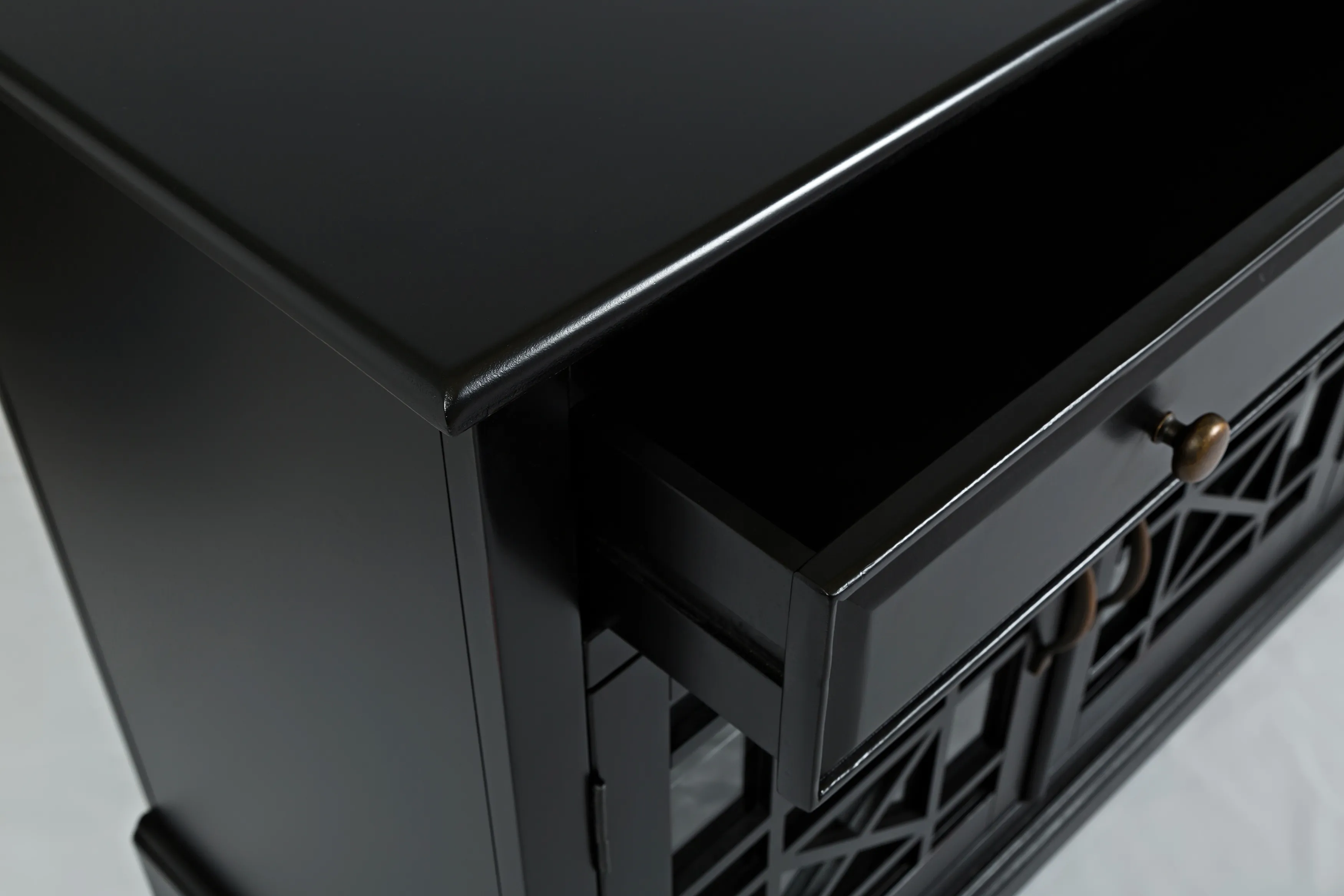 This 70” media and storage unit features a uniquely distressed finish with two drawers and four glass doors. With “X” motif detailing on the doors and rugged hardware, this eclectic piece will add flavor to any room. We are excited to introduce the newest finish to this group- Earl Grey. Soft grey with fret work accents on the doors, this new color is a style camelion and will fit with any décor in any room. Perfect for media, displaying your treasures, or storing dishes, these consoles are available in 70", 60", and 32" widths.