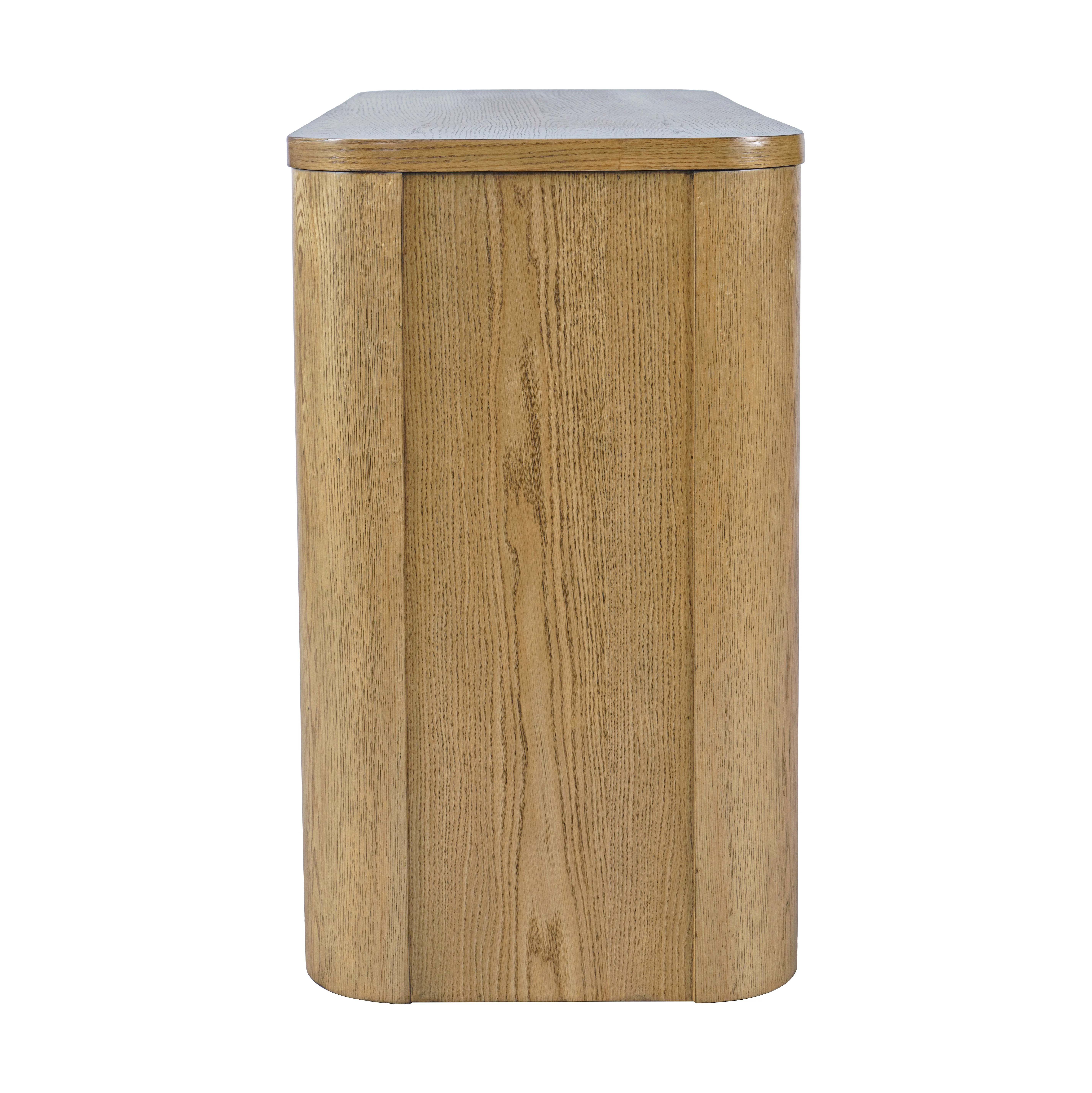 • -Crafted from rubberwood and veneer -50 inch wide top surface for decor and lighting -Two fixed open shelves for storage and display -Rounded corners and softened edges for refined look -Open design keeps profile light and versatile -Blends easily with modern and transitional interiors -Perfect for entryways