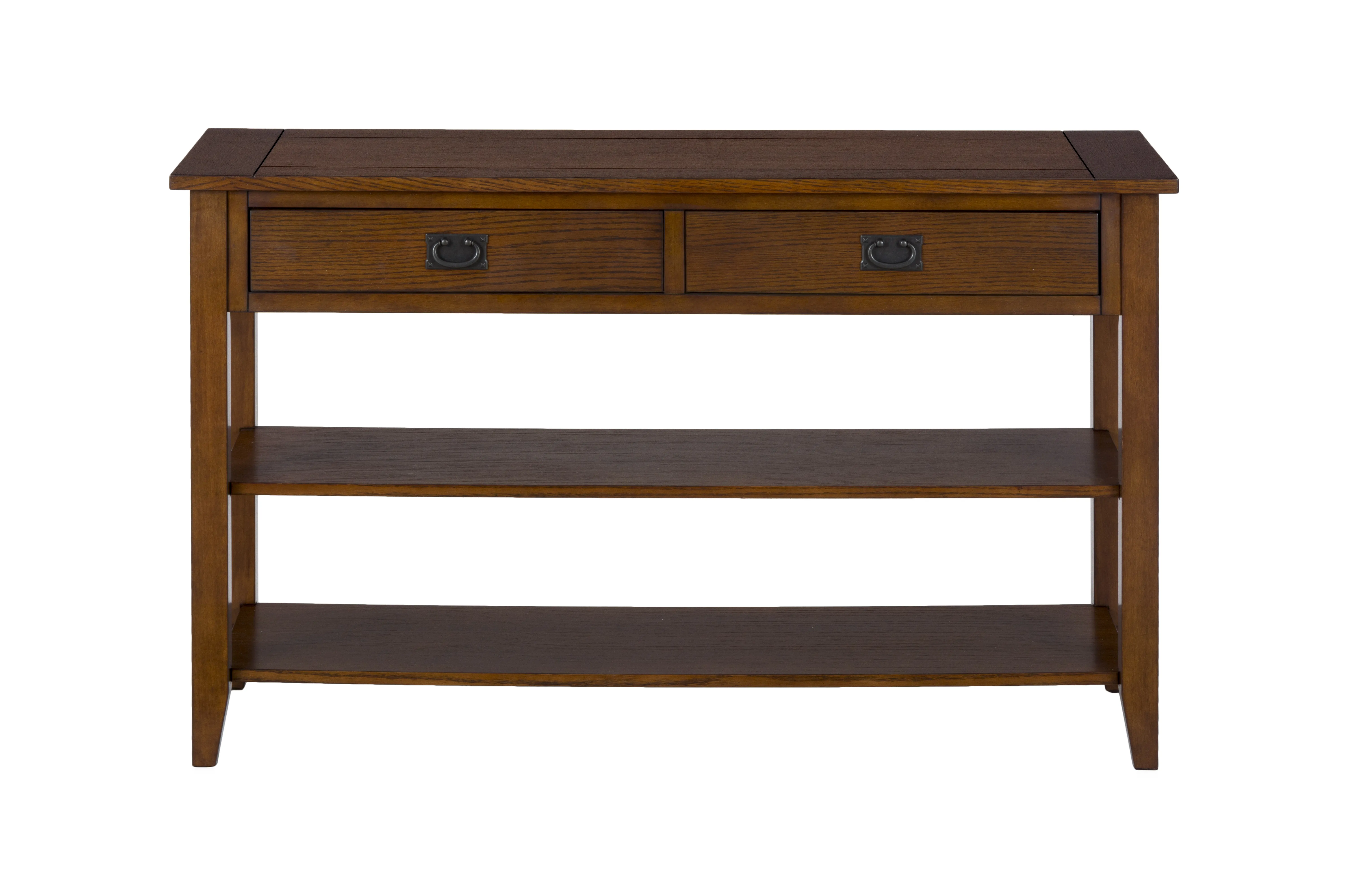The Mission Oak Sofa or Media Table with 2 Drawers and 2 Shelves by Jofran may be available at Old Brick Furniture & Mattress Co. in the