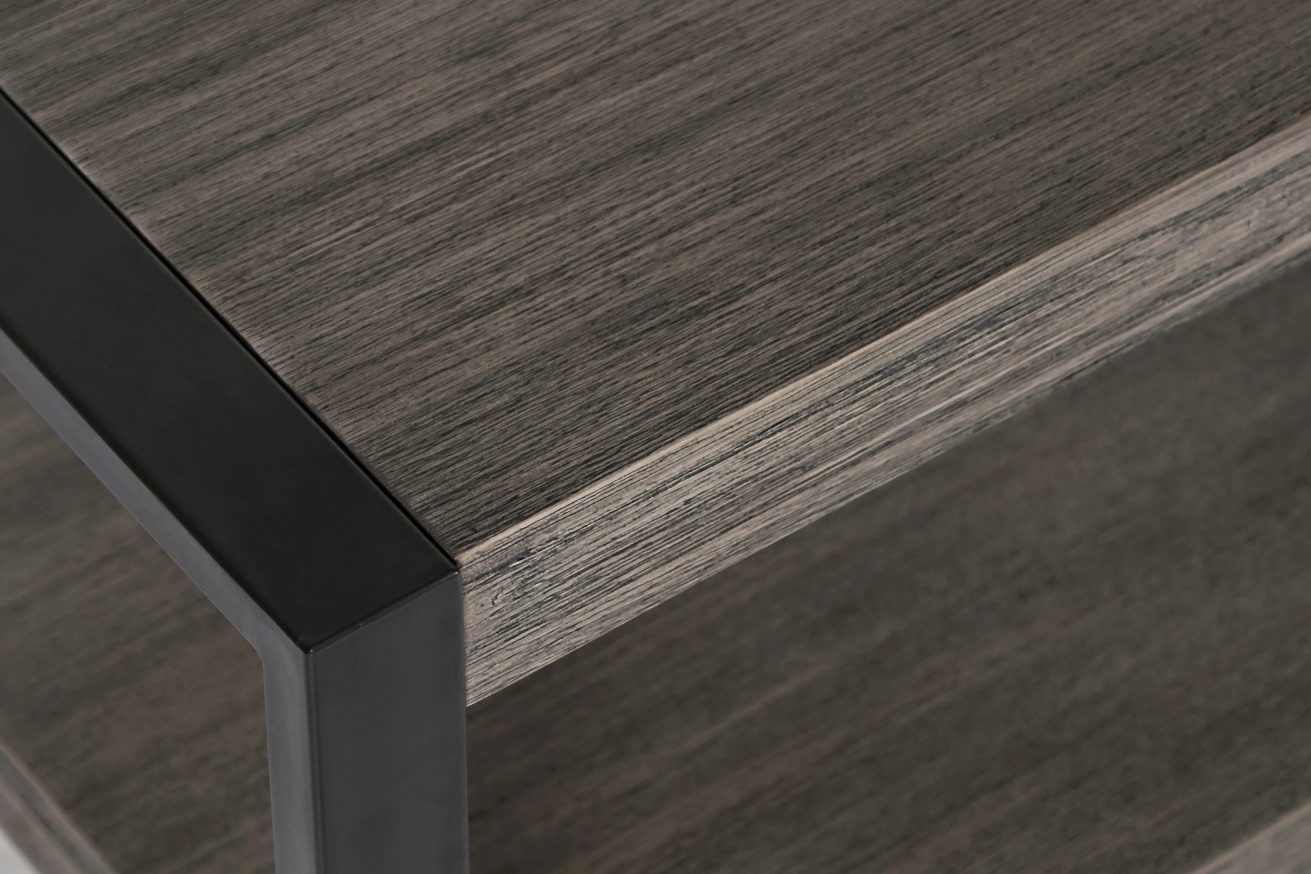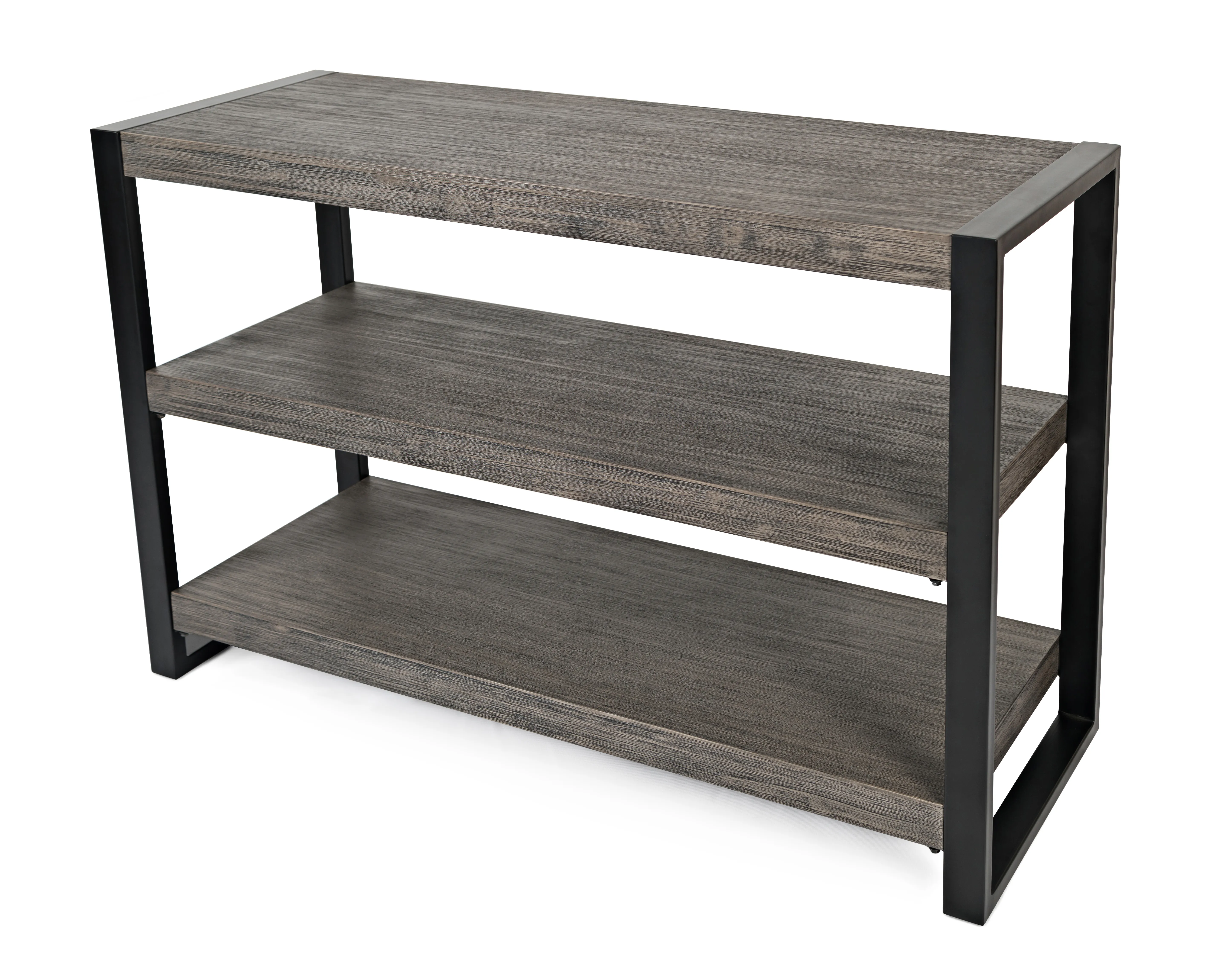 Clean, contemporary design meets industrial style in our Pinnacle collection. This media table combines Acacia solids and wire-brushed veneers with a clean-lined metal frame for a sophisticated look. The shelves offer great storage possibilities for your media needs, books, or your other favorite treasures.