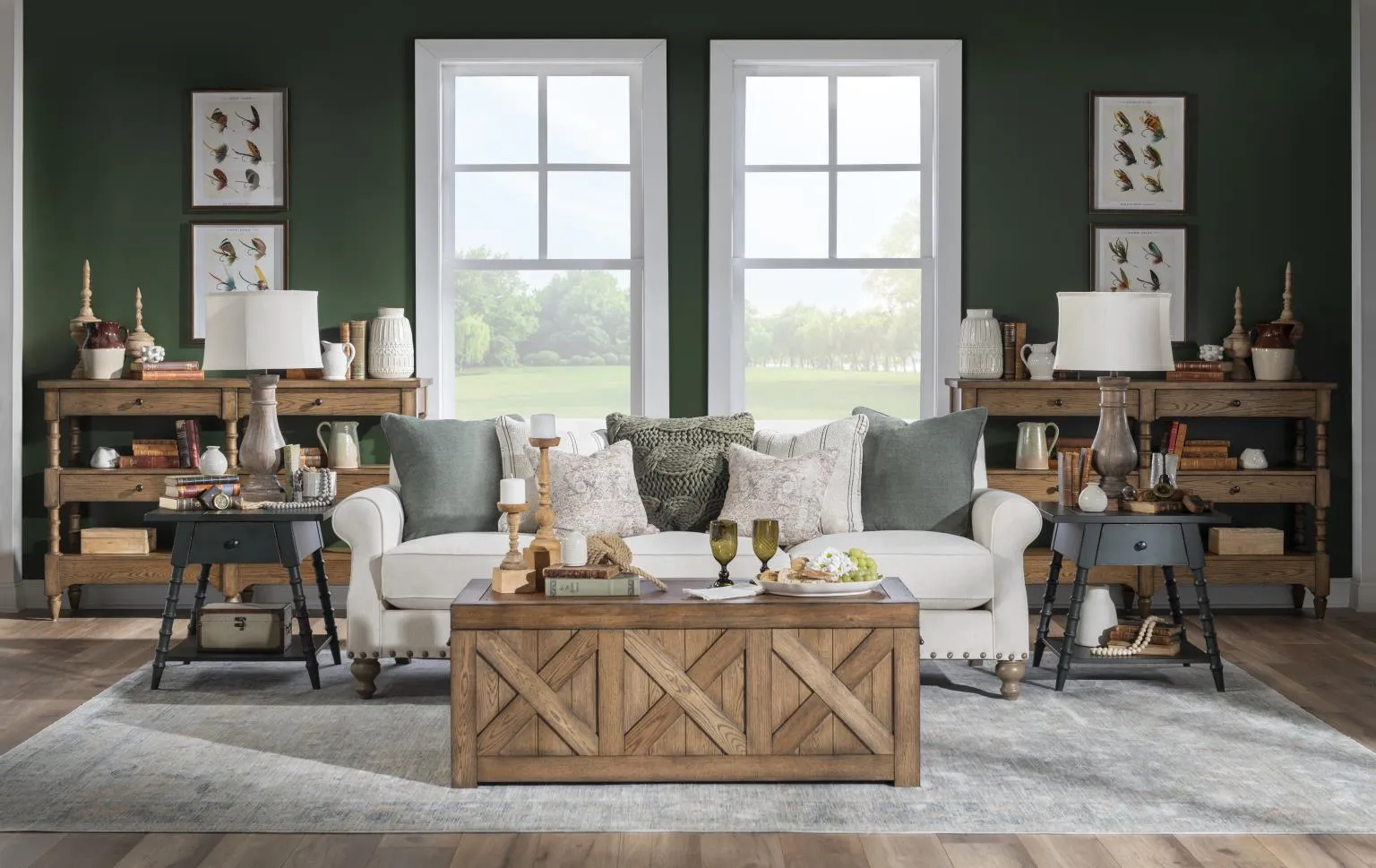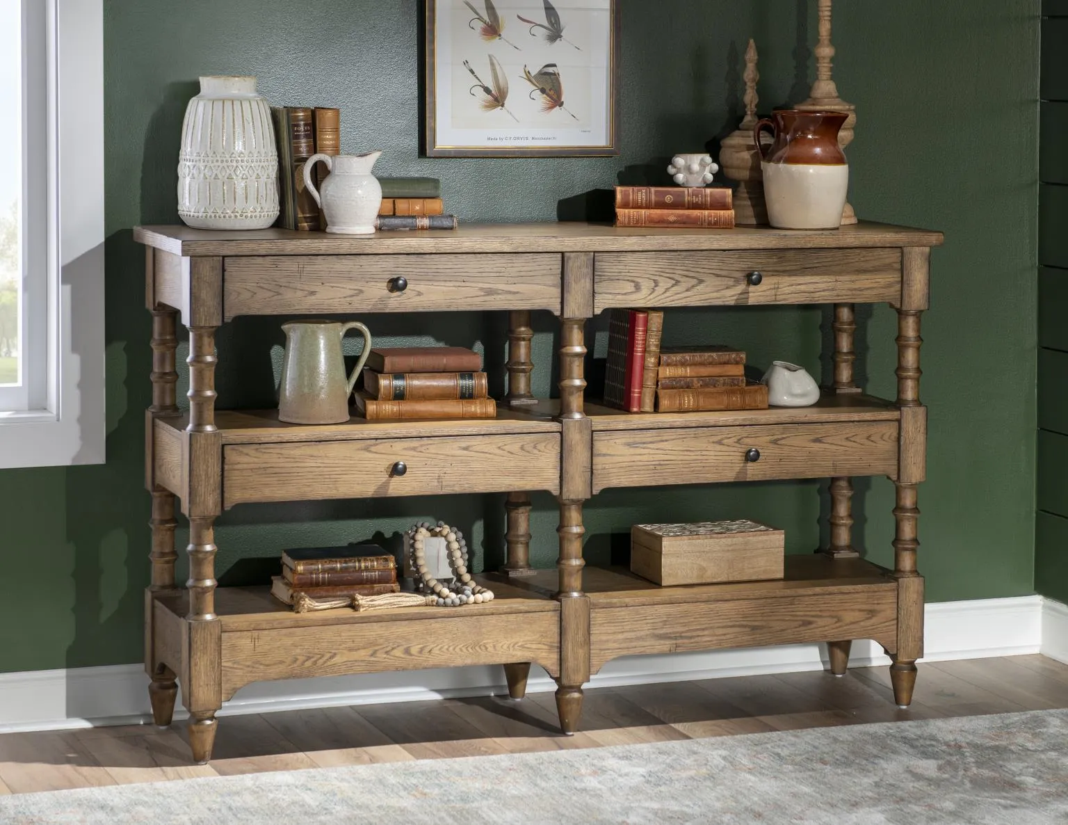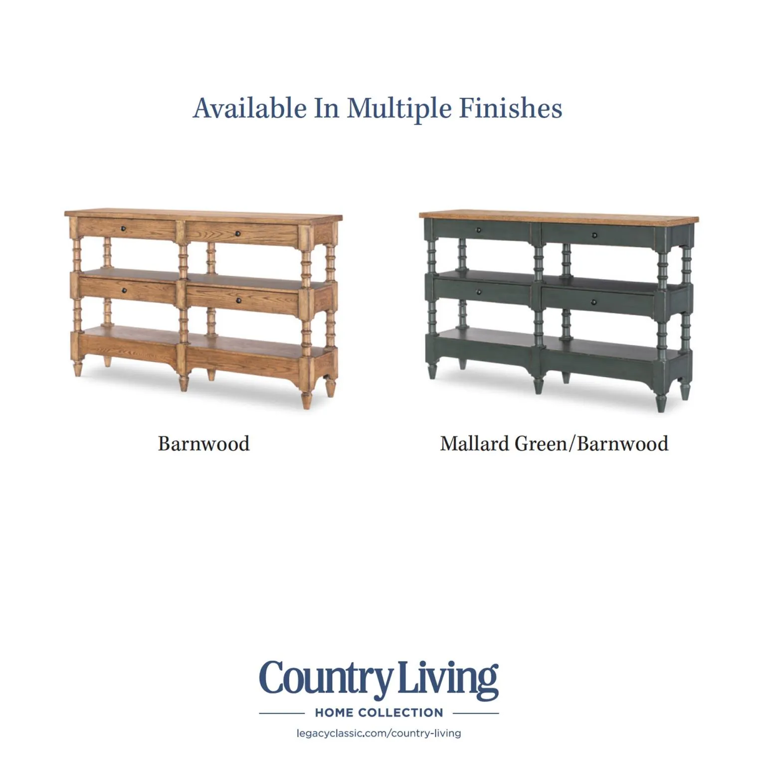 The Country Living Vintage Market Turned Leg Console Table with Drawers in Barnwood by Legacy Classic Furniture is a solid wood farmhouse console table featuring four drawers, two open shelves, and cast iron hardware. Blending traditional craftsmanship and rustic charm, this Barnwood console table brings functional storage and timeless style to entryways, dining rooms, or living spaces—a true reflection of the Country Living lifestyle.