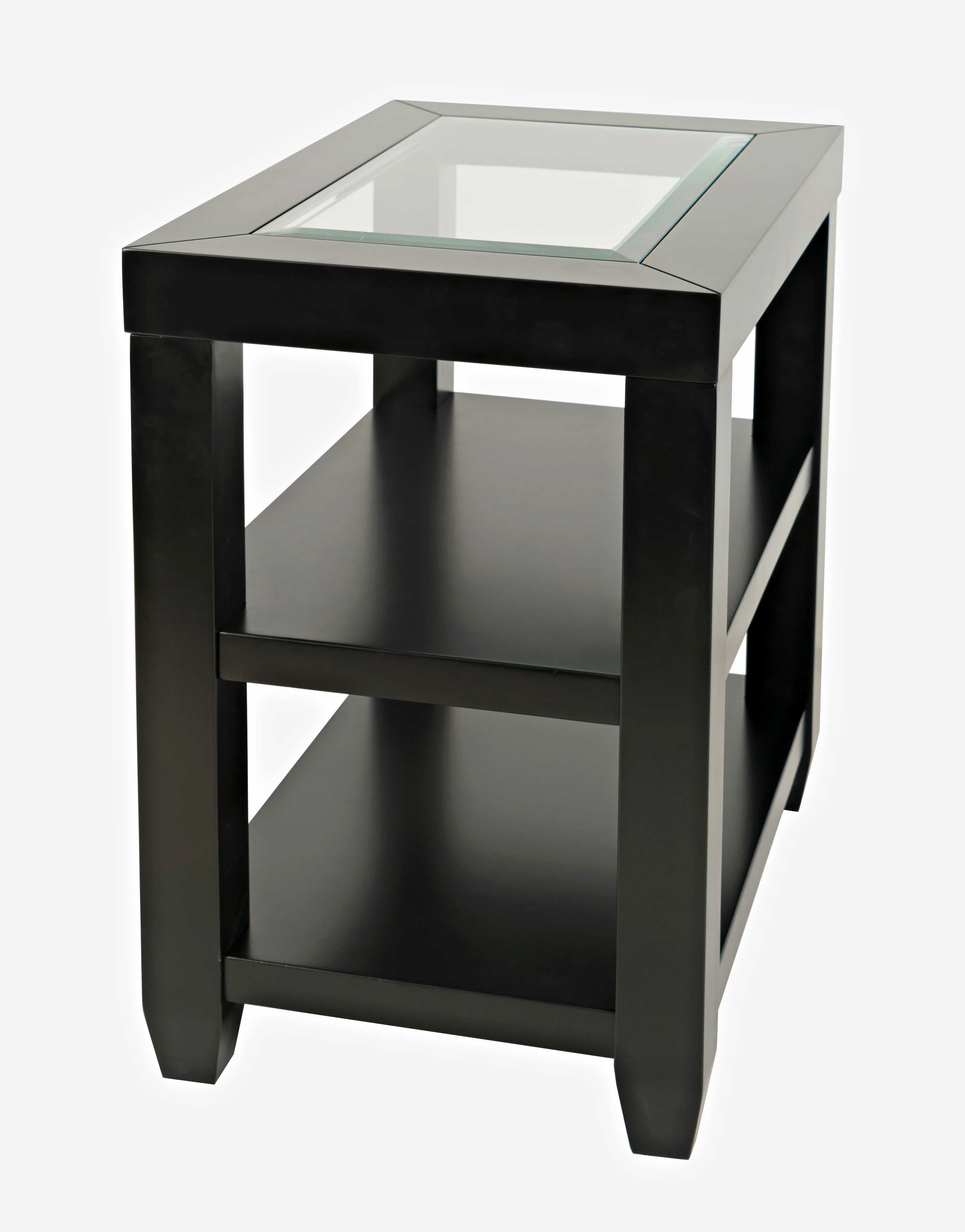 Contemporary style with a solid tempered glass inlay, this Urban Icon Chairside Table features three unique color options and modern beveled edges in a compact design. Two full-length storage shelves are included, and the modern style matches a wide range of home decor. Available In White, Black, and Merlot finishes.