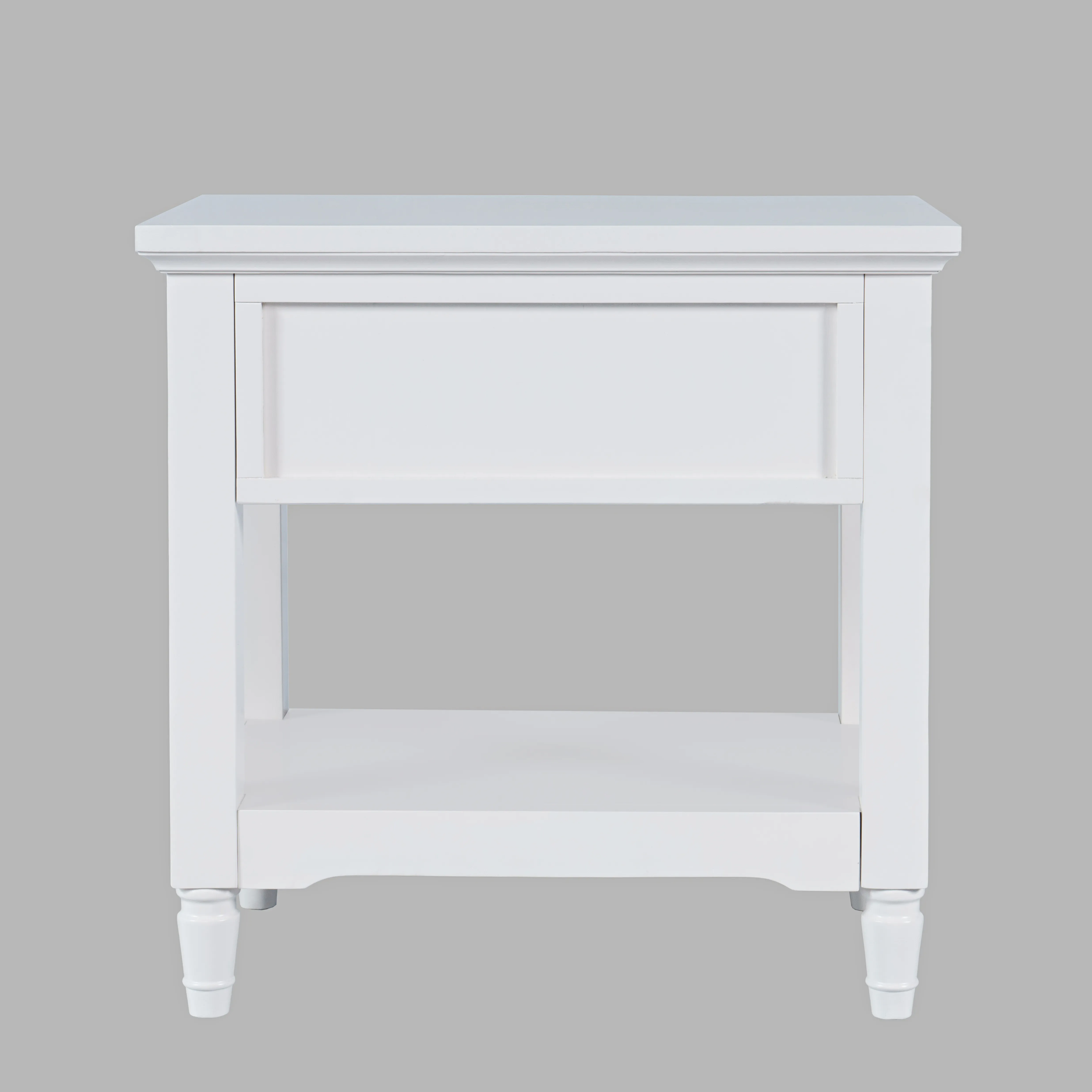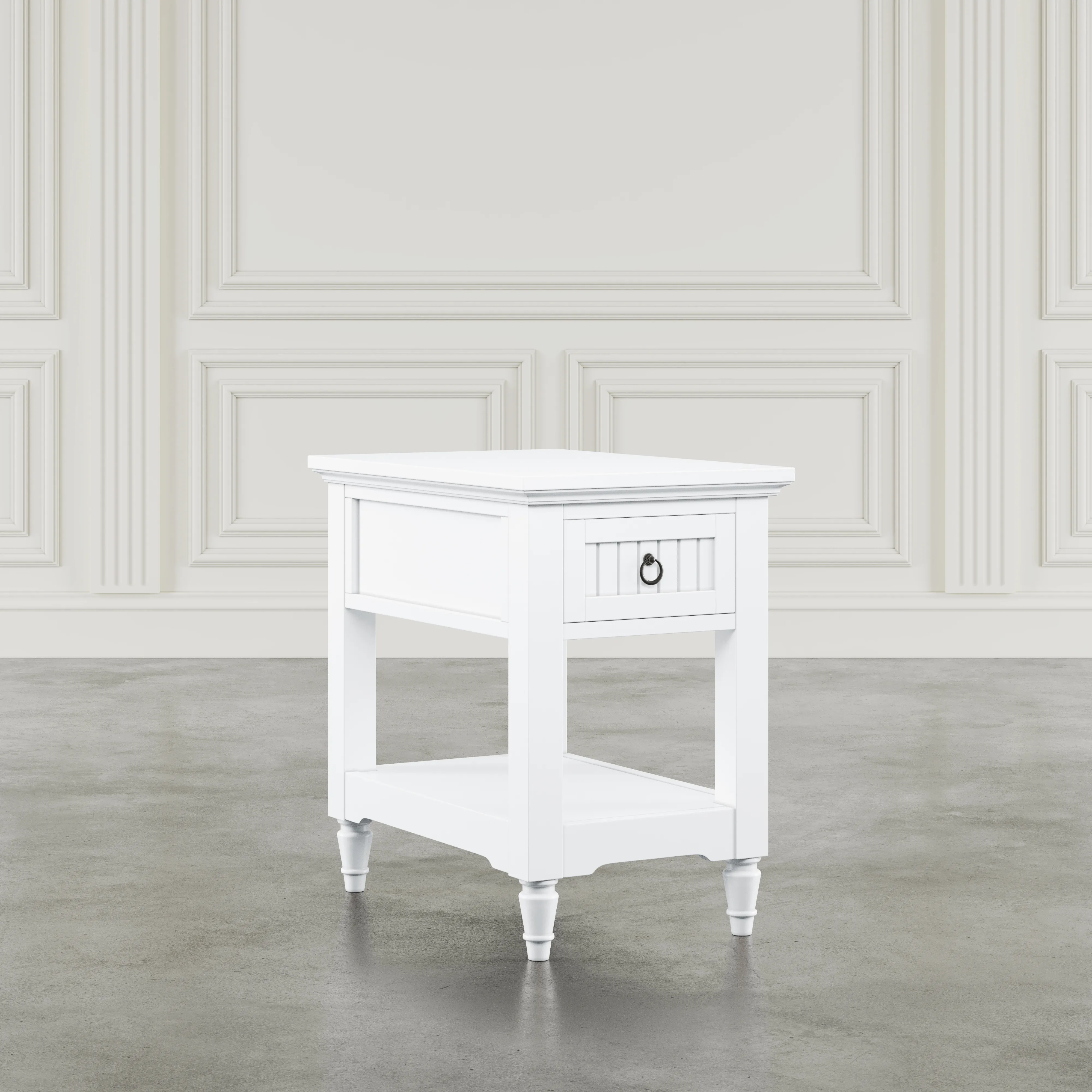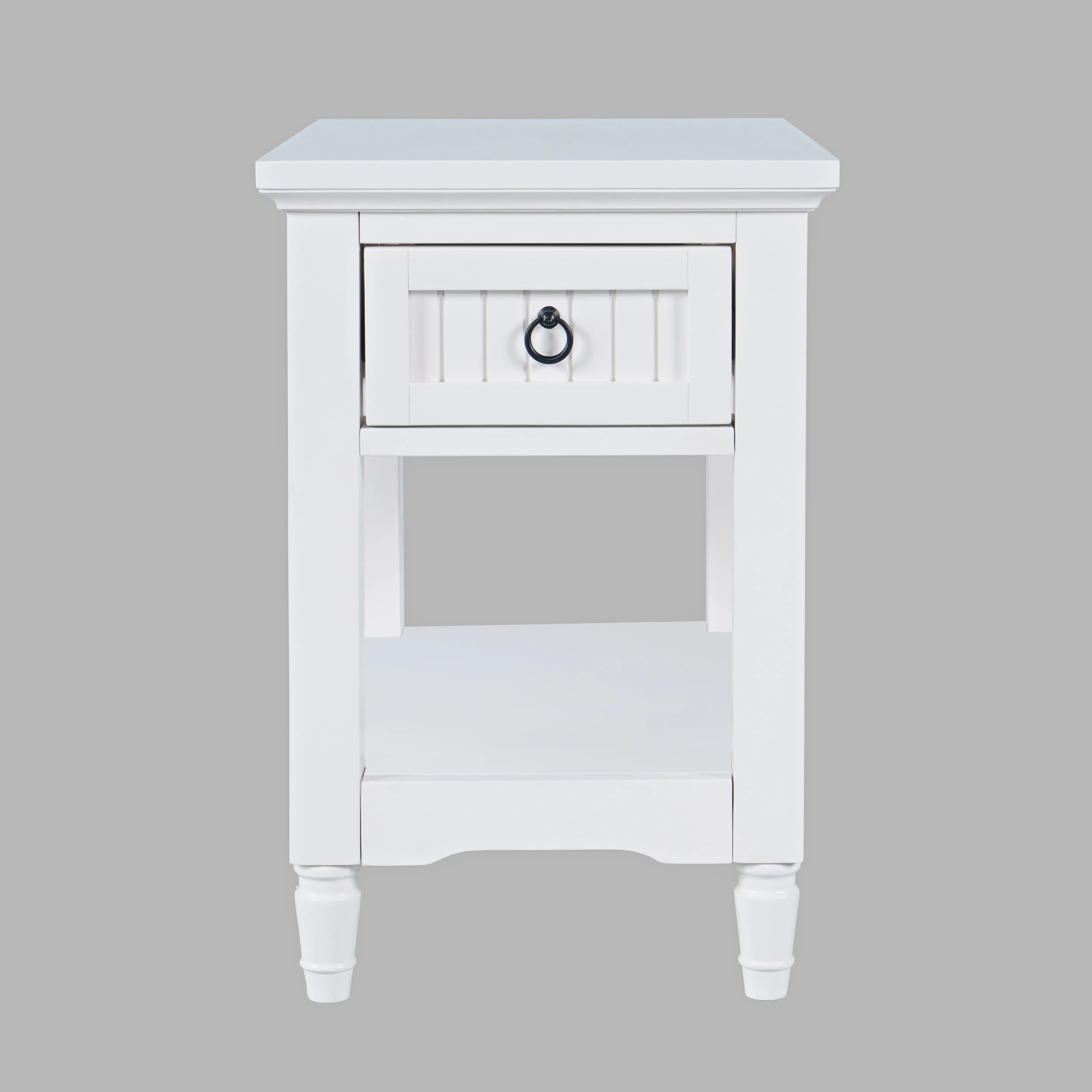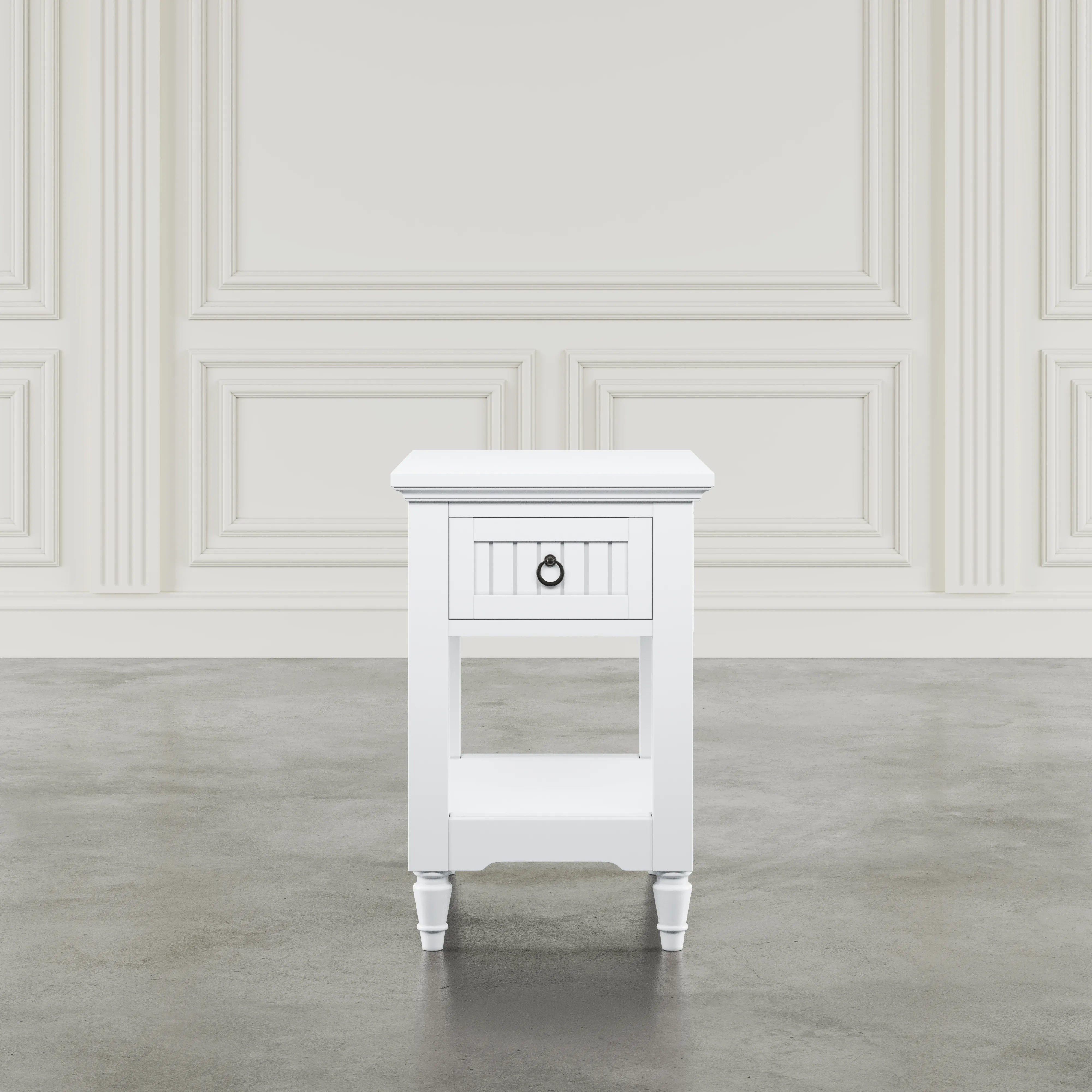 The Westport Chairside Table brings timeless charm and everyday function to your living room or bedroom. Thoughtfully designed with coastal, cottage, and modern farmhouse style cues, this versatile piece works beautifully next to a sofa, recliner, or bed. Crafted from acacia and veneer, the table highlights beadboard-style paneling on the drawer front and a clean painted finish that feels light and inviting. A spacious open shelf provides the perfect spot for displaying books, baskets, or decorative accents, while the top surface offers plenty of room for a lamp or framed photos. The single drawer keeps smaller essentials tidy and within reach, making it ideal for remote controls, chargers, or notepads. Turned legs and simple ring-pull hardware add a touch of classic character without overpowering the design. Compact in footprint yet generous in utility, this chairside table is a natural fit for casual interiors that embrace relaxed elegance. Whether styled in a coastal retreat or a modern farmhouse setting, it offers both beauty and practicality in equal measure.