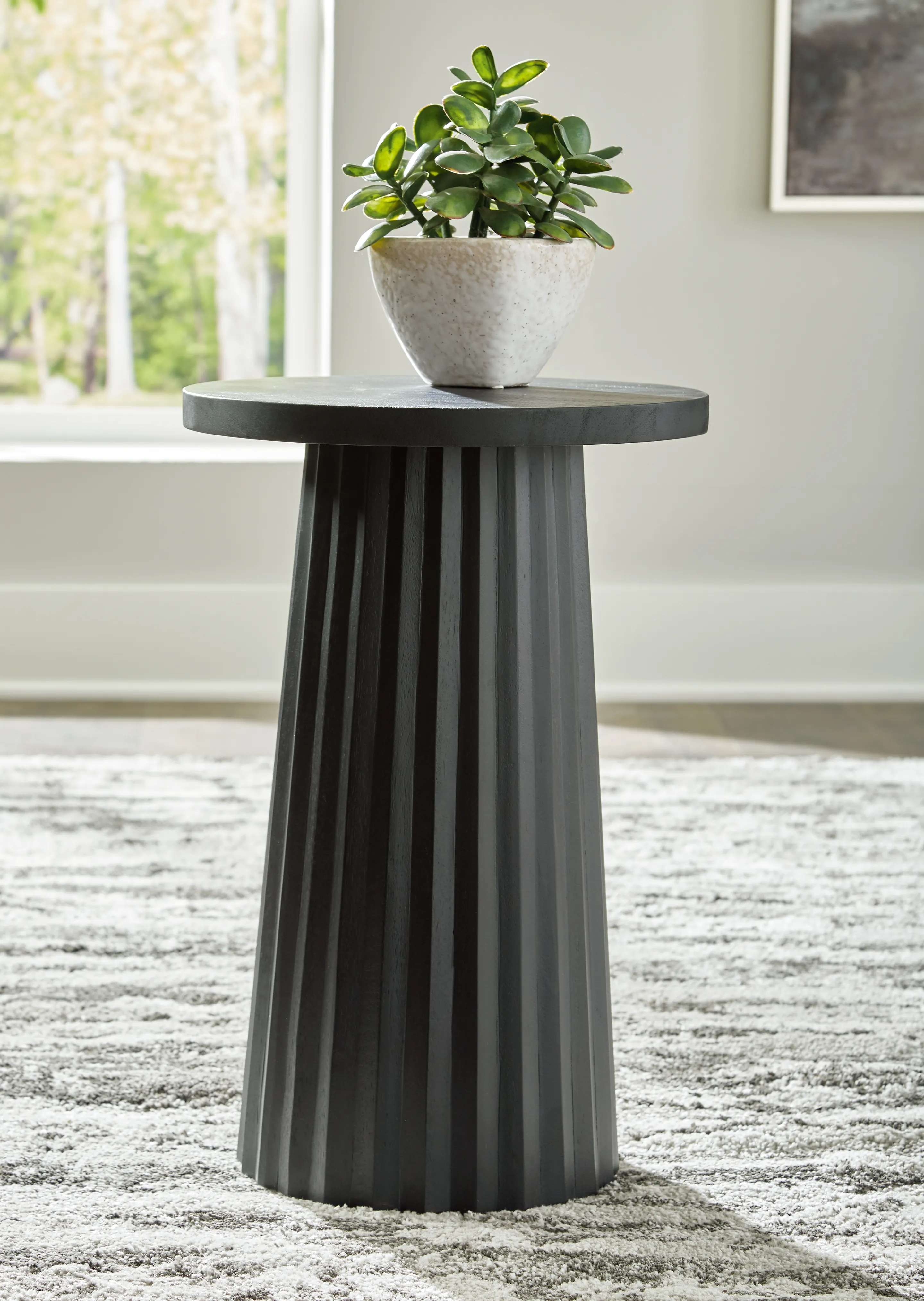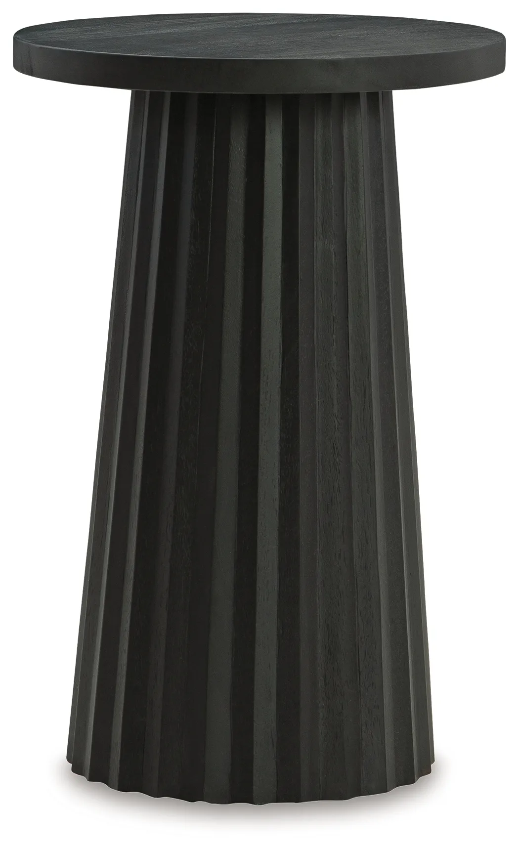 The Ceilby Accent Table in Black is a modern solid-wood pedestal table with a fluted base and textured wire-brushed finish, ideal for contemporary living rooms, bedrooms, or entryways. This sculptural black accent table adds bold style and functional elegance to any space.