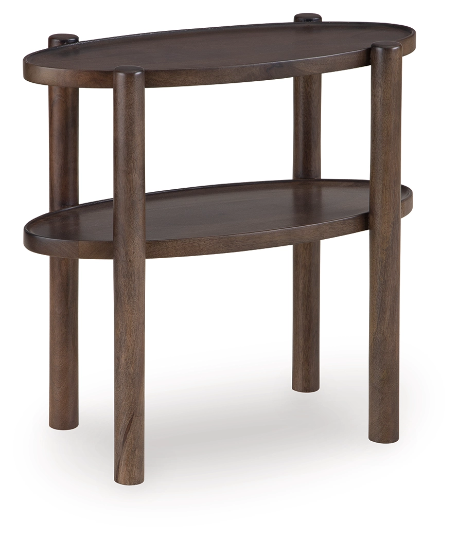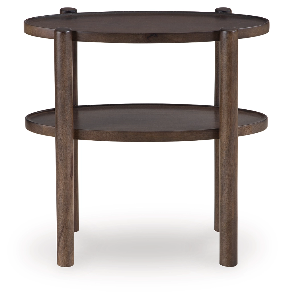 Instantly upgrade any corner with this smart accent table. It's made from solid mango wood in a sophisticated gray-brown finish, with rounded post legs that add a soft feel to a variety of decors. Practical raised edges on both tiers keep essentials securely in place.
