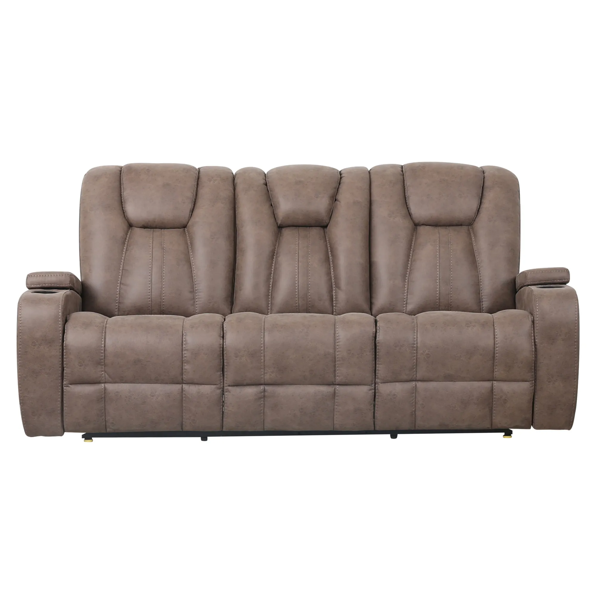 Bring comfort and convenience home with the Marlow 3-Piece Set featuring a sofa with drop-down console, console loveseat with lift-top storage, and matching recliner, all in a warm sand farbic. Dual manual reclining seats let everyone relax in plush comfort accented by stylish baseball stitching. Multiple cupholders, hidden storage, and built-in charging keep drinks, devices, and essentials within easy reach. Wrapped in soft, easy-care faux suede, Marlow delivers lasting comfort, smart functionality, and everyday value—perfect for movie nights, game days, and casual lounging.