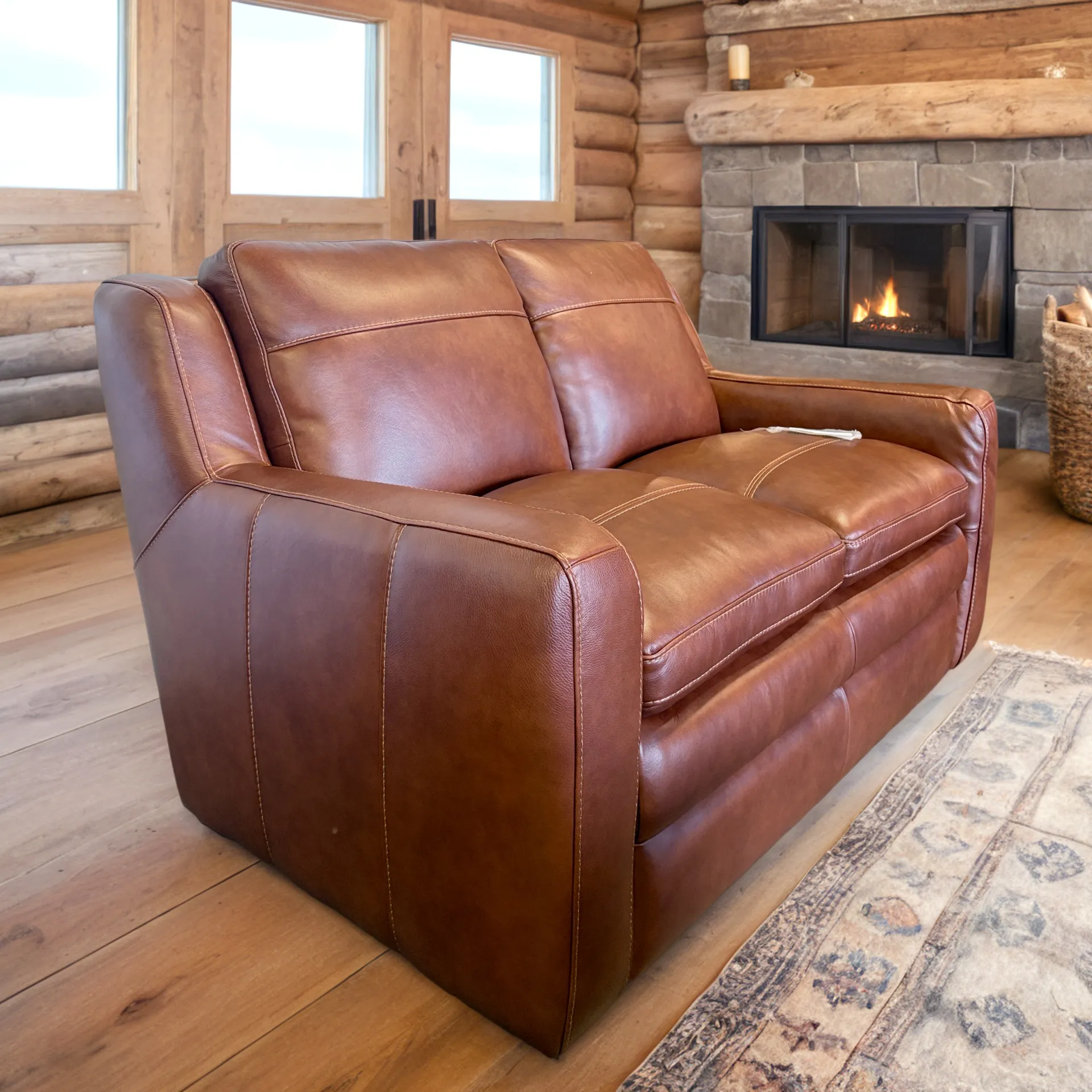 - Premium top-grain leather upholstery in a warm chestnut hue offers rich texture and refined appeal, built to age gracefully.