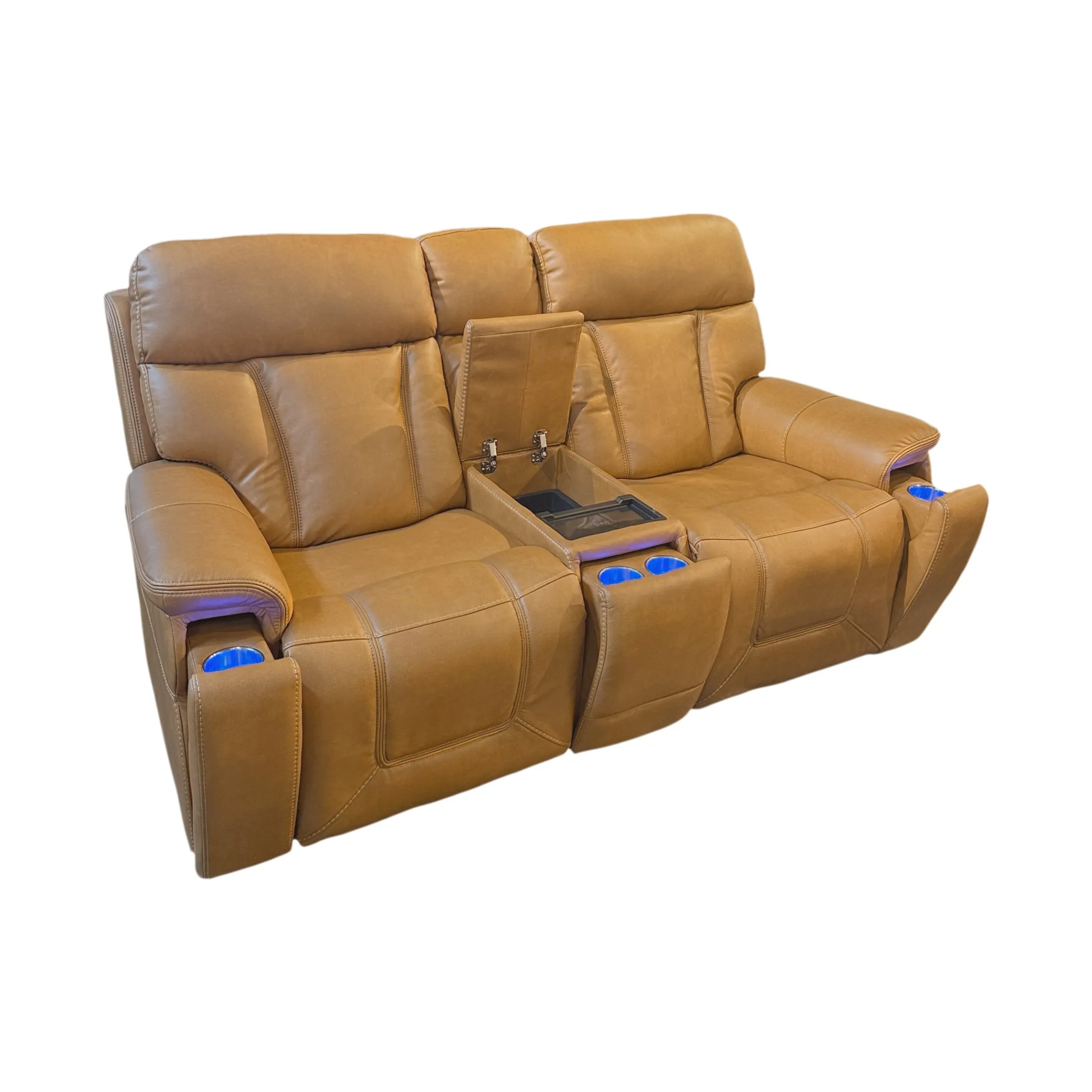 The MotoMotion Fraser Immersive Audio Leather Console Loveseat – Caramel Brown combines Triple Power reclining, Zero Gravity comfort, and Bluetooth surround sound with ambient LED lighting and convenient storage. Wrapped in supple top-grain leather, this modern home-theater loveseat delivers superior sound, style, and relaxation for today’s connected entertainment spaces.