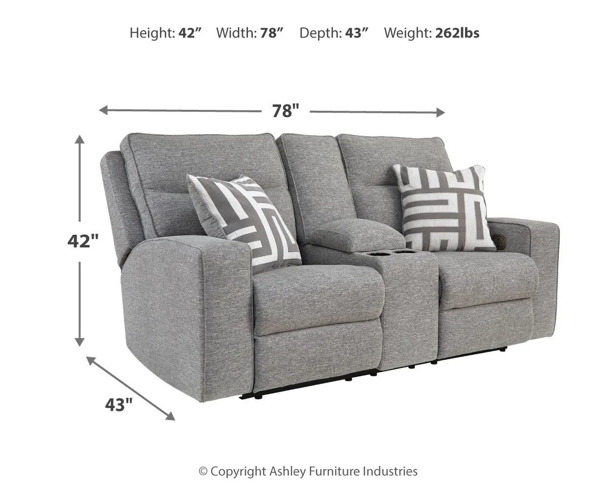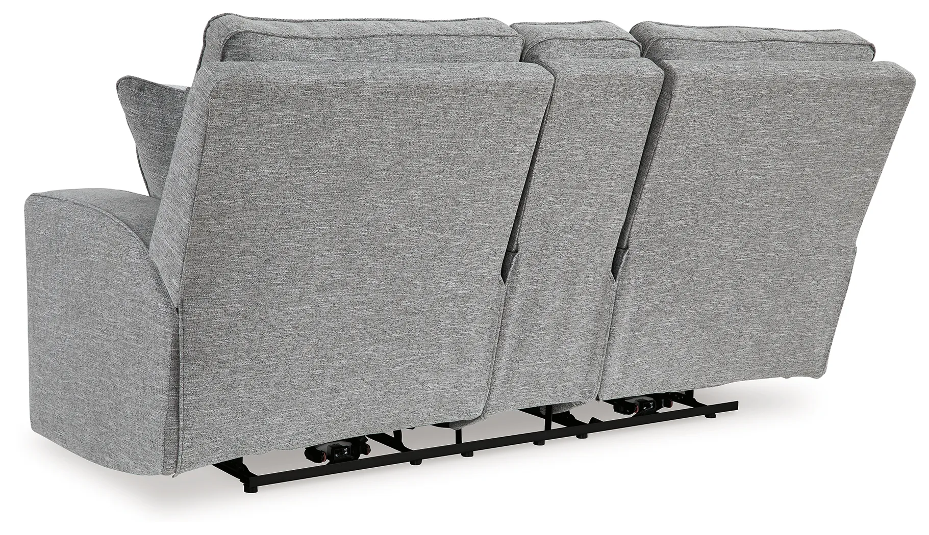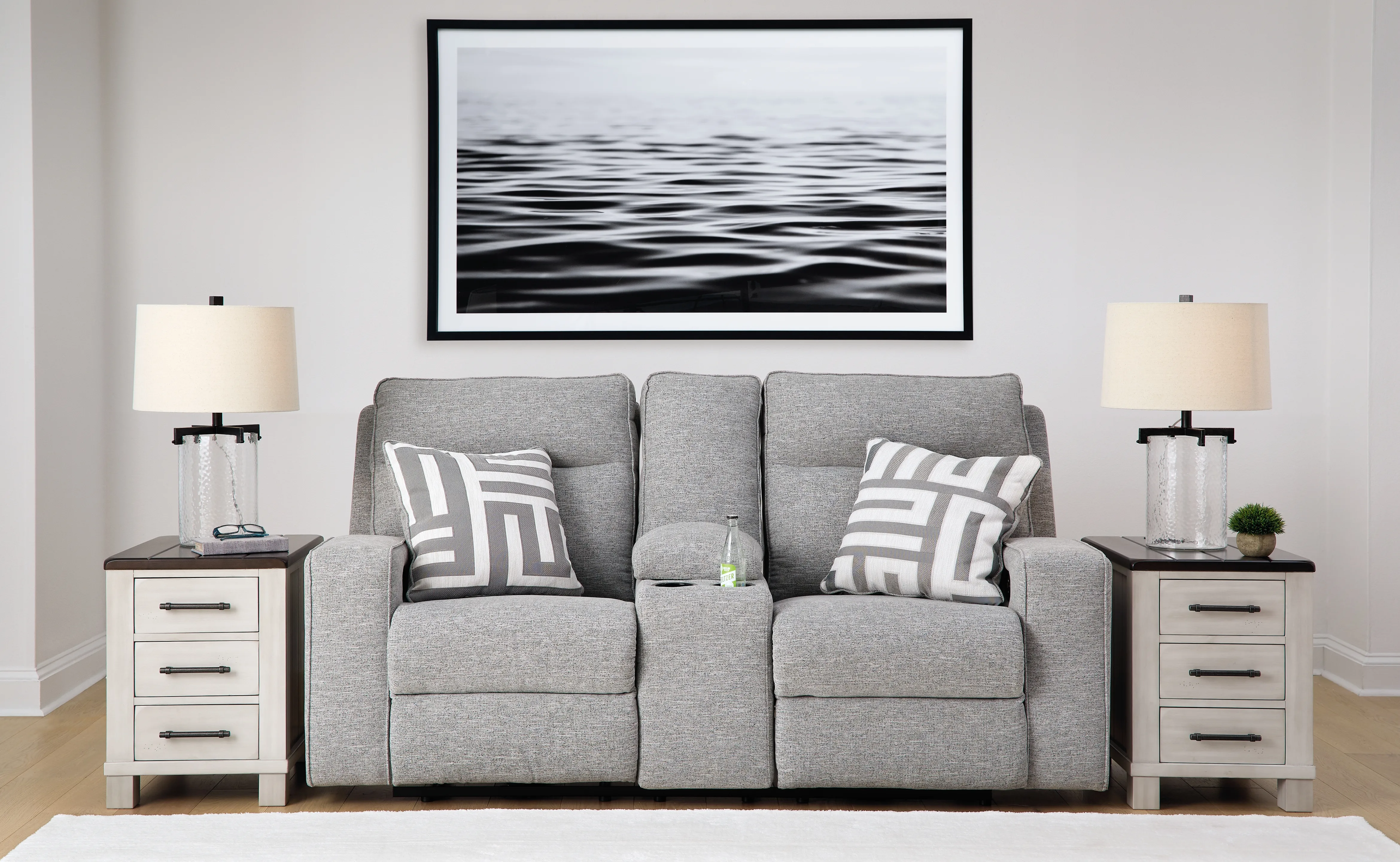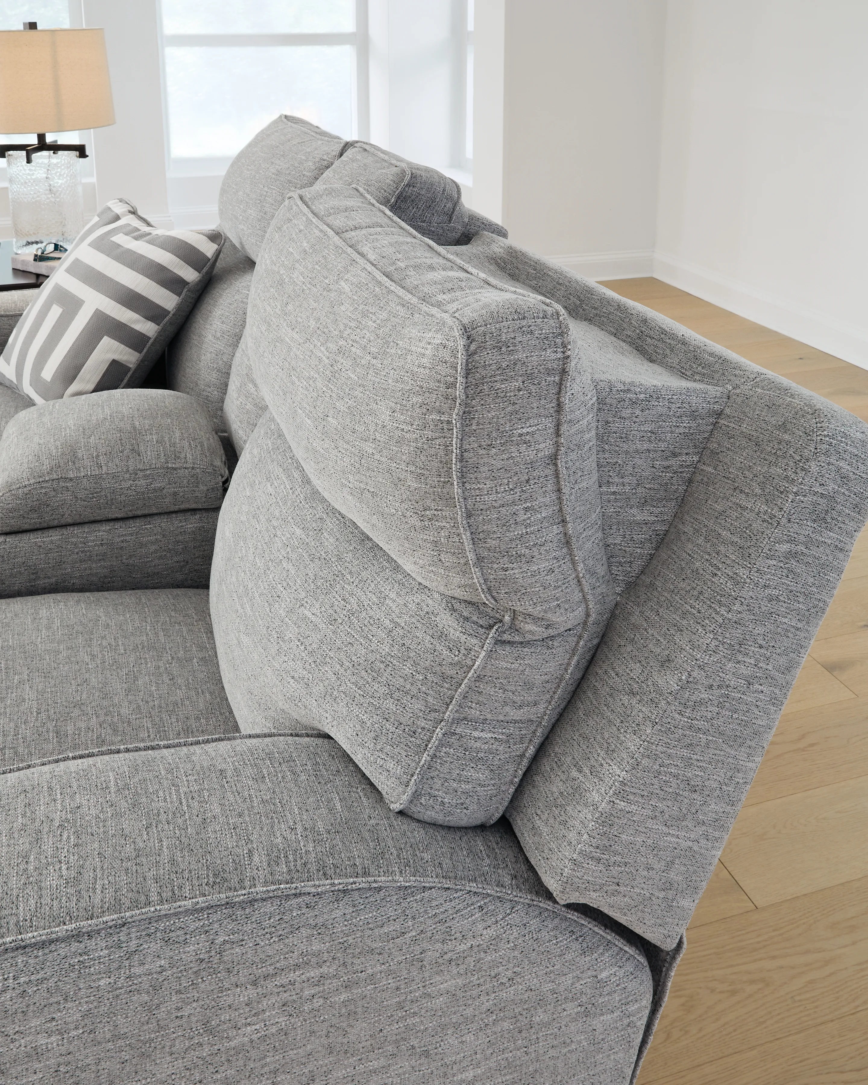 If style is the question, then this power reclining loveseat is the answer. Its clean-lined profile is beautifully contemporary. High-performance fabric and plump cushioning make it so easy to comfortably kick up your heels. The adjustable Easy View™ headrest allows a primo view of the TV, and the extended ottoman provides extra room to really stretch out. Simply sit back, chill out and recline away—this loveseat is designed to be your favorite seat in the house.