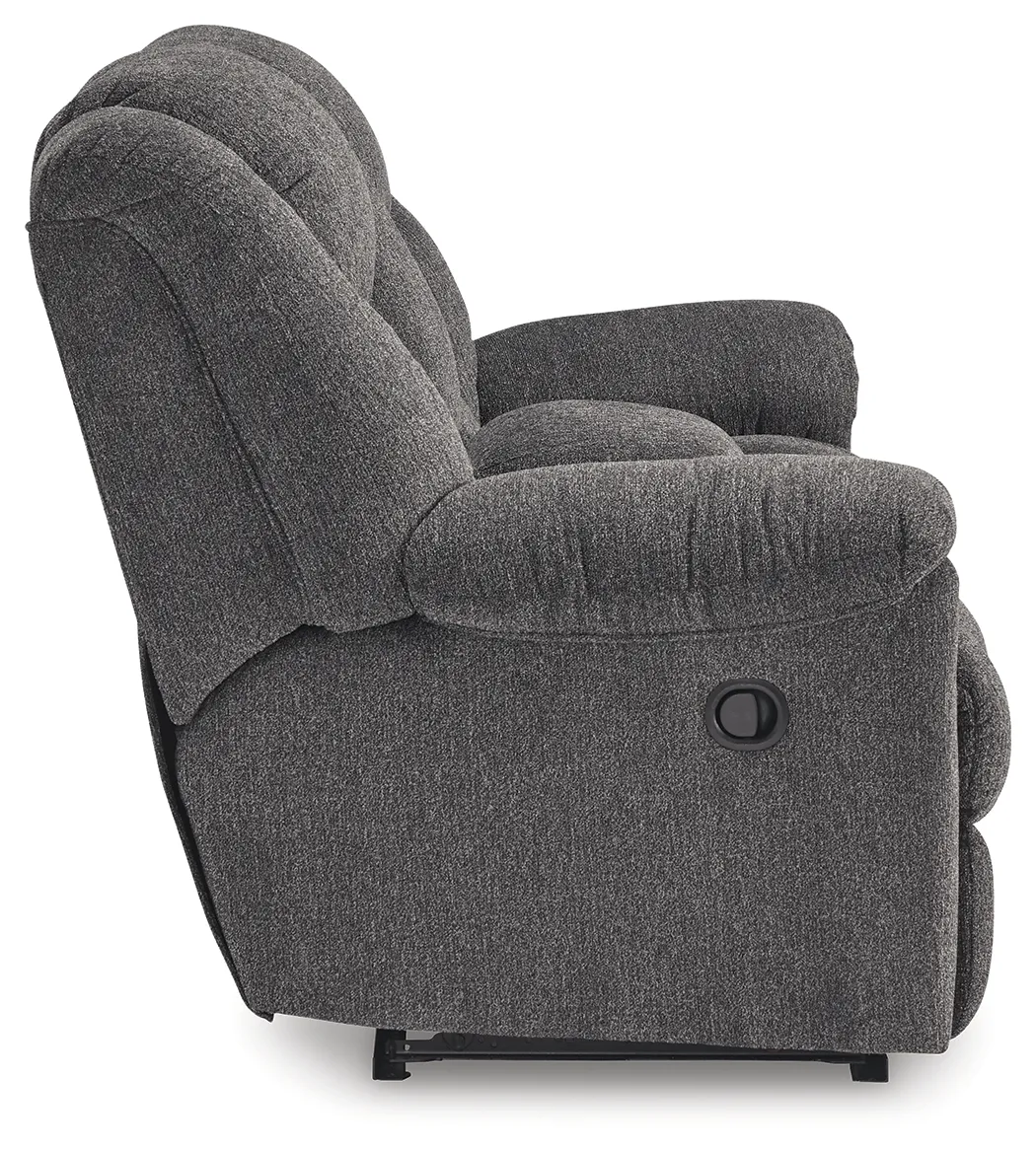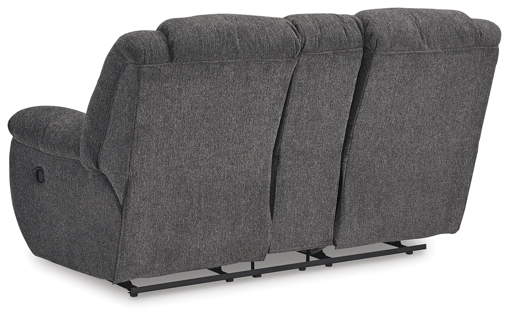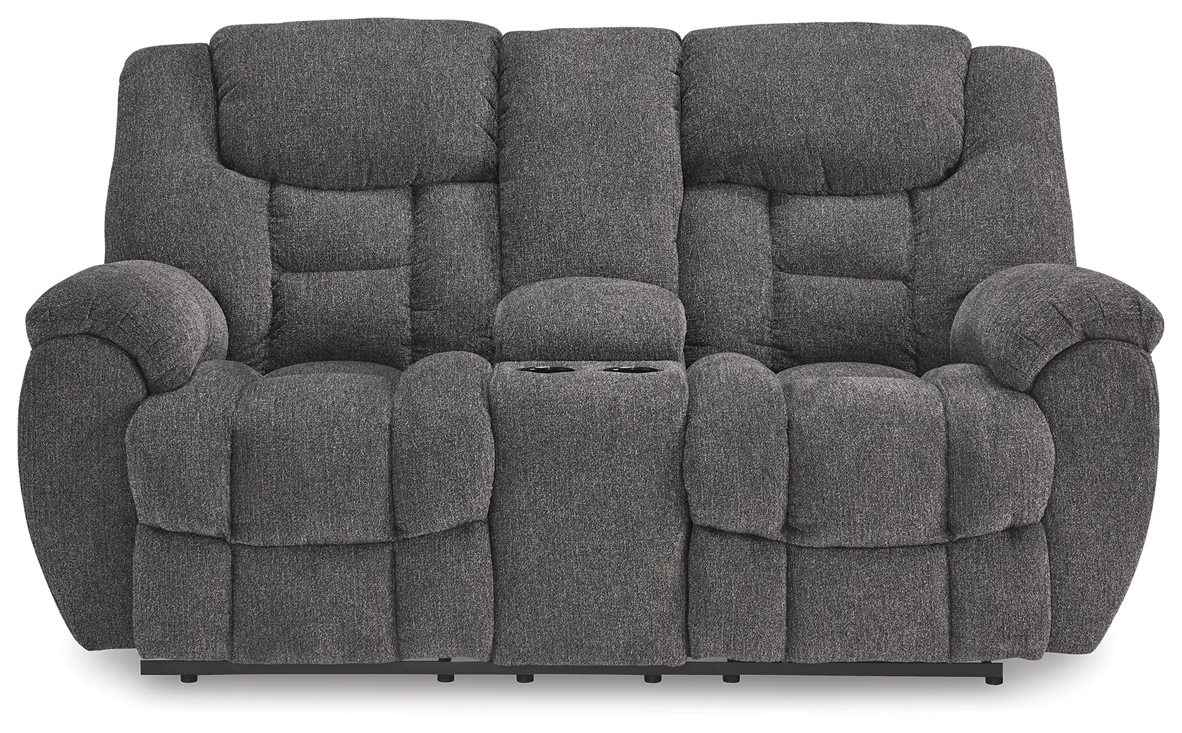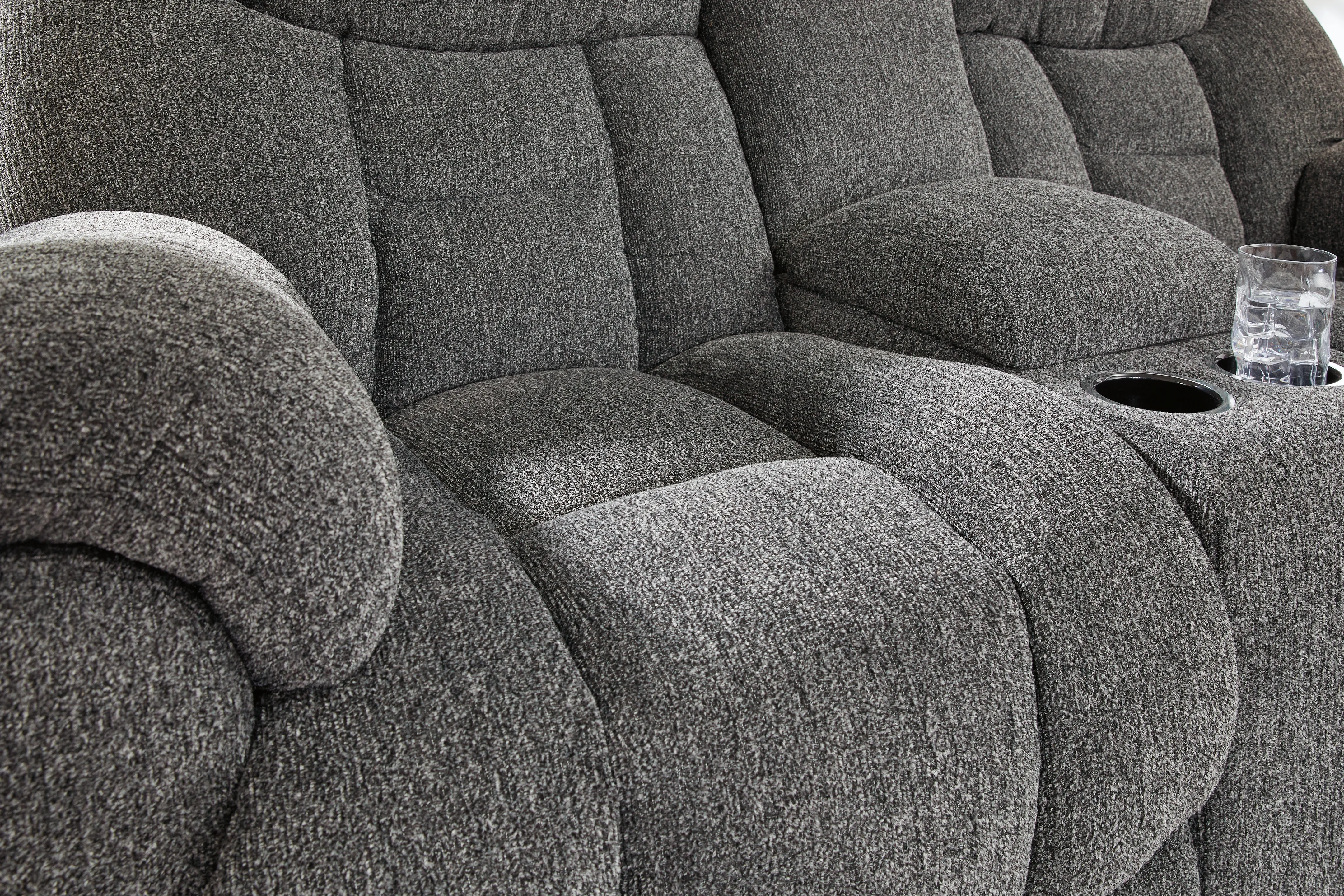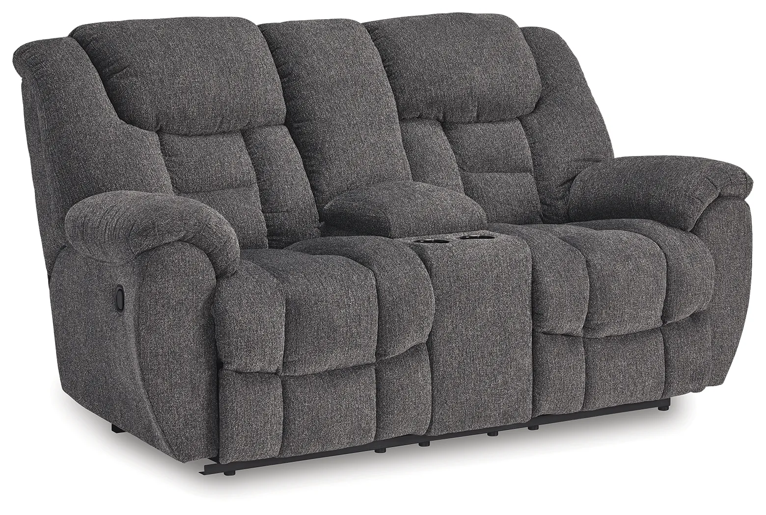 Sometimes seeing is believing. And you can rest assured that this reclining loveseat with console is every bit as indulgent as it looks. Designed to put you in the lap of luxury, the generously scaled seating—wrapped in a wonderfully plush and practical charcoal gray Next-Gen Nuvella™ upholstery—sports pillow-wrapped armrests and curvaceously cushioned head-neck support for feel-good flair.