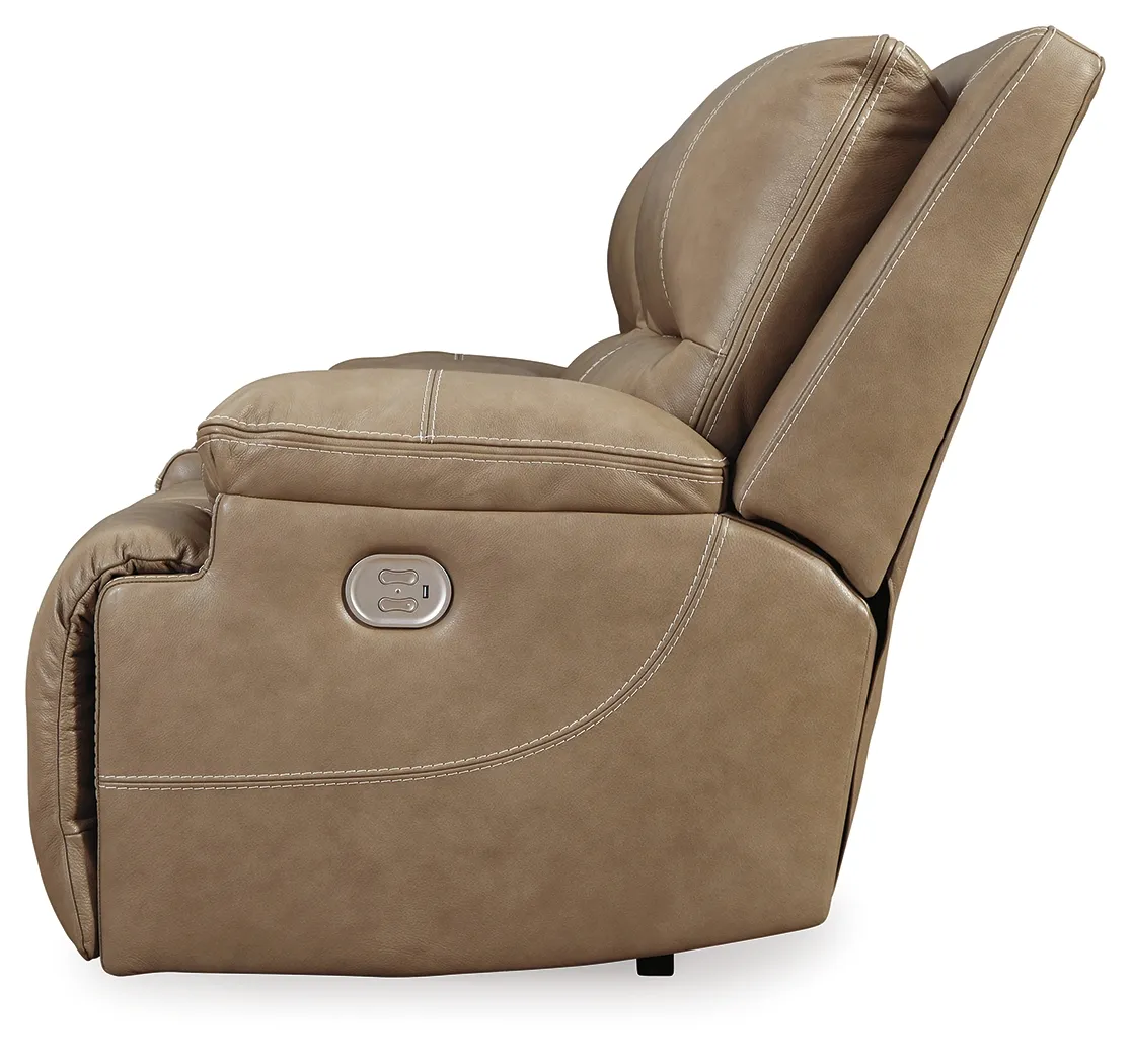Life is so much better when you can enjoy the pleasure of real leather-at a price to put you at ease. That's exactly what you get with this power reclining loveseat with adjustable headrest. Thanks to real leather throughout the seating area, you've got a reclining loveseat that feels like a million bucks but won't break the bank. Tailored to those with an eye for contemporary design, this power reclining loveseat is dressed to impress with an upscale matte finish, clean-lined divided back tufting, distinctive jumbo stitching and chic pillow top armrests. Perhaps best of all: Easy Viewâ„¢ power adjustable headrests let you recline back and still have a primo view of the TV.