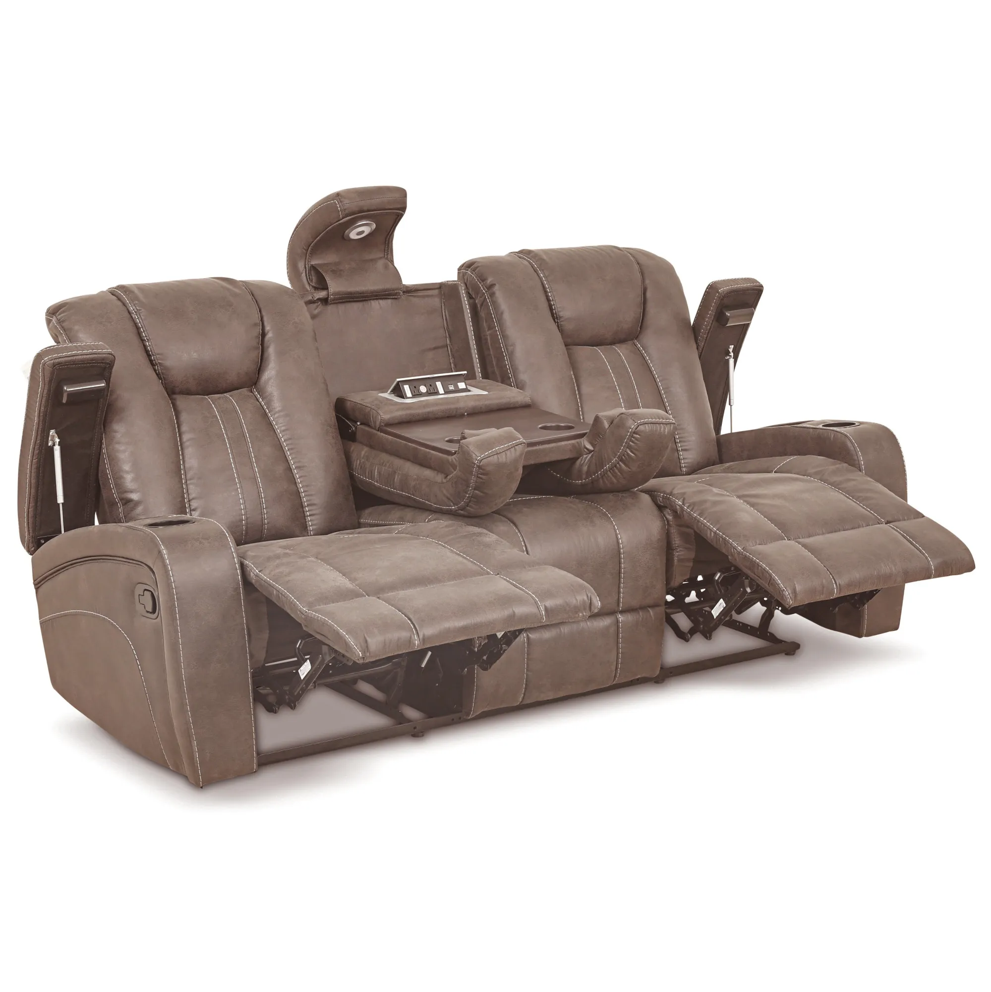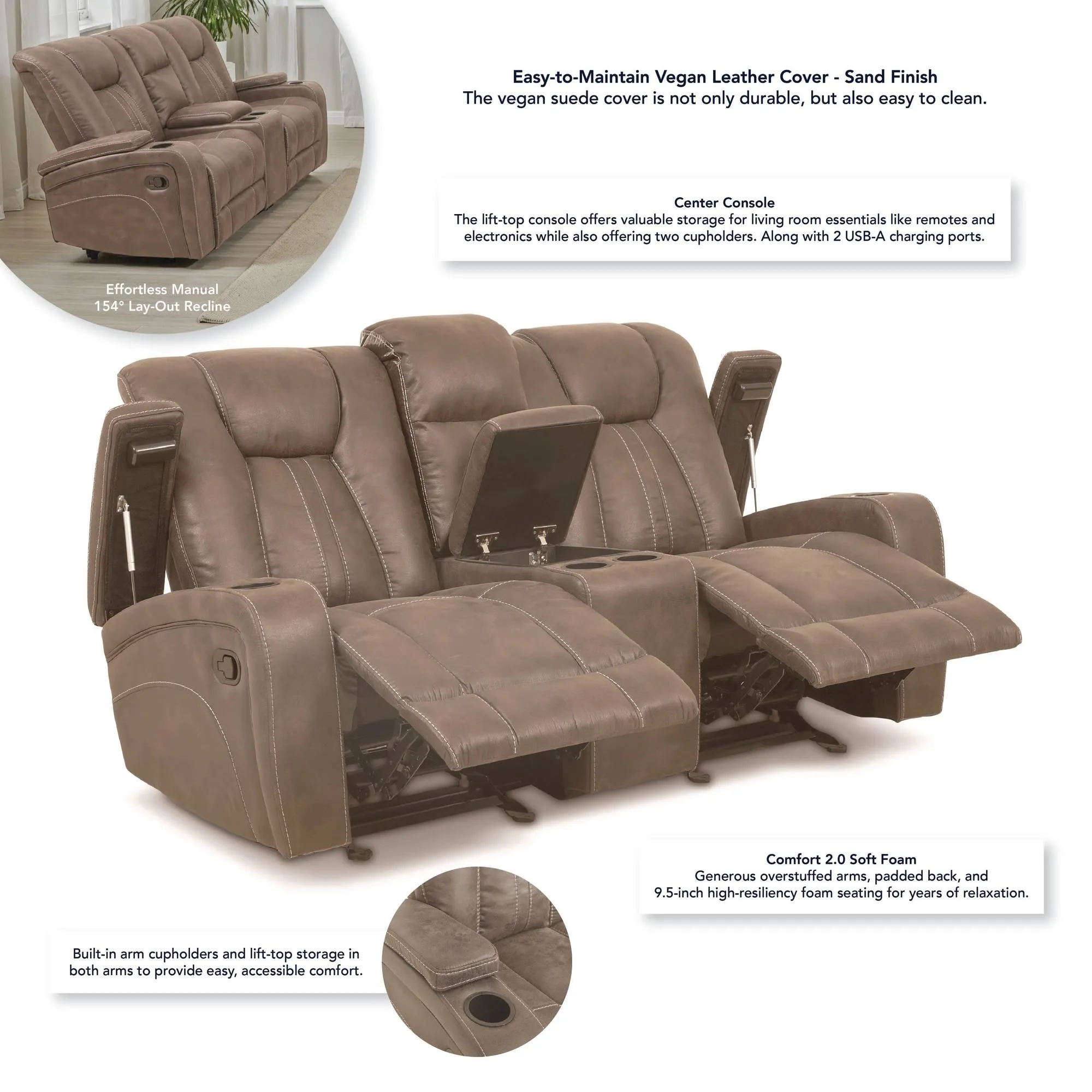 Upgrade your living room command center with the Marlow Manual Console Loveseat. Designed for shared comfort, dual manual recliners let you kick back with ease, while plush cushioning and detailed baseball stitching deliver standout style. The center console features two cupholders (with two more in the arms) and hidden storage—perfect for remotes, electronics, and everyday essentials. Wrapped in soft, easy-care faux suede, the Marlow blends modern design with cozy appeal, creating a central hub for relaxing, entertaining, and everything in between.