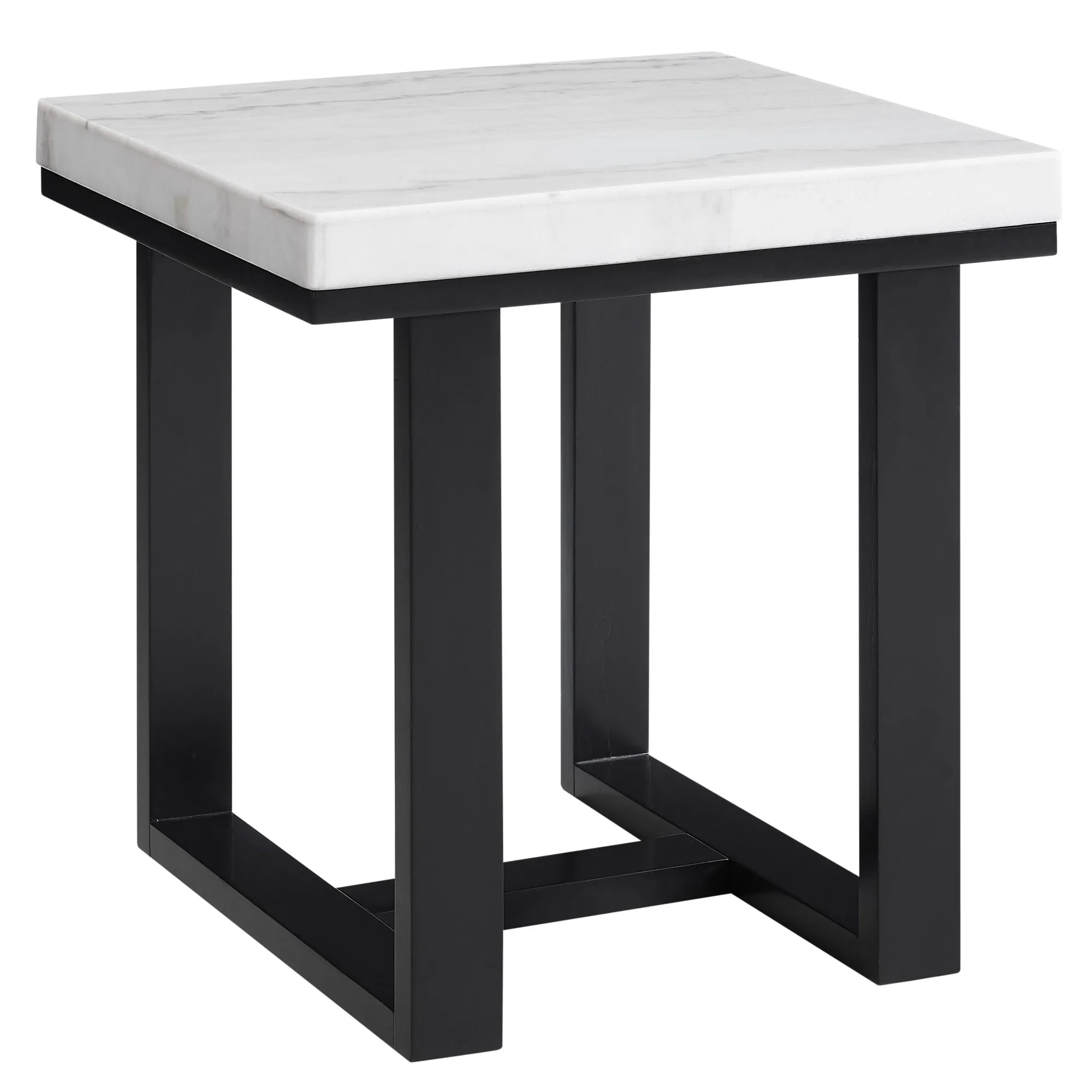 - Styling details include transitional design with wood sled base and marble top