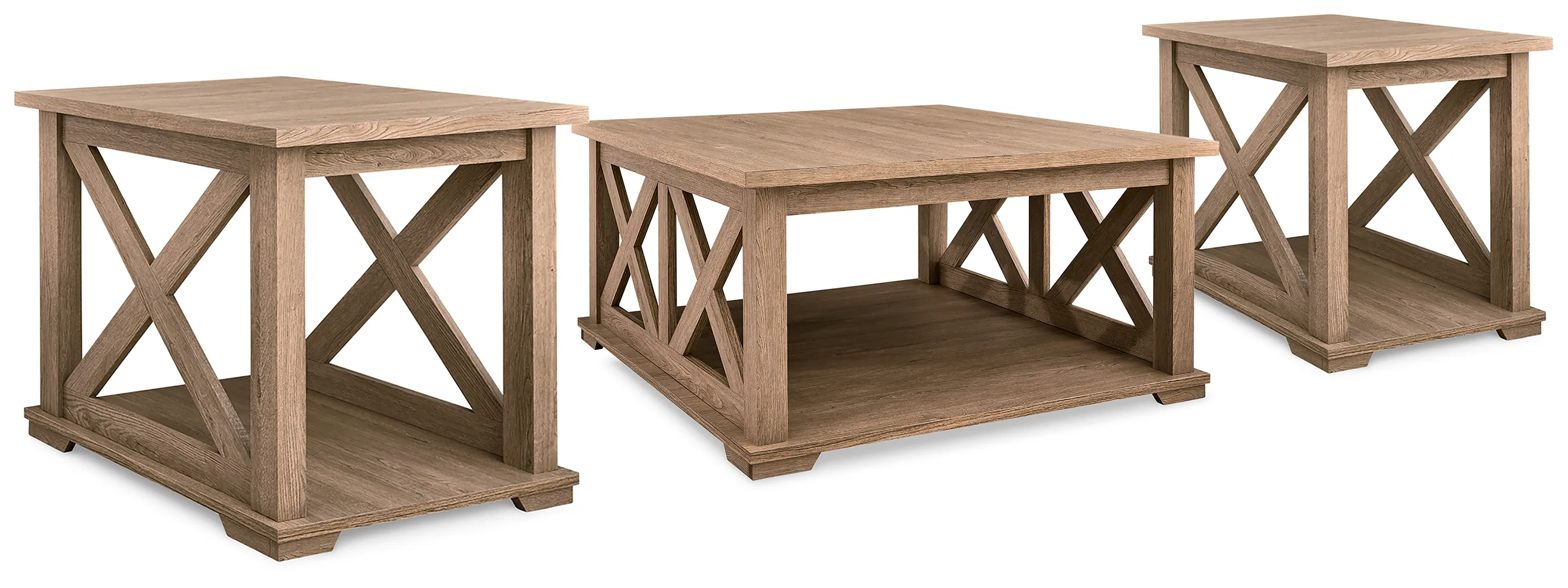 Open the door to modern farmhouse style with this classic square coffee table that features a light natural oak wood grain pattern. The open crossbuck side panel detail and spacious lower shelf add even more rustic appeal. 2 Matching end tables included.
