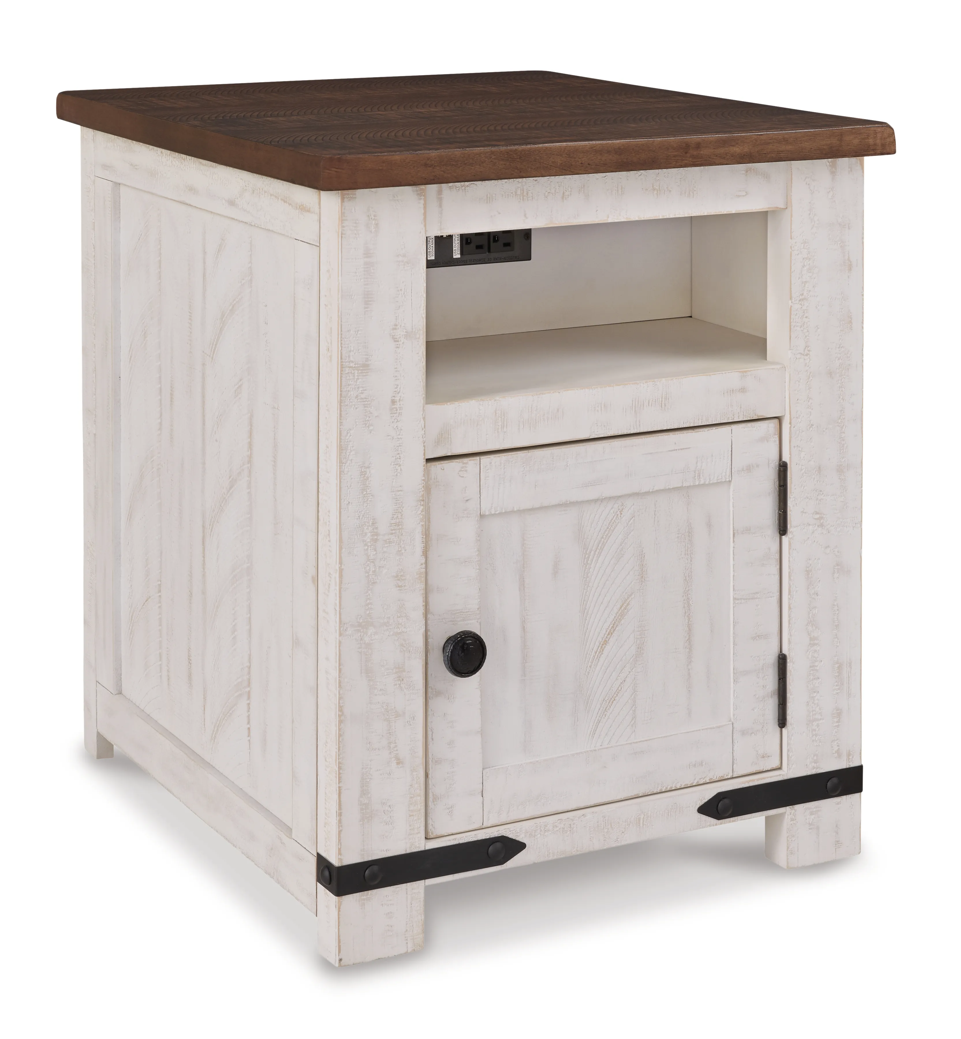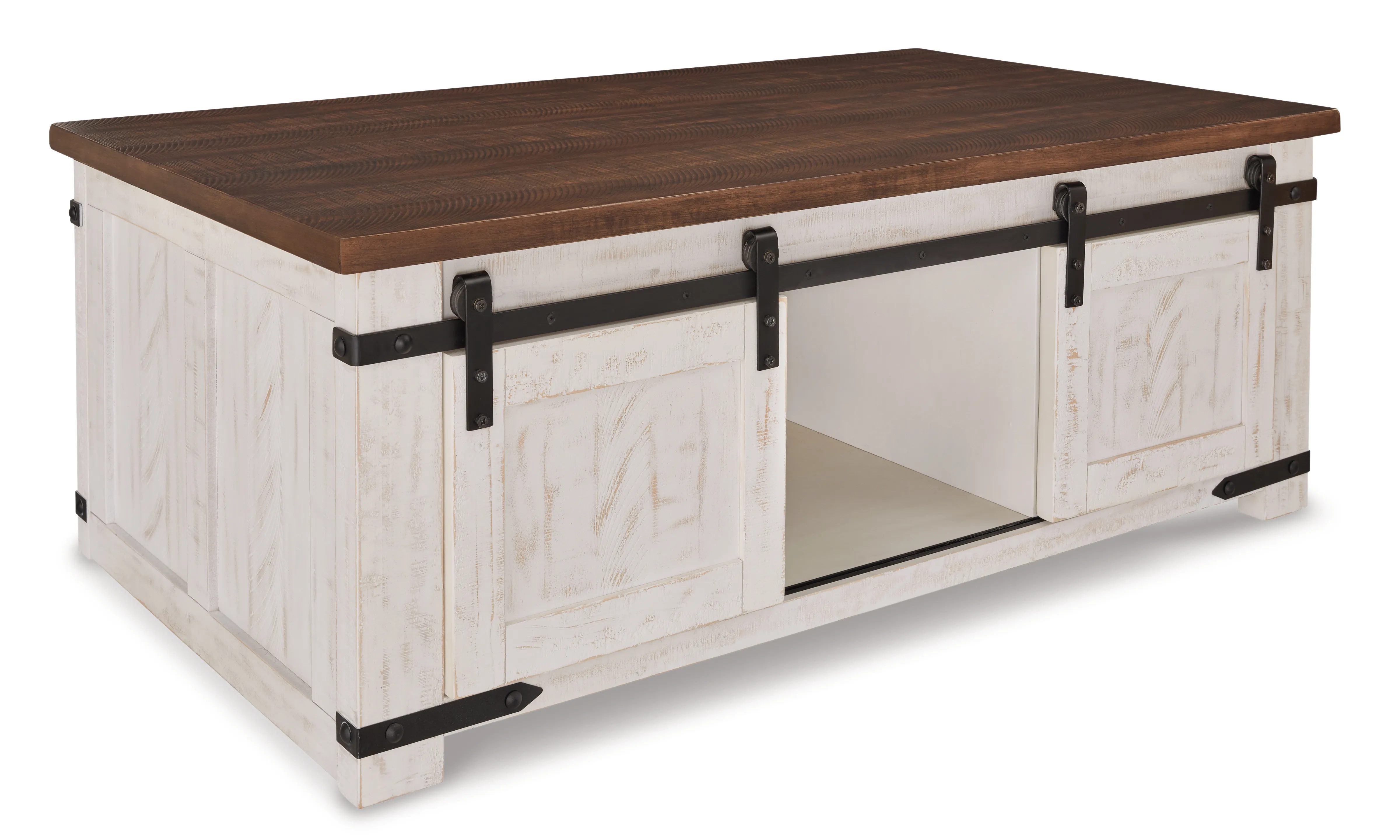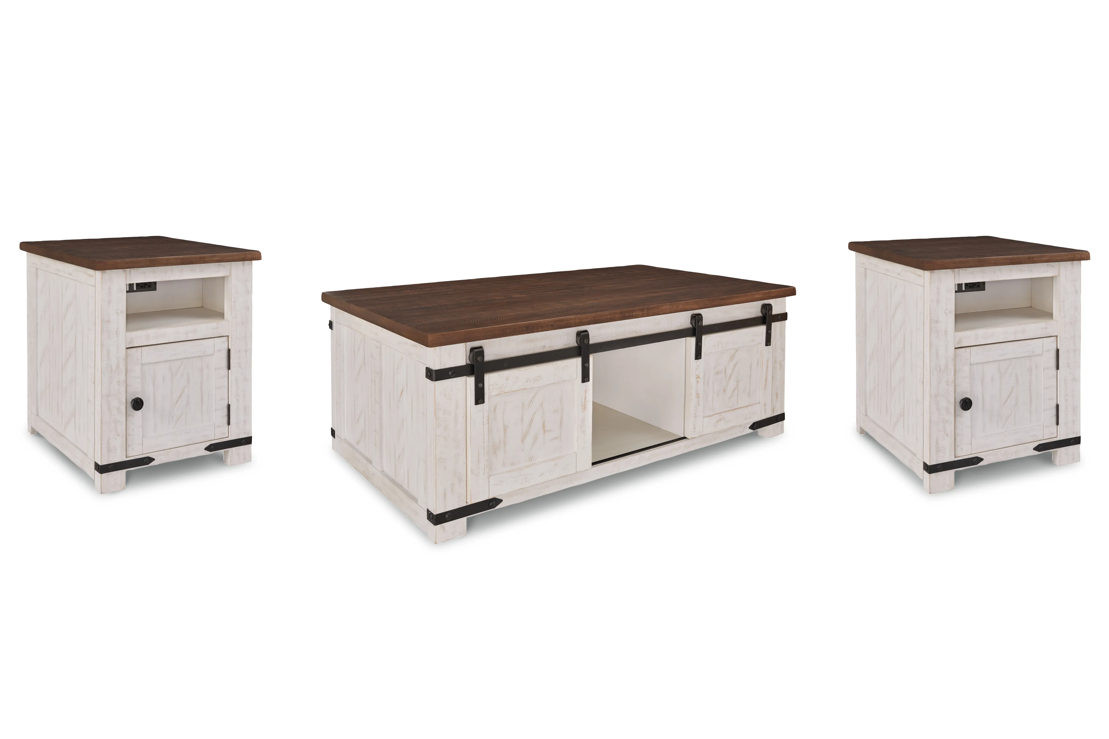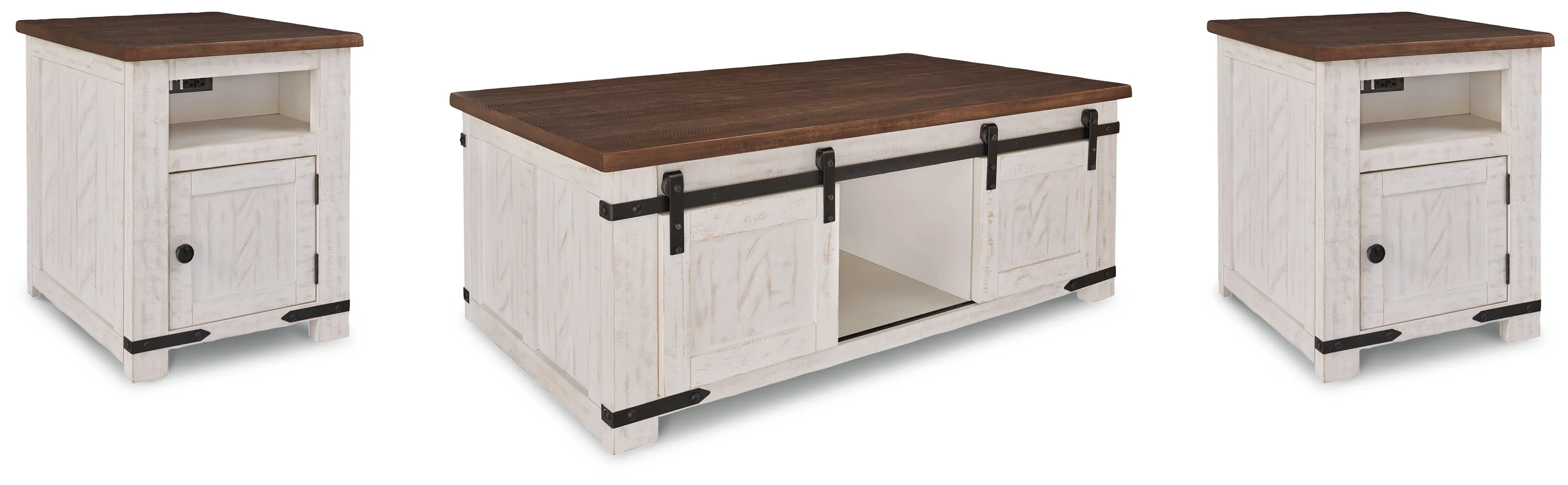 This coffee table with matching pair of end tables is expertly crafted with a distressed vintage white finish and contrasting aged natural pine tabletop. The generously sized coffee table combines a look you'll love with the storage you need. Sliding barn doors on both sides hide easy-access storage cubbies perfect for magazines, throws, board games and more. An open shelf in the middle provides more storage or room for decorative items. This attractive table blends rustic and natural style while lending a unique feel to your home.