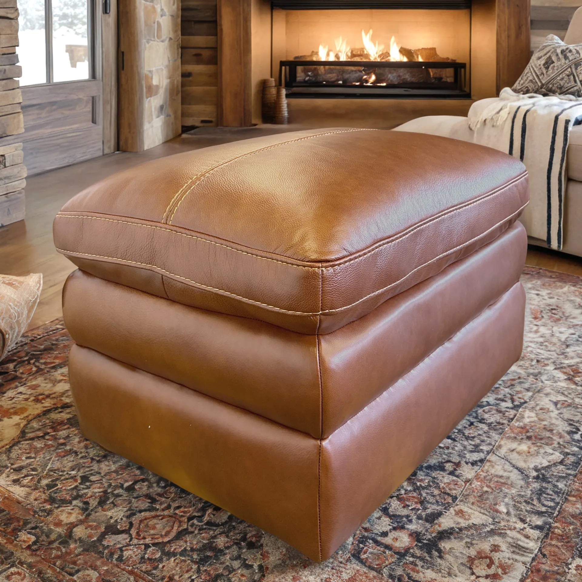Introducing the Futura Berlin Chestnut Leather Ottoman: a compact, elegant accent that complements the Berlin leather sofa and loveseat with seamless cohesion. Upholstered in the same top-grain chestnut leather, it finishes the seating ensemble with refined presence—and thoughtful function.