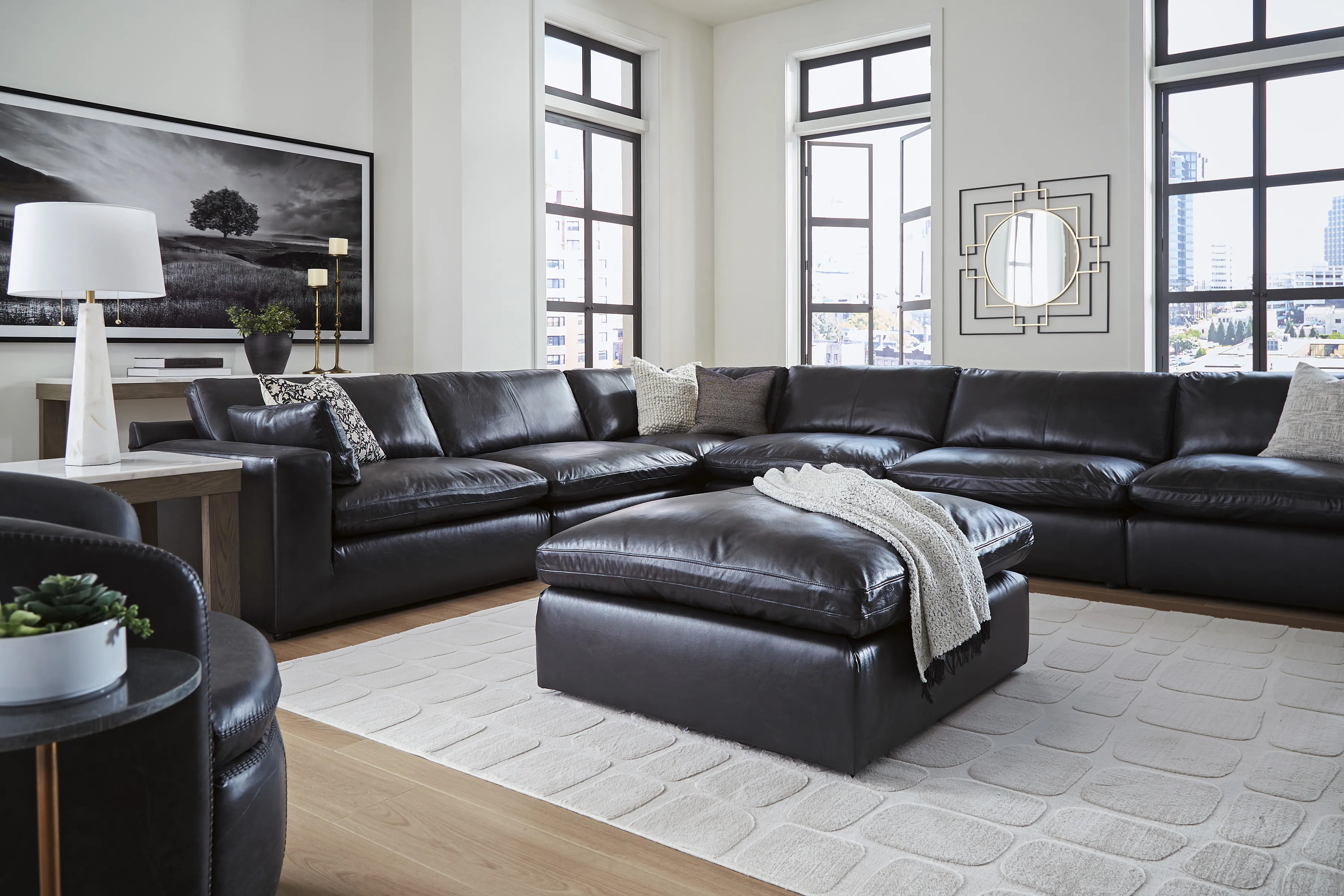 The Signature Design by Ashley® Emilia Oversized Accent Ottoman features a bold contemporary design, plush feather-fiber cushioning, and rich leather match upholstery. Available in brown or black, this oversized ottoman delivers modern style, versatile function, and affordable luxury—perfect as a footrest, extra seating, or accent piece in contemporary living rooms.