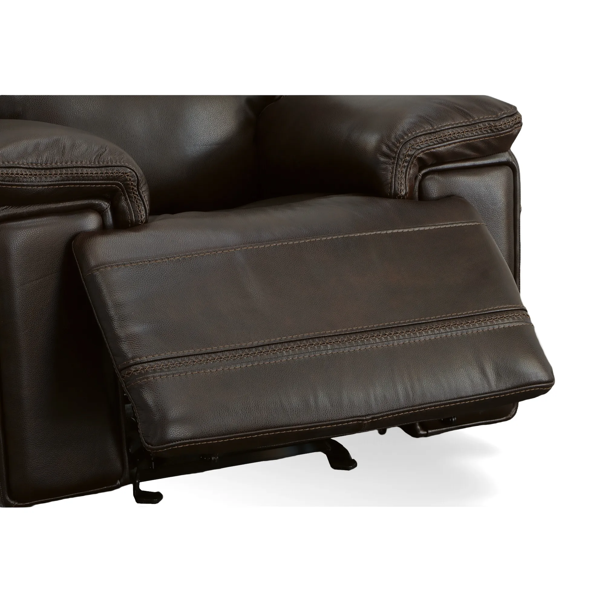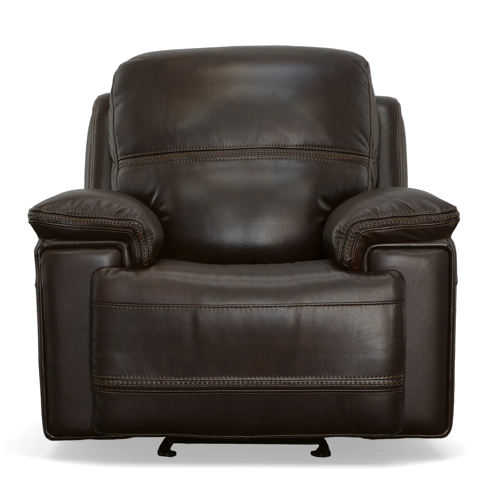 The Fenwick Leather Power Gliding Recliner with Power Headrest delivers smooth motion, refined styling, and long-lasting comfort in a compact, versatile design. Upholstered in rich Dark Brown quality leather, it showcases bold heavy-thread cross-stitching, squared arms with padded overlays, and deep, contoured cushions that support you from head to toe. With the ability to gently glide or fully recline at the touch of a button—and an independently adjustable power headrest—Fenwick blends modern functionality with everyday relaxation.