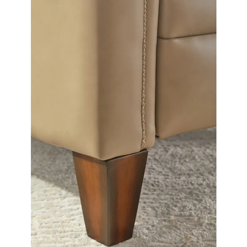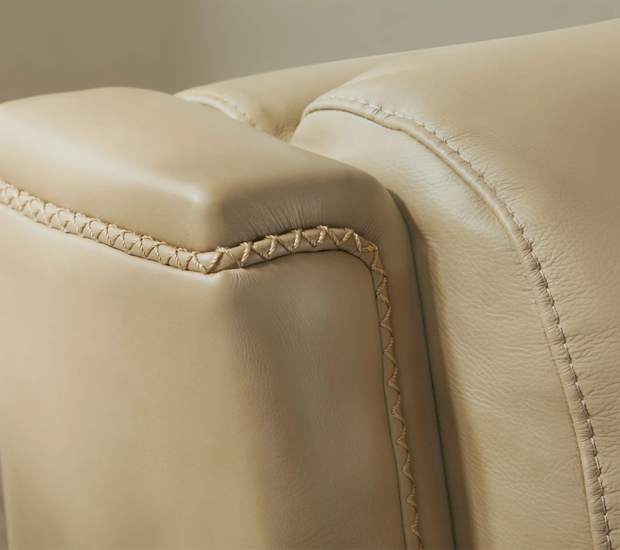 Connor offers comfort and style with its power recline and adjustable headrest. Upholstered in soft leather, Connor features decorative baseball stitching and a high-leg design in warm walnut wood. The hidden extension footrest adds practicality, while FreeMotion® technology combines modern ease with elegant design, fitting perfectly in any home.