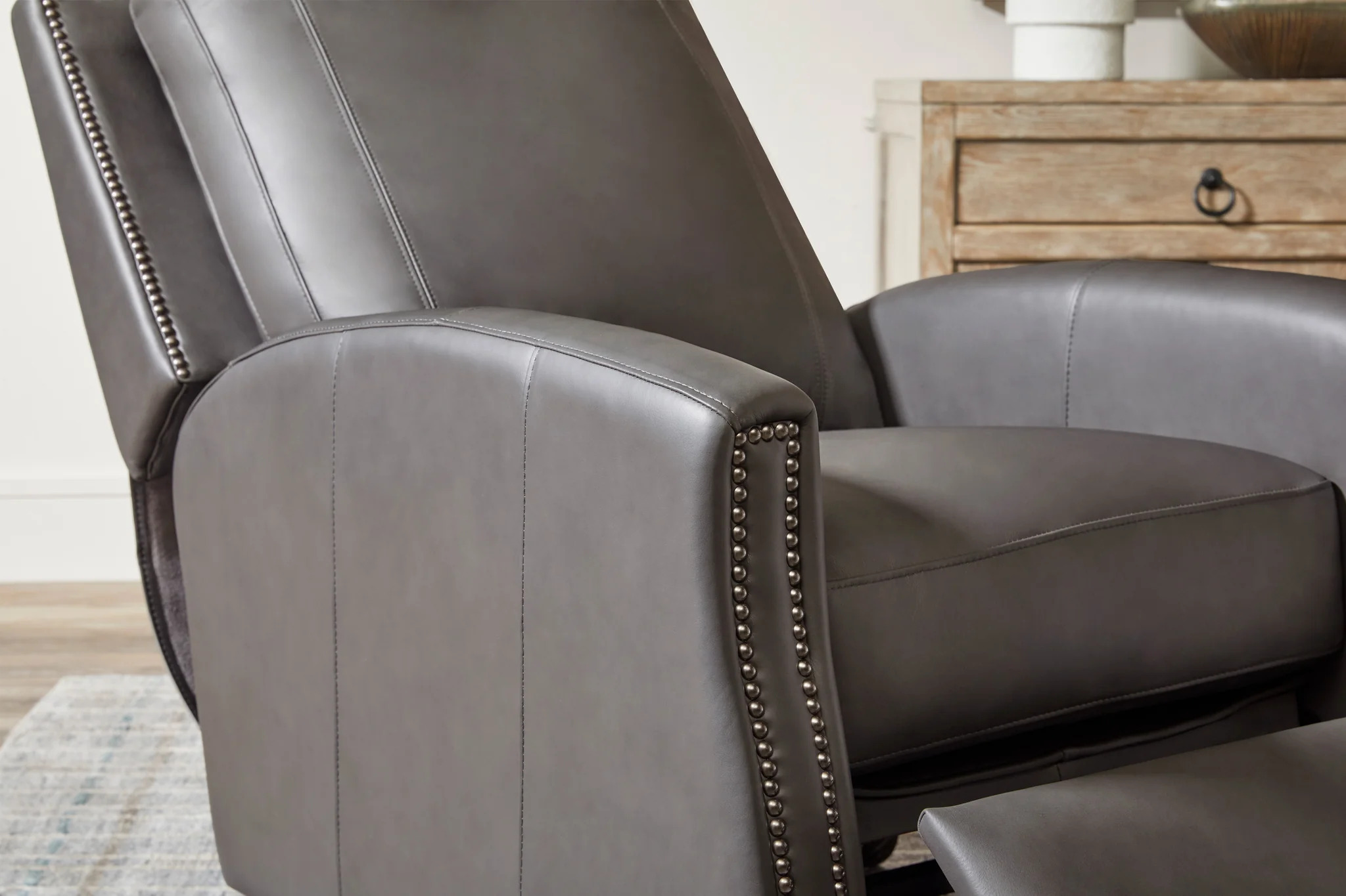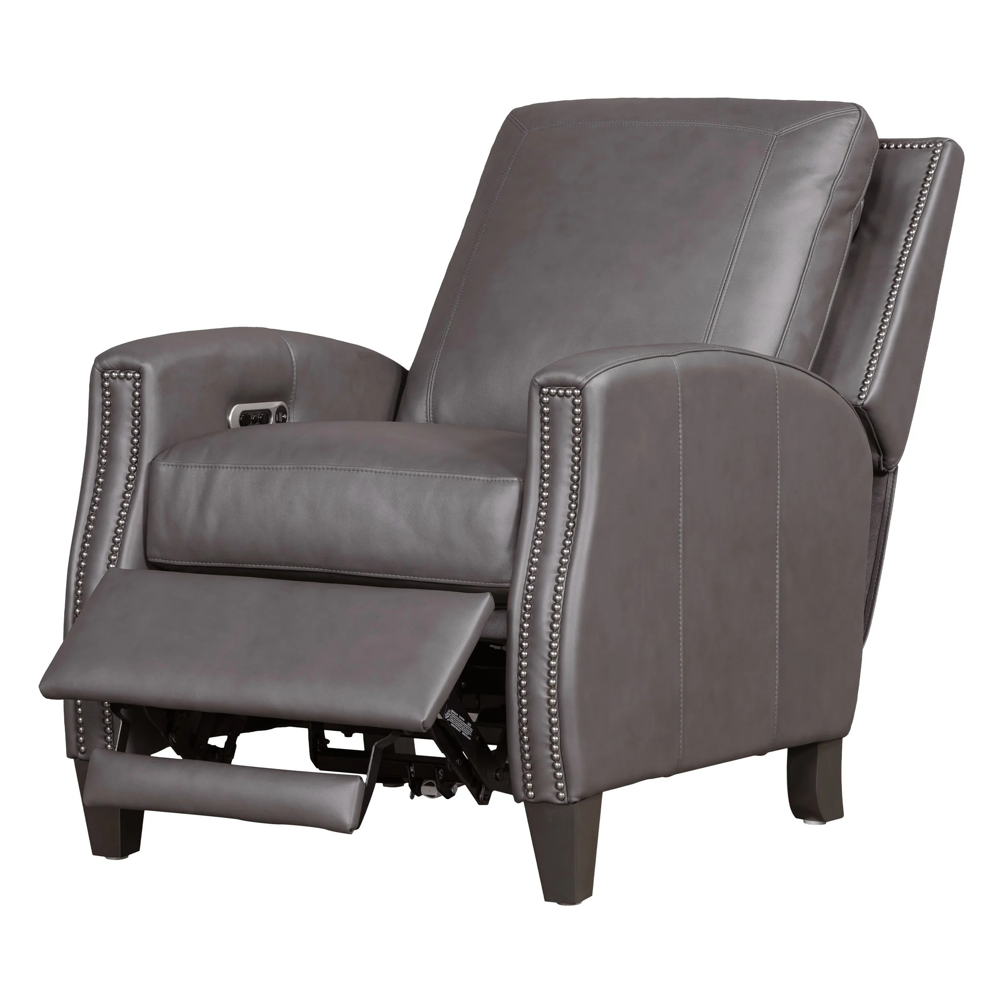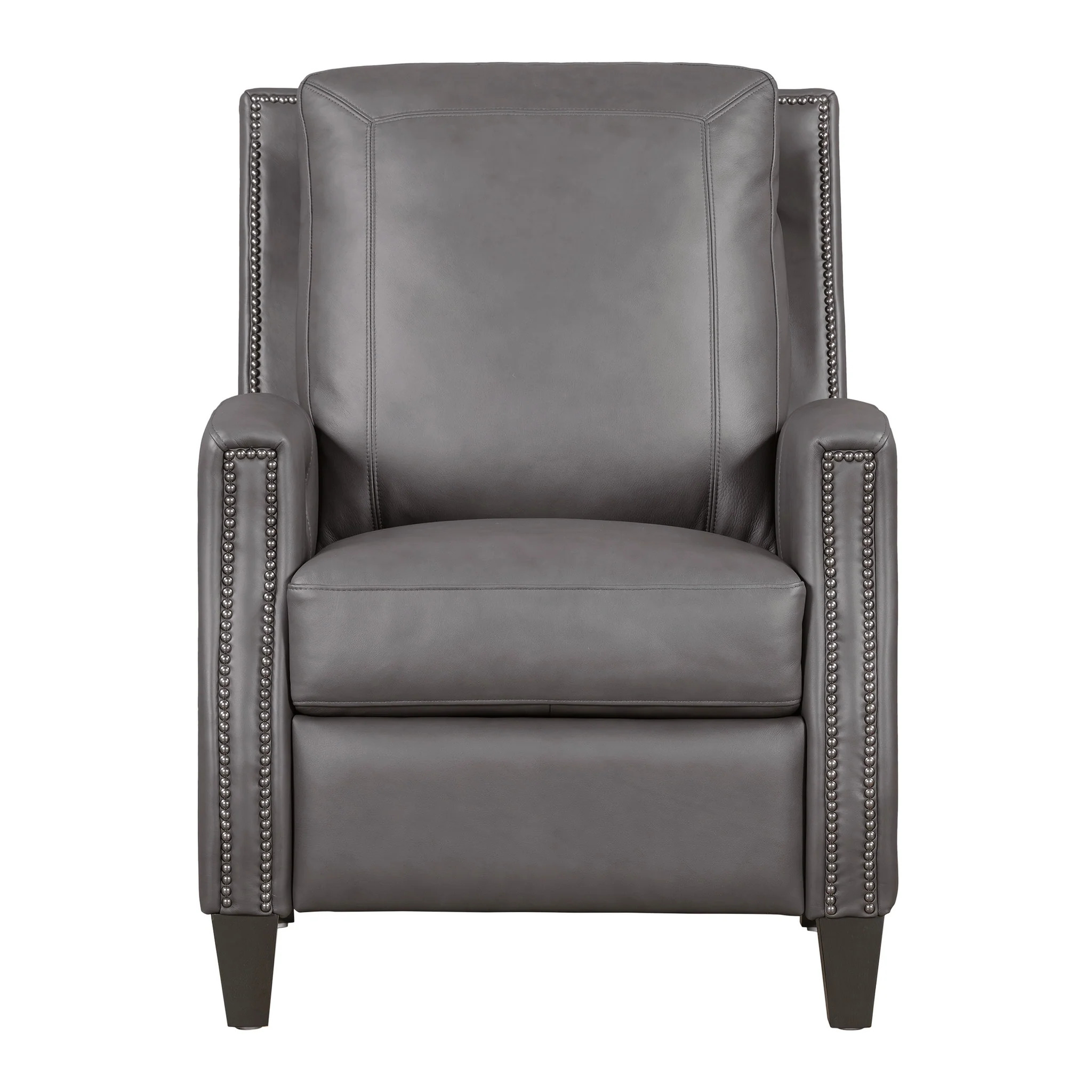 Designed with a square back and plush padding, the Hunter provides exceptional support, complemented by bronze nailhead detailing that adds an element of traditional elegance. The high-leg silhouette offers the look of a stationary accent chair, enhanced by sleek lines and meticulous tailoring. Whether in Echo Grey for a modern statement or Chestnut Charm for a warm, inviting tone, the Hunter recliner elevates comfort and sophistication in any setting.