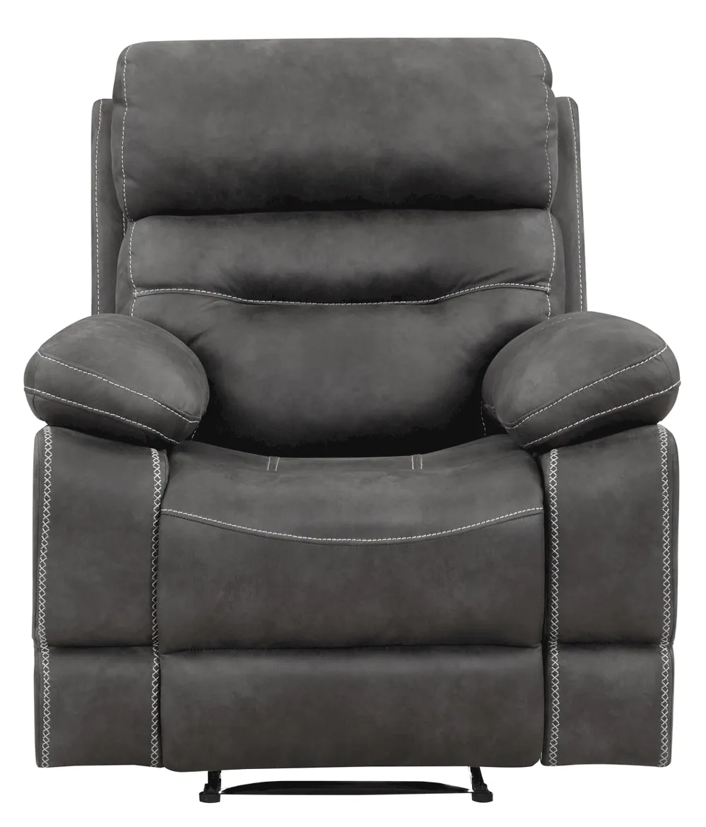 Ultimate relaxation awaits with the Rudger manual recliner. Sit back and relax in the pillow comfort of fiber wrapped foam encased in a rustic, faded microsuede that is as comforting as an old bomber jacket. An effortless pull of a lever sends you into maximum comfort as you sit back and enjoy the show!