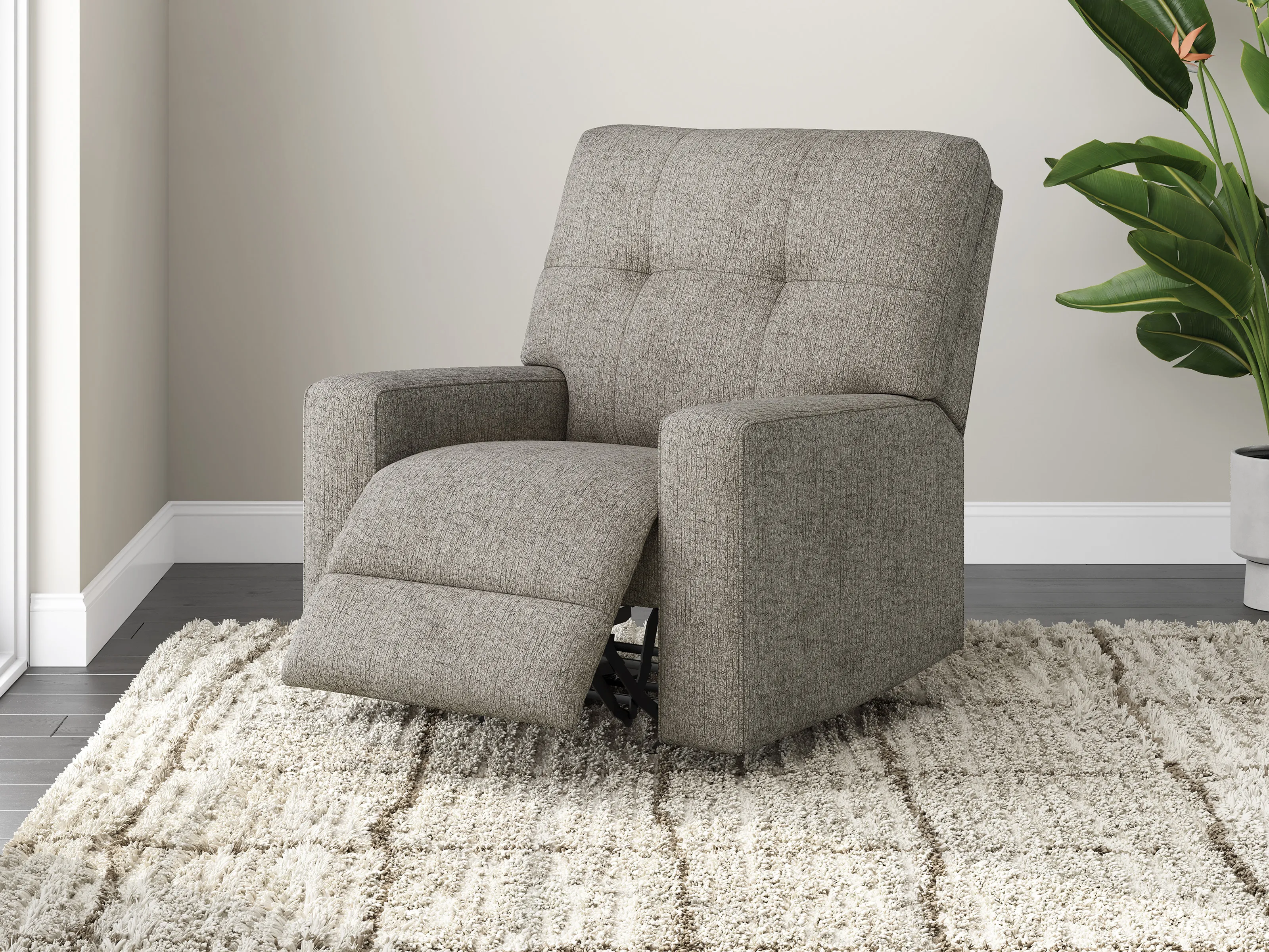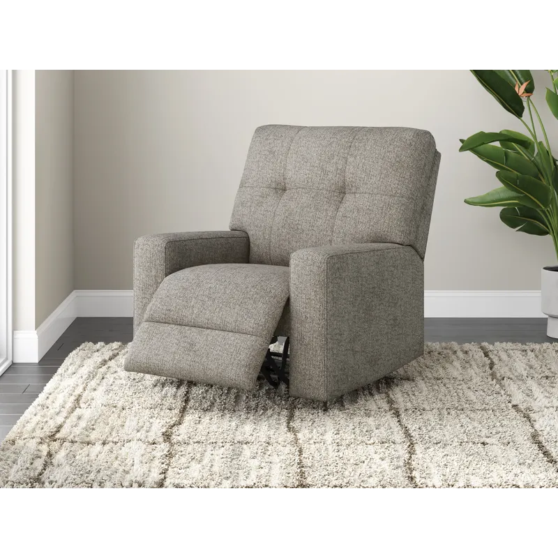Sincere in its styling, this recliner marries classic function with modern design elements for truly transitional appeal. Its track arms lend a contemporary vibe, while easy pull tab reclining ups the comfort level. And with the recliner's goes-with-anything neutral upholstery, styling is made simple. All that’s left for you to do is sit back and relax.