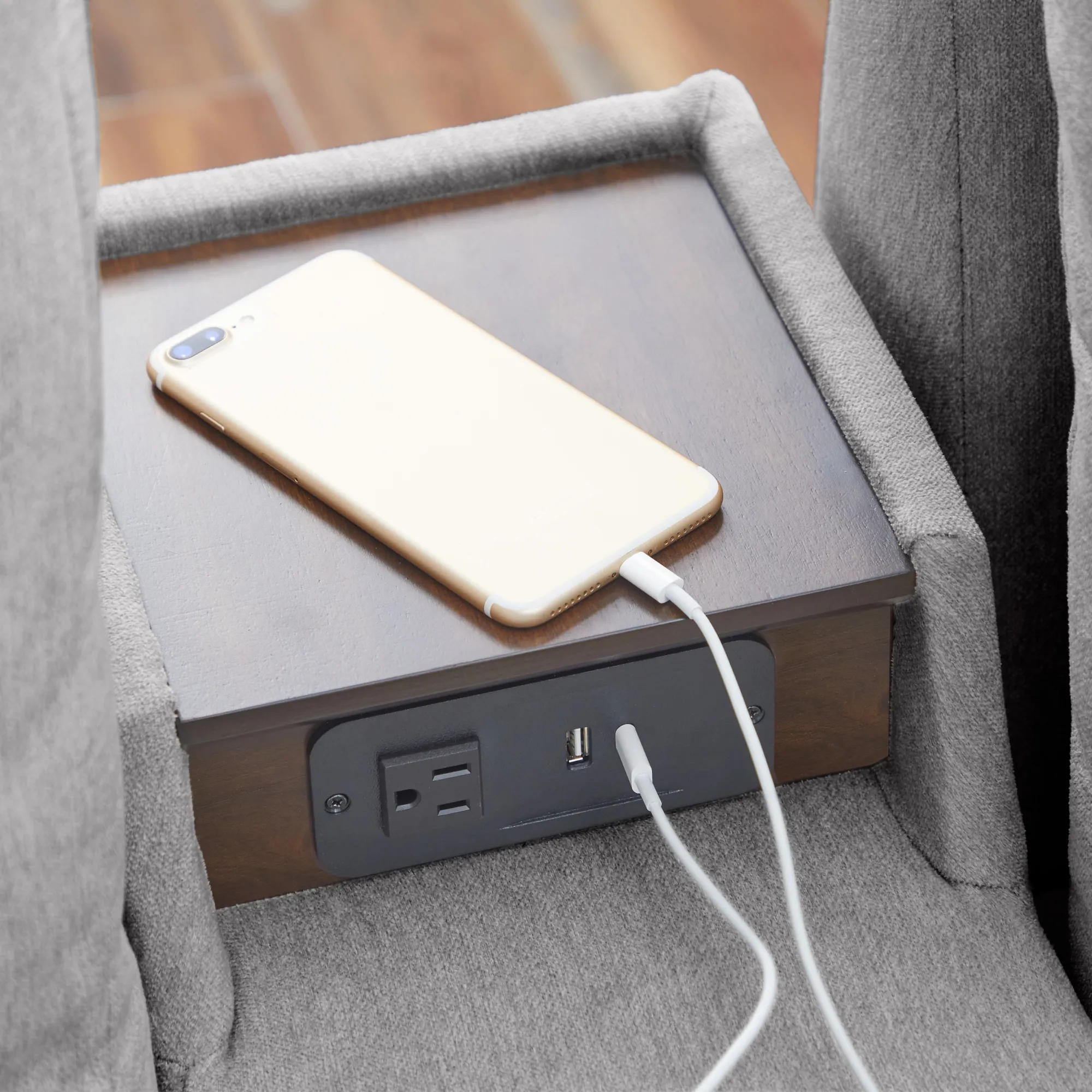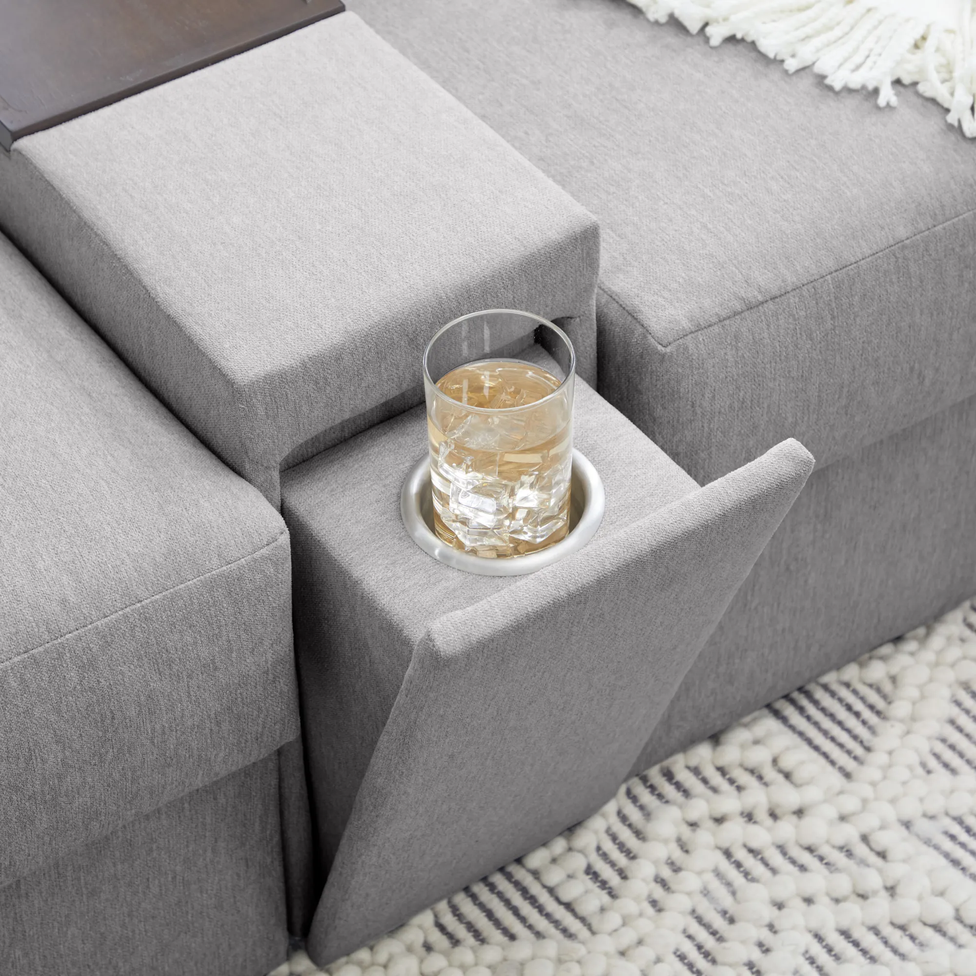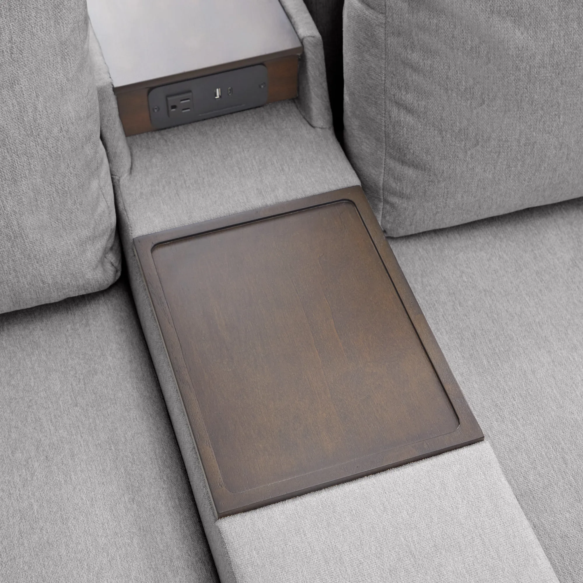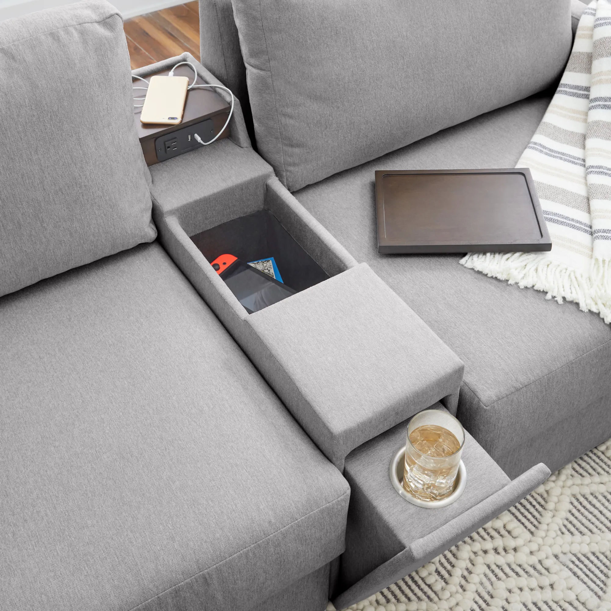 Evolve your Flex modular seating system with the Flex narrow hub. Designed with family functionality in mind, this hub provides easy and clean storage. The main compartment fits belongings under the removable wood tray. A pop-out cupholder provides a spot for a drink while the upper tray keeps electronics powered up. Upholstered in sustainable, stain-resistant performance fabric that is easy to clean. Attaches to any Flex seat in seconds with a C-Clip.