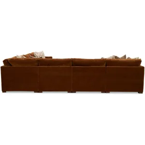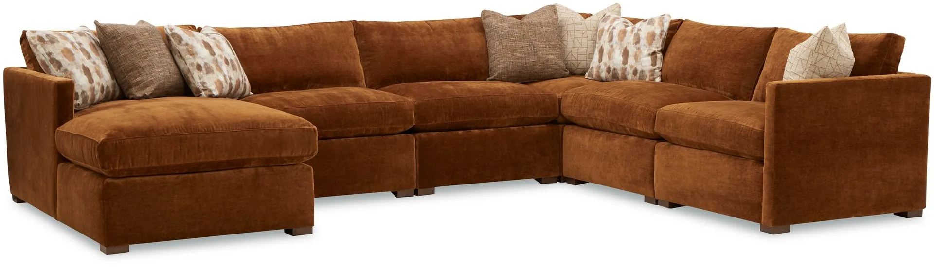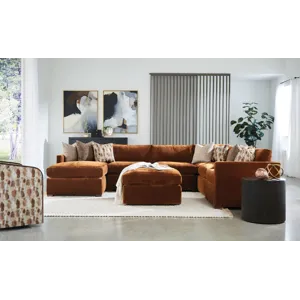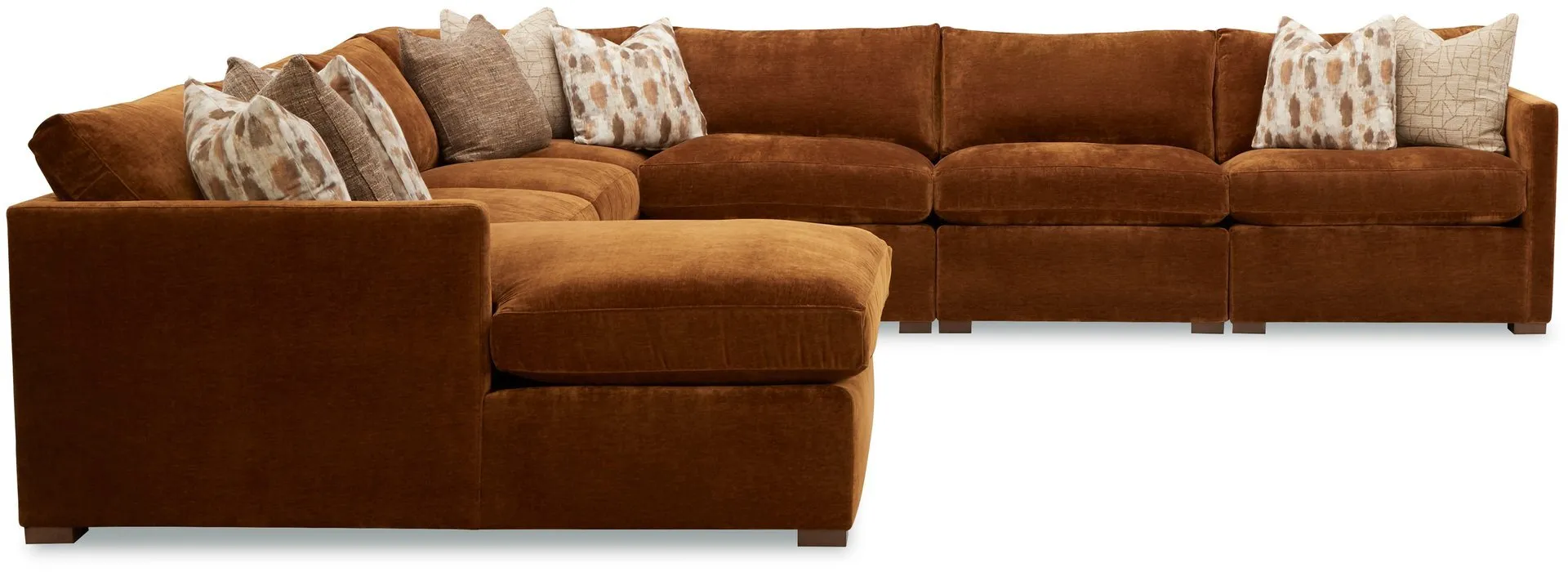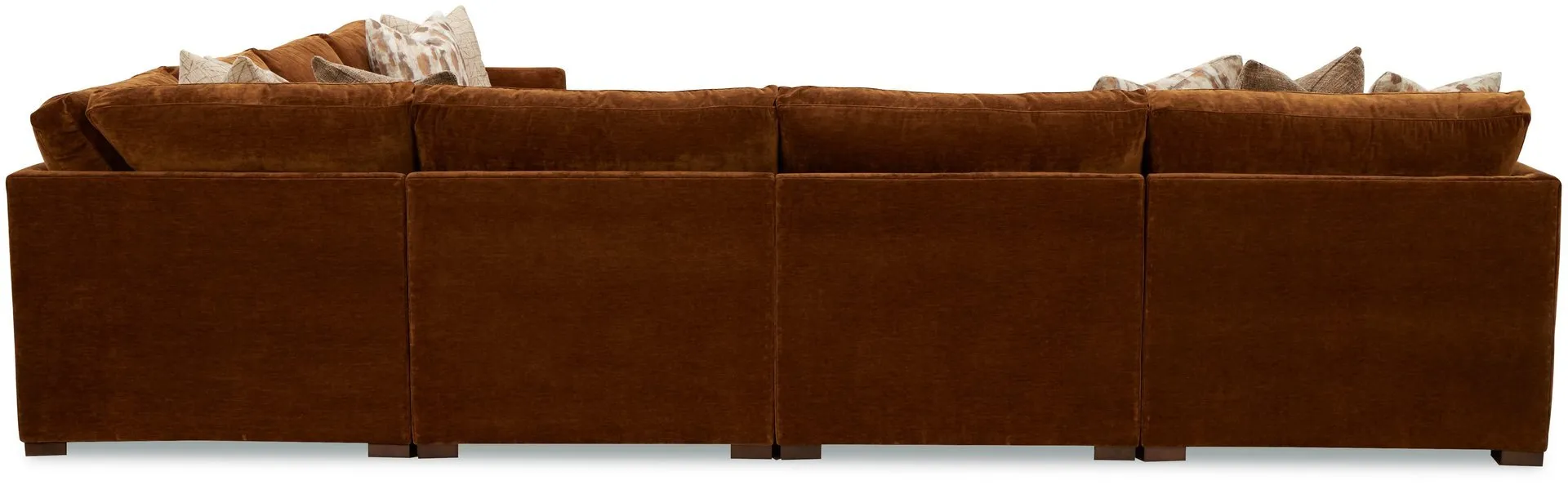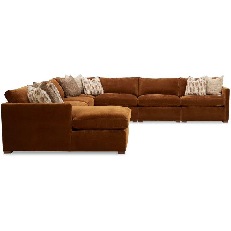 Designed for ultimate versatility and comfort, this modular sectional features clean track arms, French seaming, and low block legs for a modern, tailored look. Loose box border backs and our Super Soft seating package—featuring luxuriously soft seats, backs, and toss pillows—invite you to relax in style. Every piece is fully finished on all sides, allowing it to stand beautifully on its own or connect seamlessly with others. A wide-width chaise adds an extra layer of lounge-worthy comfort. A matching bumper ottoman with casters (style 751001SS, sold separately) can be used as a cocktail ottoman or can be pushed up to the sectional for a perfect fit.Â