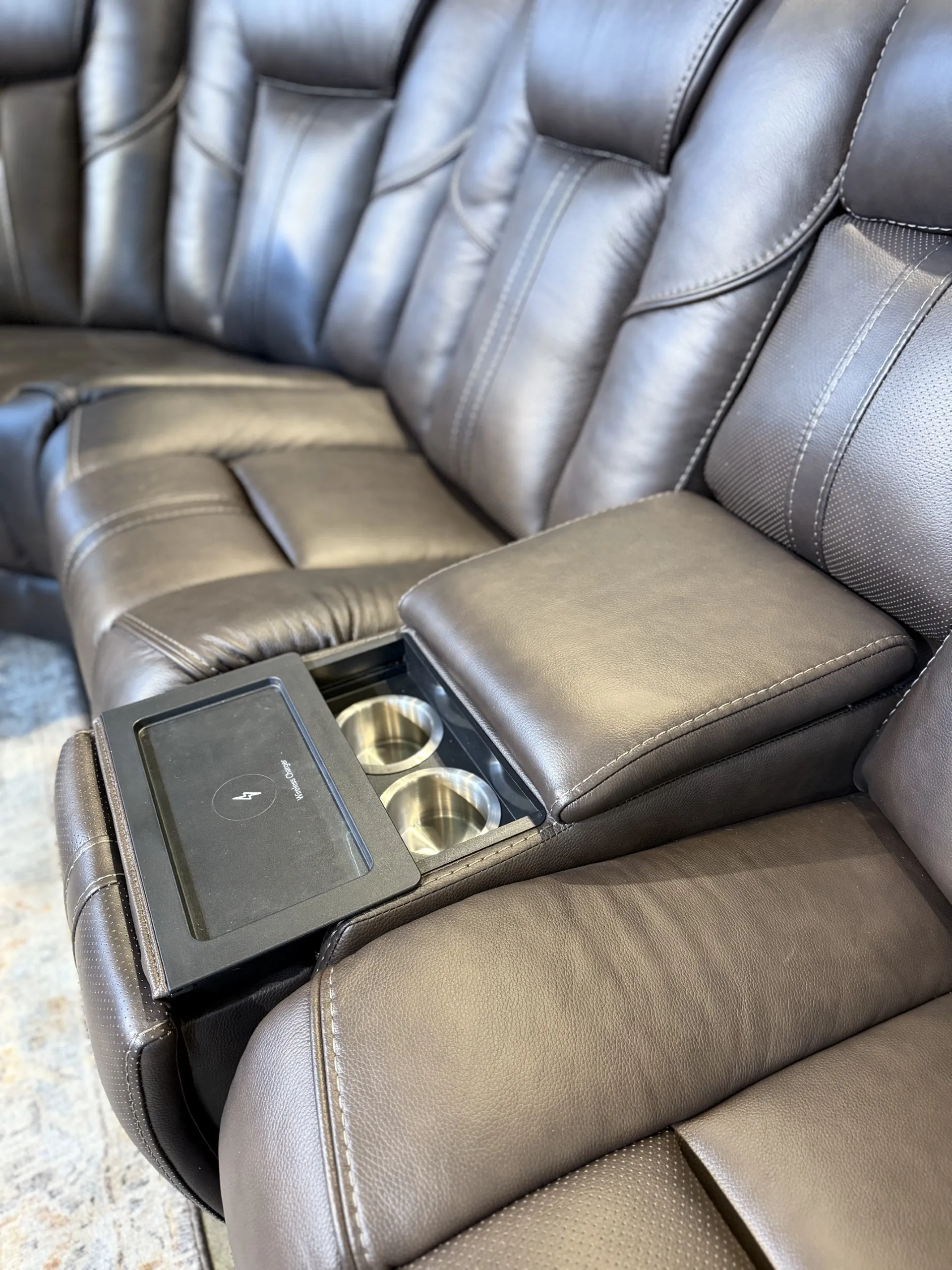 Experience next-level comfort and technology with the MotoMotion Daniel Immersive 7-Piece Power Reclining Sectional in Black Leather. Designed to redefine modern living and home entertainment, this luxurious sectional blends elegant styling with advanced functionality. Each seat offers Triple Power motion for customized headrest, lumbar, and footrest support, while integrated Bluetooth audio delivers an immersive sound experience straight from your sofa. With premium leather upholstery, smart storage consoles, and wireless charging, the Daniel sectional turns any space into a high-tech, high-comfort retreat.