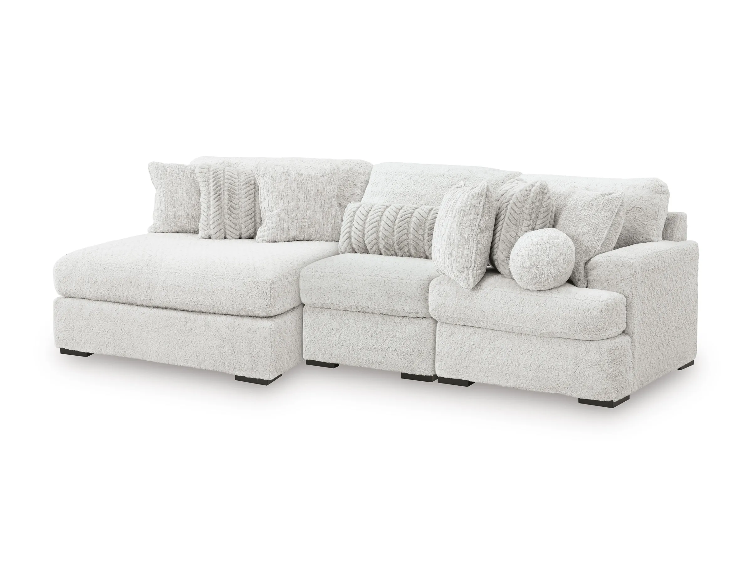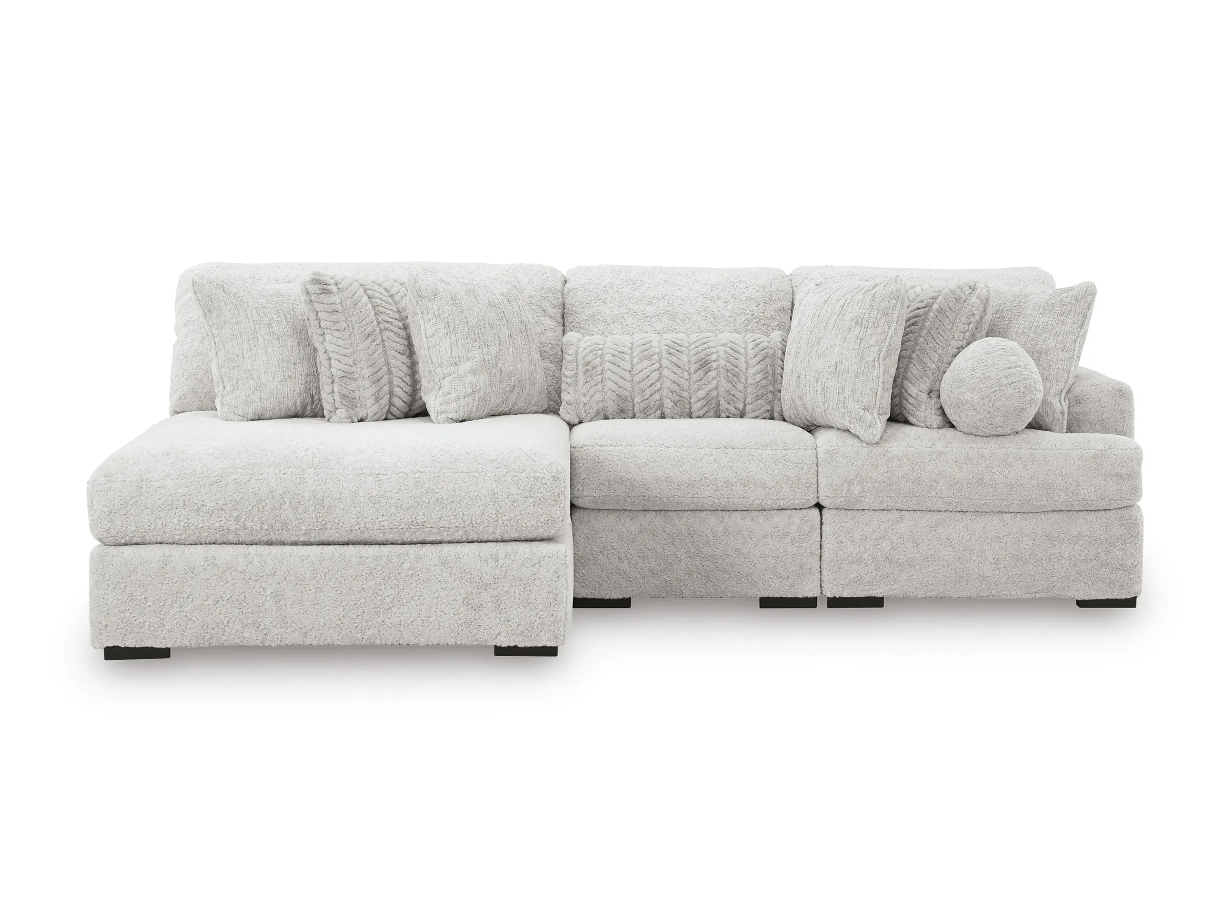 The Snodoodle 3-Piece Sectional with Left-Arm Facing Chaise delivers ultimate comfort with a modern, modular design. Upholstered in ultra-soft fabric, this spacious sectional invites you to stretch out, snuggle in, or gather with loved ones. Its oversized chaise on the right side is perfect for lounging, while the deep cushions and included pillows provide cozy support in all the right places. Designed to adapt to your lifestyle, the modular pieces can float anywhere in the room for a flexible, family-friendly setup.