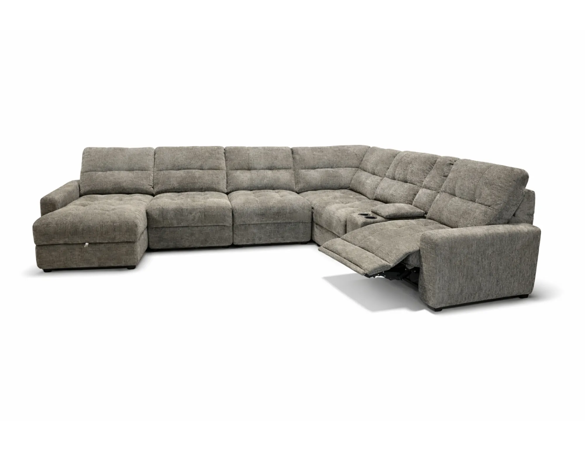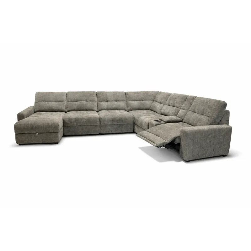 7 PC Sectional - Stone includes right arm facing power recliner armless chair, armless slider, corner, console, & left arm facing storage chaise.