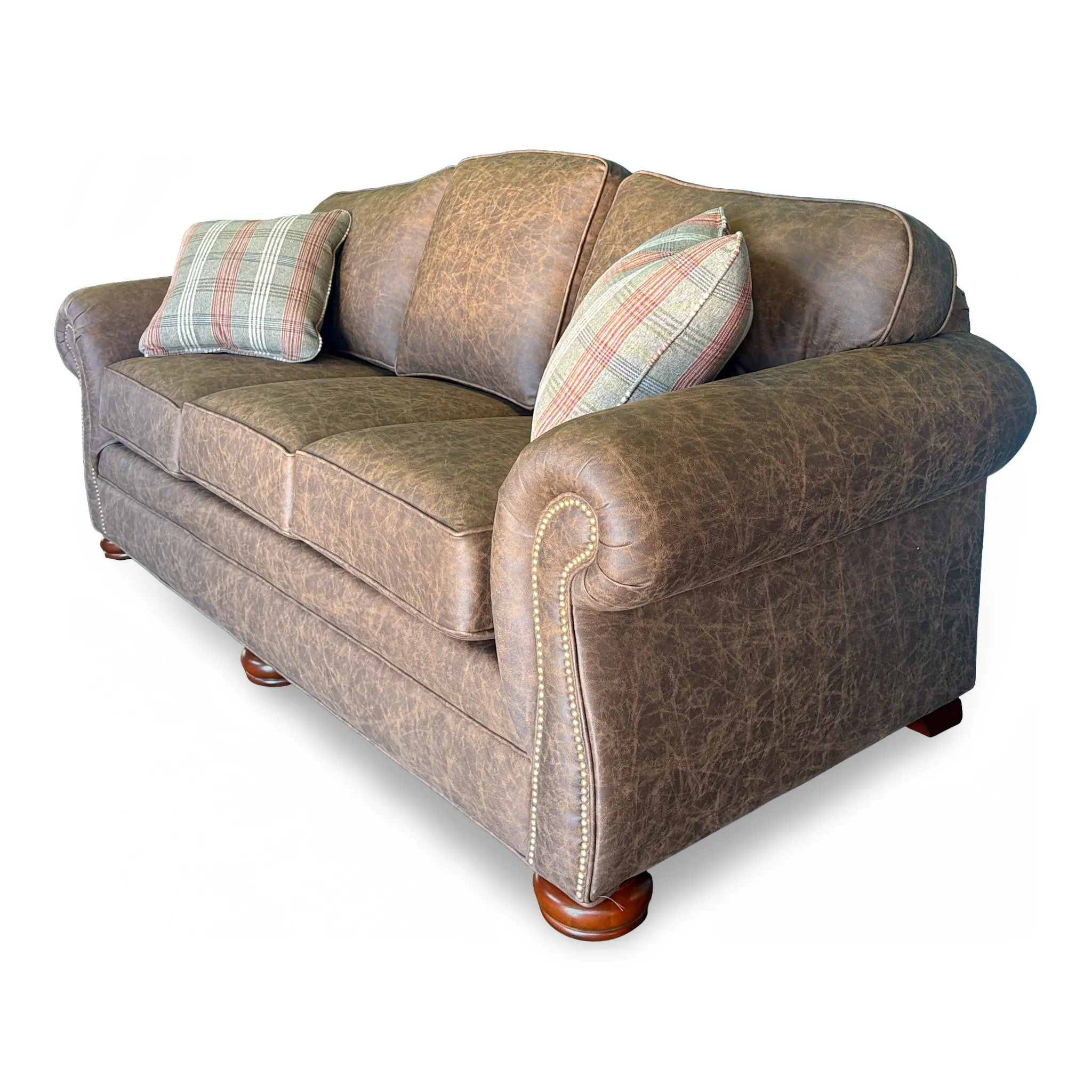 The Craftmaster Essentials Sofa in Bozeman 08 faux leather is a timeless statement piece that balances refined design with everyday comfort. Its graceful camel back and Bombay-shaped arms are enhanced by brass nailhead trim, lending sophistication and detail to the silhouette. Plush attached back cushions ensure lasting support with low maintenance, while casual bun feet ground the design in traditional charm. Versatile and inviting, this sofa is the perfect centerpiece for both classic and transitional living spaces.
