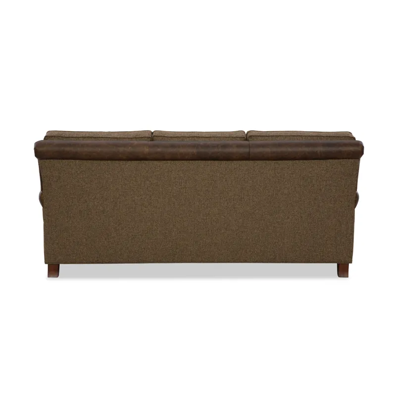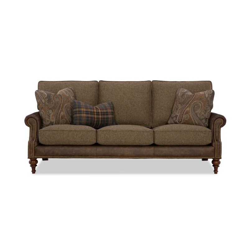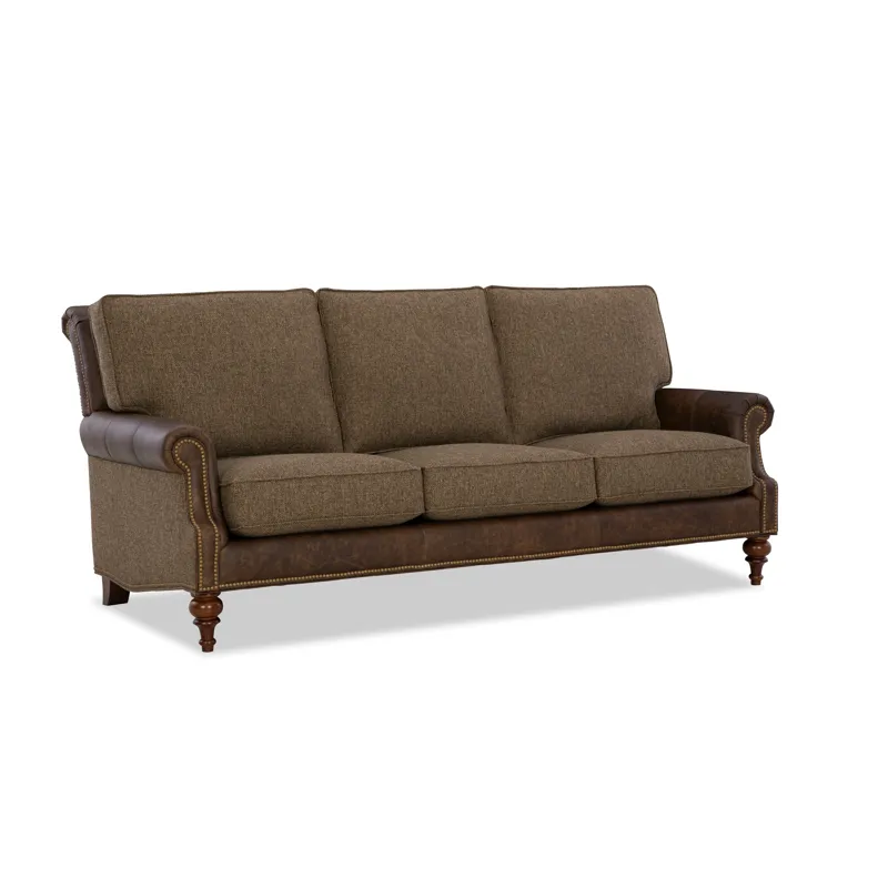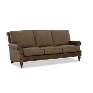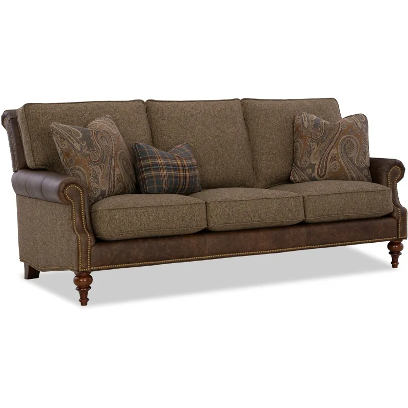Classic traditional details and nail head trim accents are some of the things you'll love on this gracefully finessed sofa. Covered in both leather and fabric, it has a unique blended look that can be fully customized with any fabric and leather in our line. It features a rollover back, cut-back rolled arms, and beautifully turned legs that offer a familiar heirloom touch.